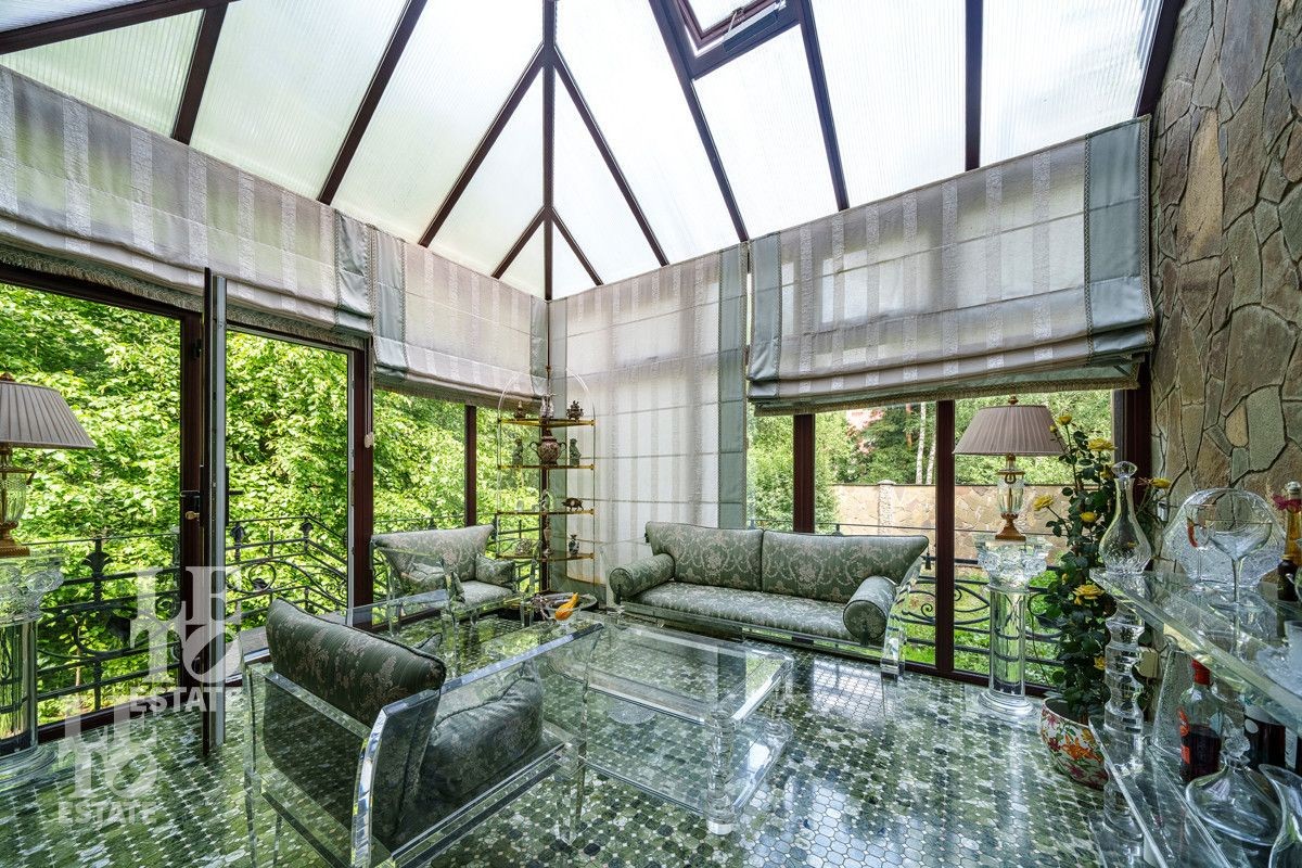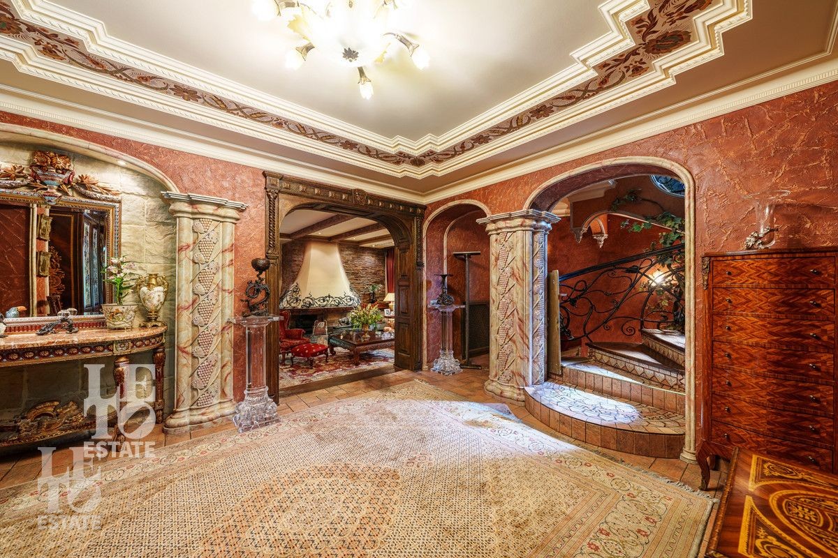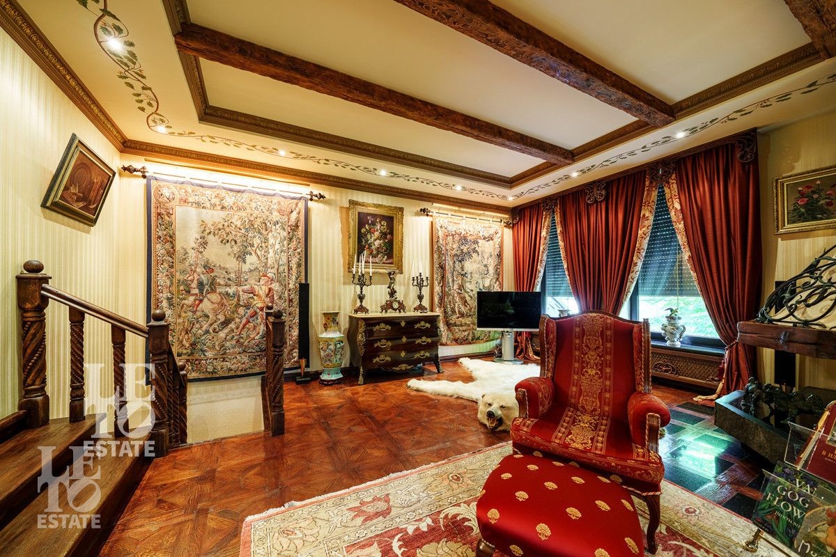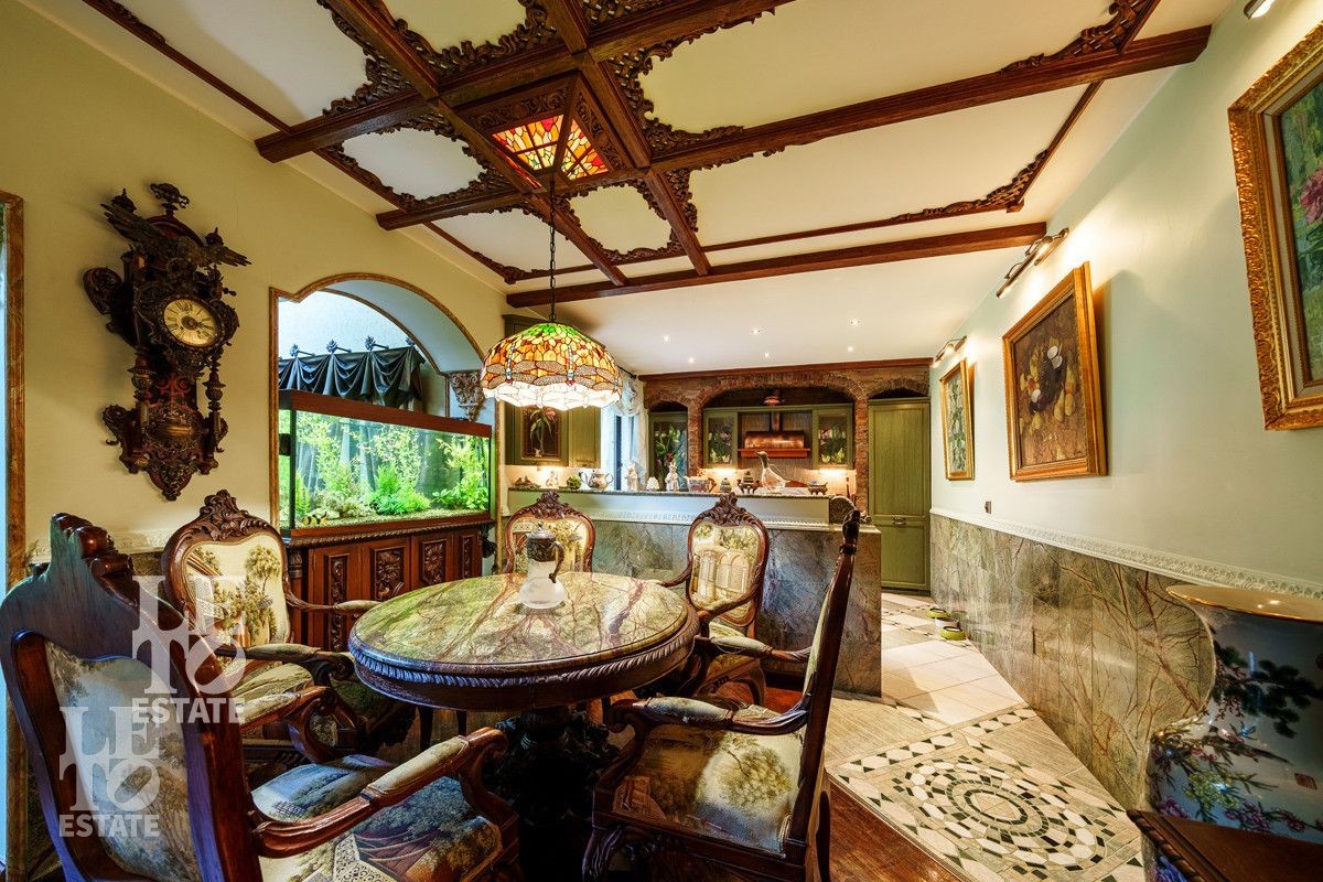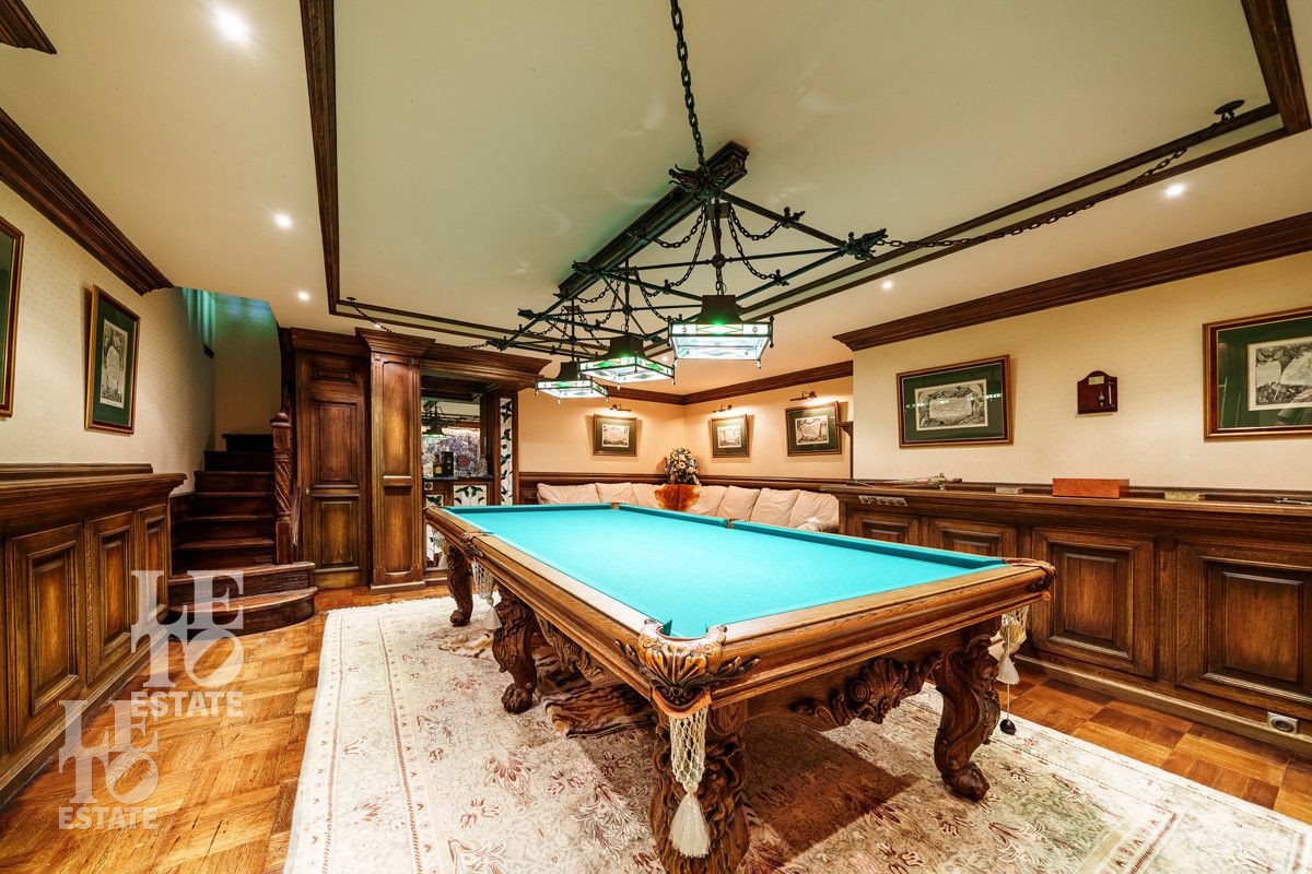 Интерьер дома выполнен из качественных дорогостоящих материалов. Планировка дома продумана до мелочей: холл с гардеробом, просторная гостиная с камином, столовая со вторым светом, веранда с акриловой мебелью из Италии и поликарбонатной крышей приглашают насладиться красотой прилегающего сада. Кухня оборудована мебелью Scavolini, техникой Bosch. В цоколе расположена бильярдная, где можно насладиться игрой на 12-футовом столе для русского бильярда. Мебель Nierri, гобелены ручной работы, ковры Pishavar и витражи создают атмосферу утонченности и комфорта.