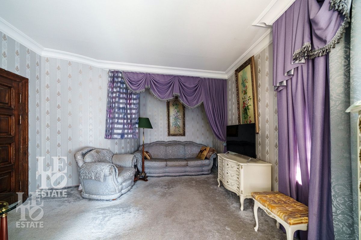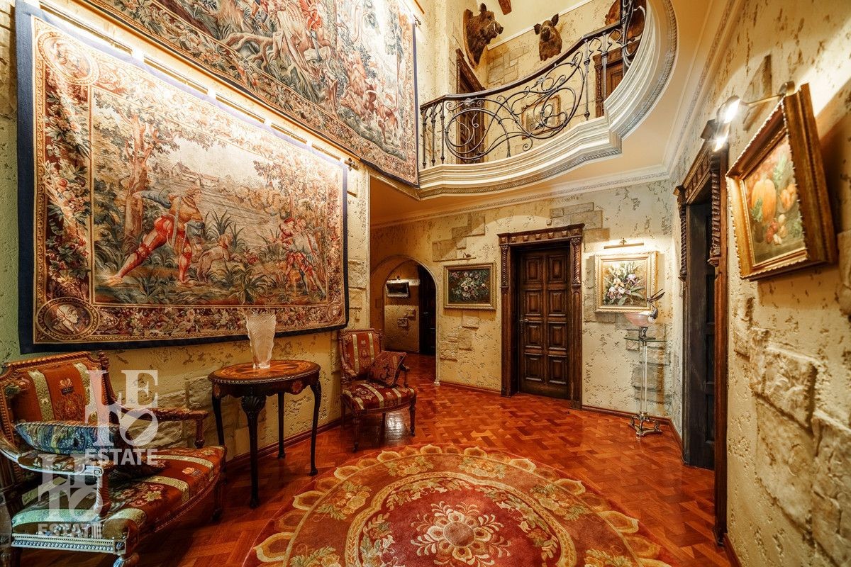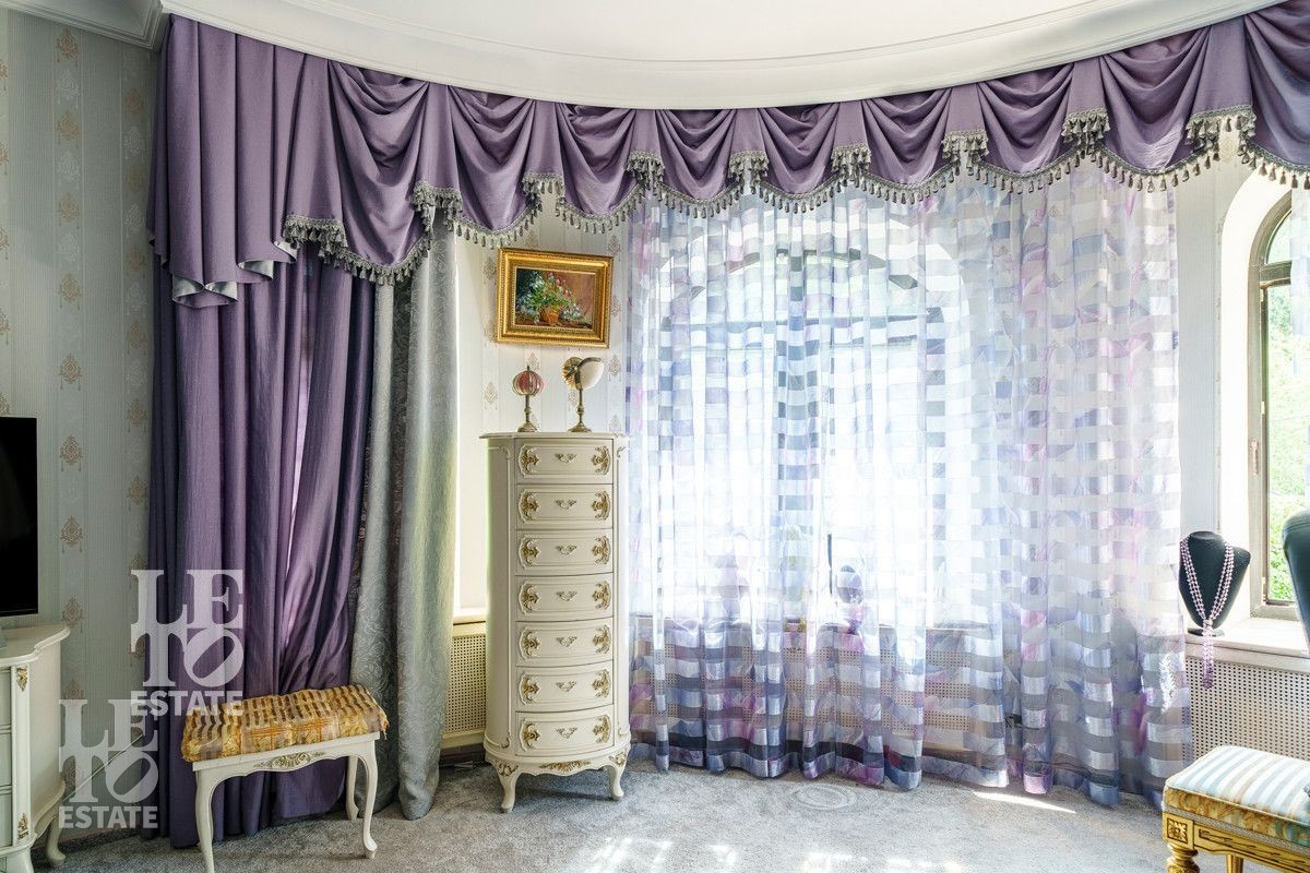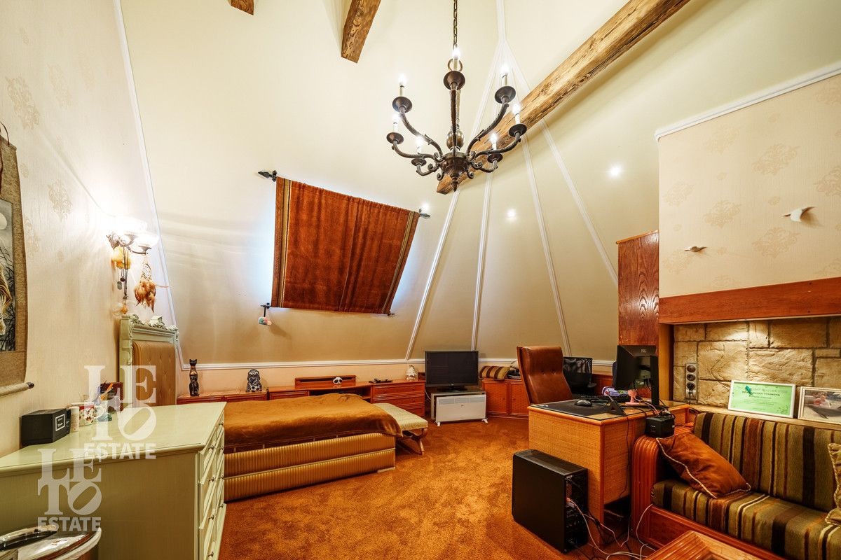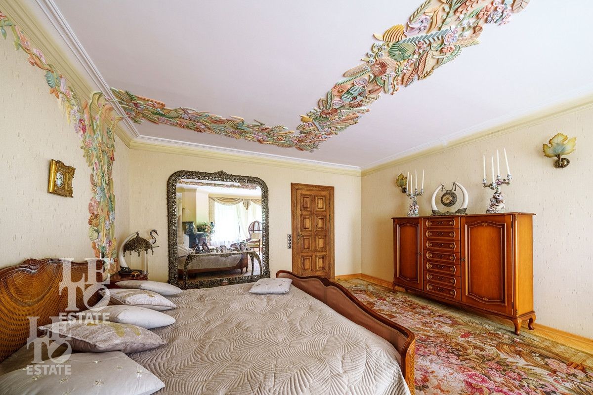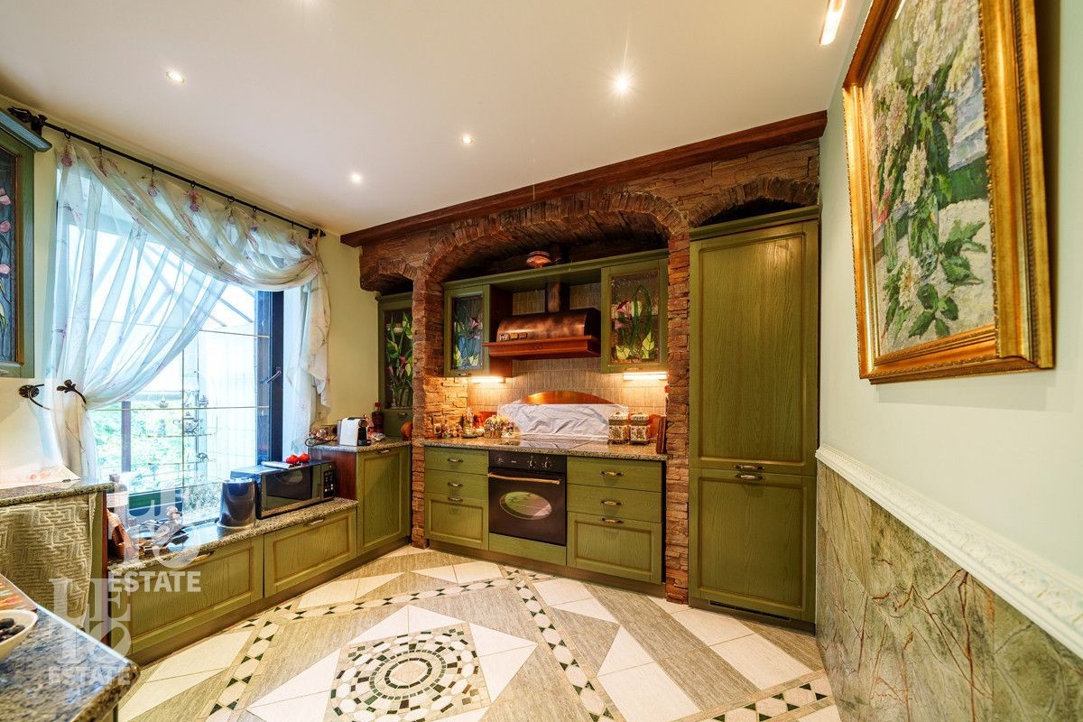 Интерьер дома выполнен из качественных дорогостоящих материалов. Планировка дома продумана до мелочей: холл с гардеробом, просторная гостиная с камином, столовая со вторым светом, веранда с акриловой мебелью из Италии и поликарбонатной крышей приглашают насладиться красотой прилегающего сада. Кухня оборудована мебелью Scavolini, техникой Bosch. В цоколе расположена бильярдная, где можно насладиться игрой на 12-футовом столе для русского бильярда. Мебель Nierri, гобелены ручной работы, ковры Pishavar и витражи создают атмосферу утонченности и комфорта.