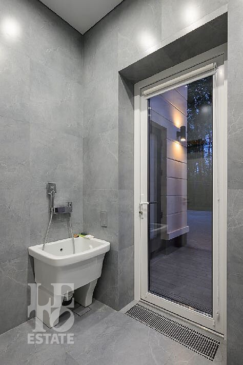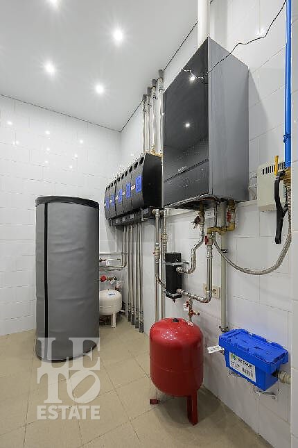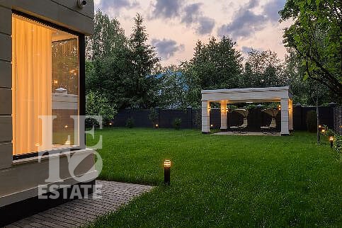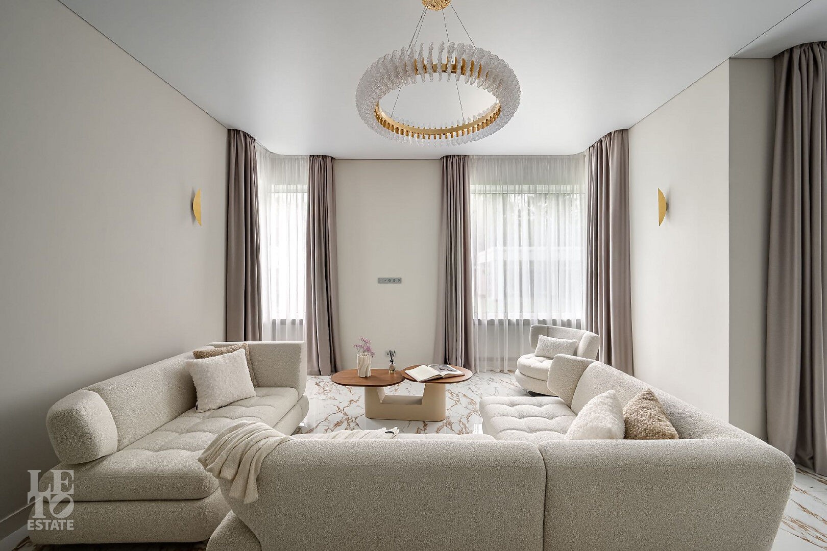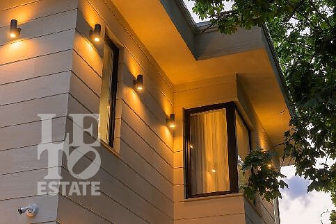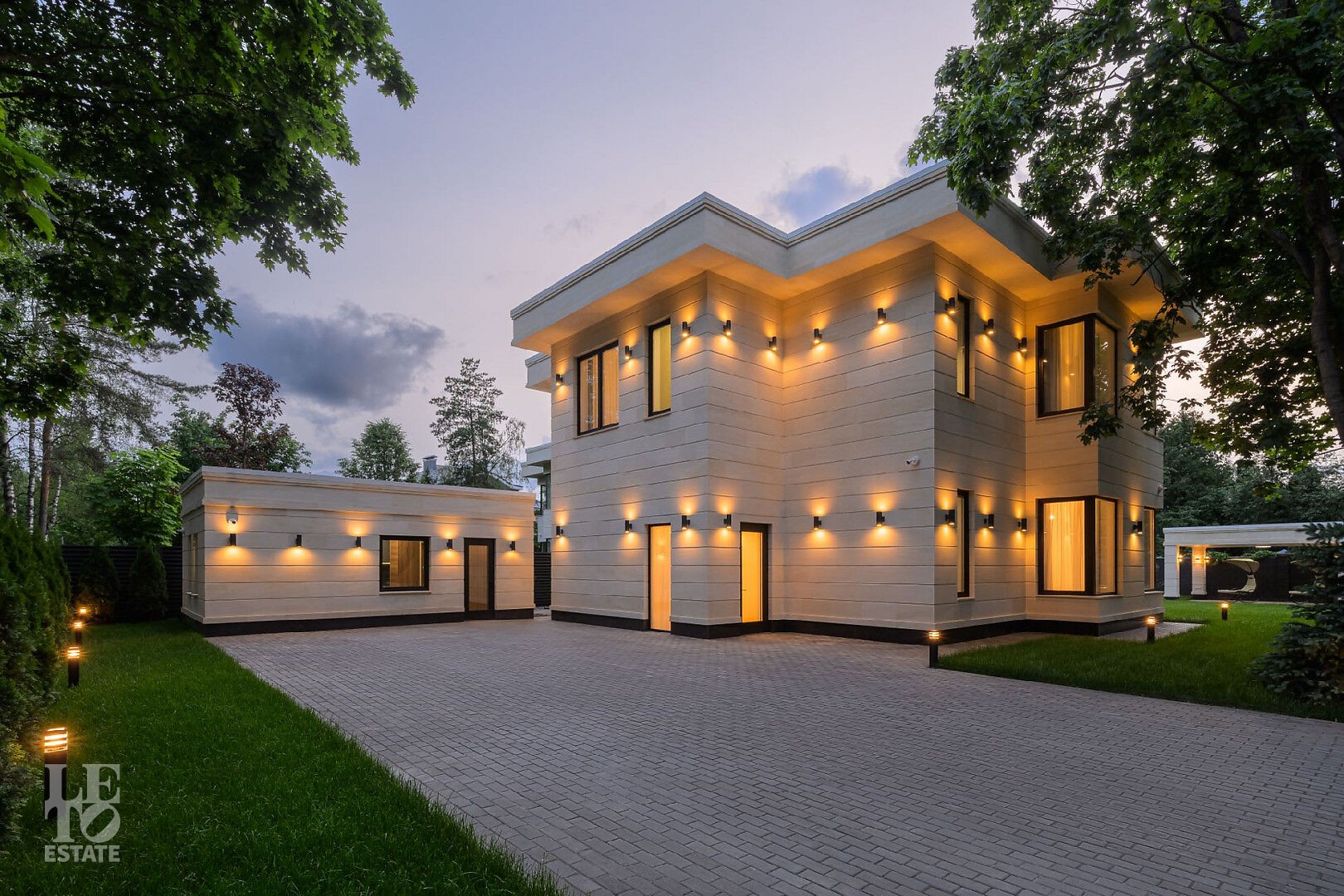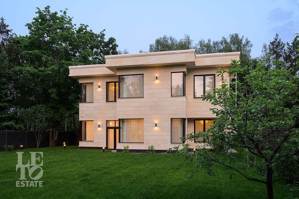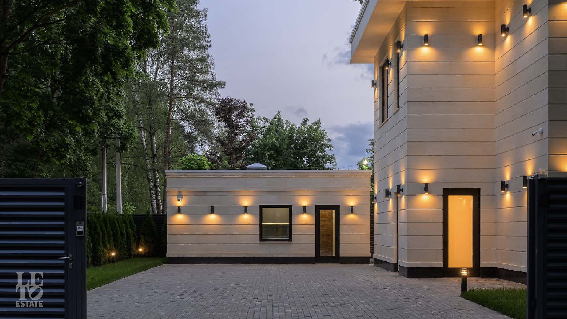 Фасад дома облицован натуральным камнем, цоколь из гранита. Въездная группа, терраса и дорожки вымощены из брусчатки. Дом полностью меблирован, отделка в доме выполнена с использованием высококачественных материалов - ценных пород дерева, шпона, натурального камня, мрамора, текстиль премиального качества, уровневое освещение, встроенная мебель индивидуального изготовления. Установлена система вентиляции с климат-контролем в каждом помещении.