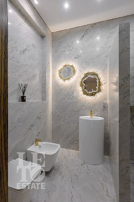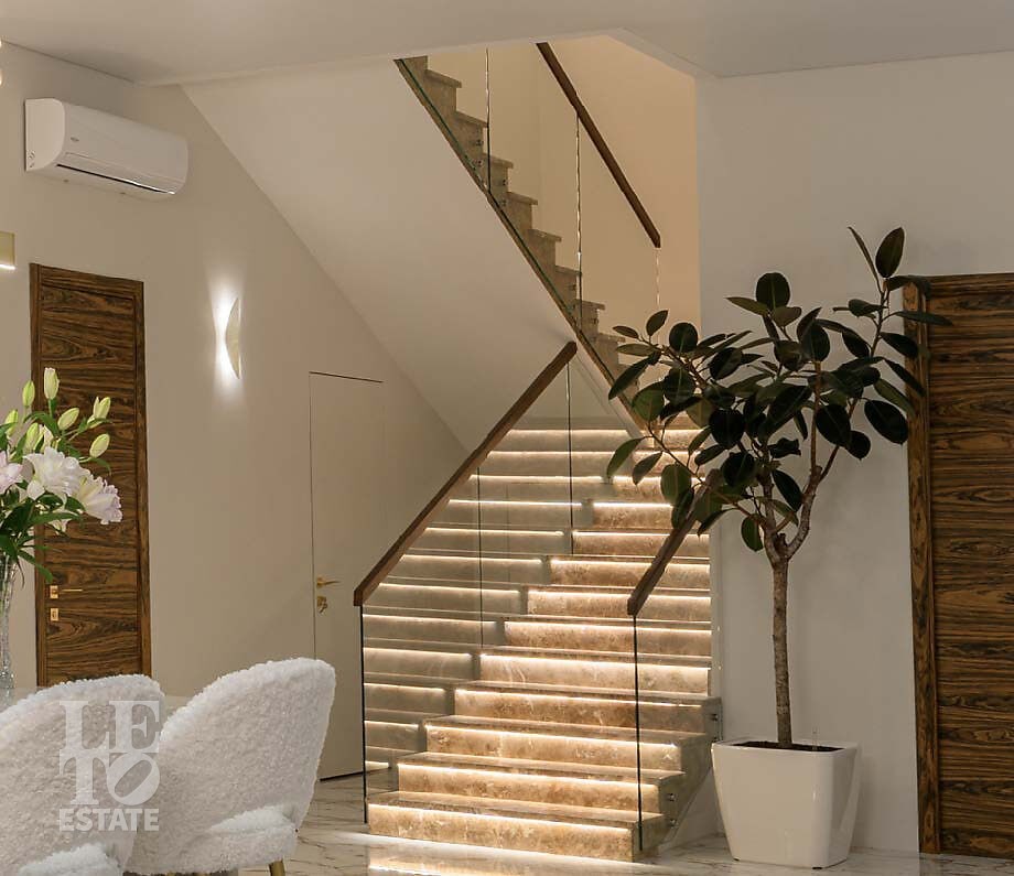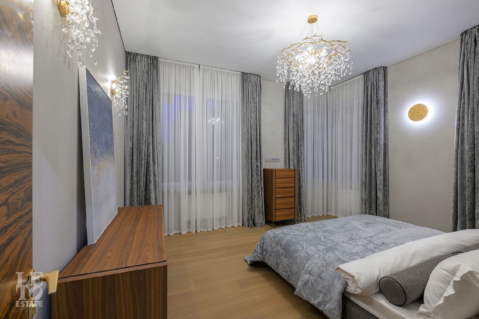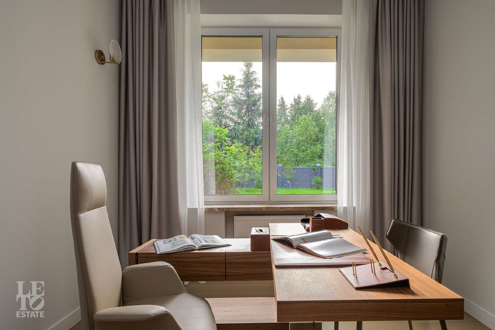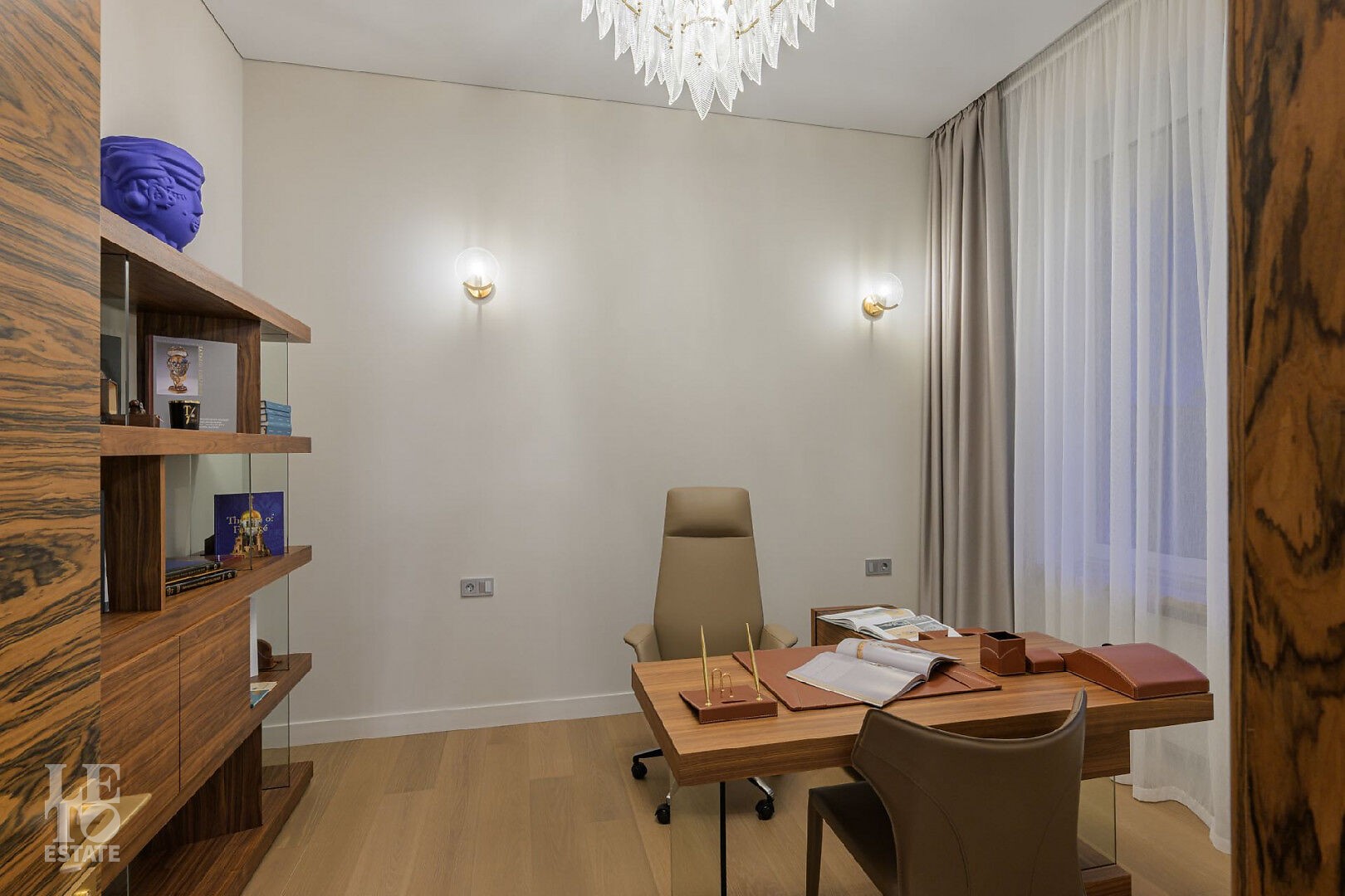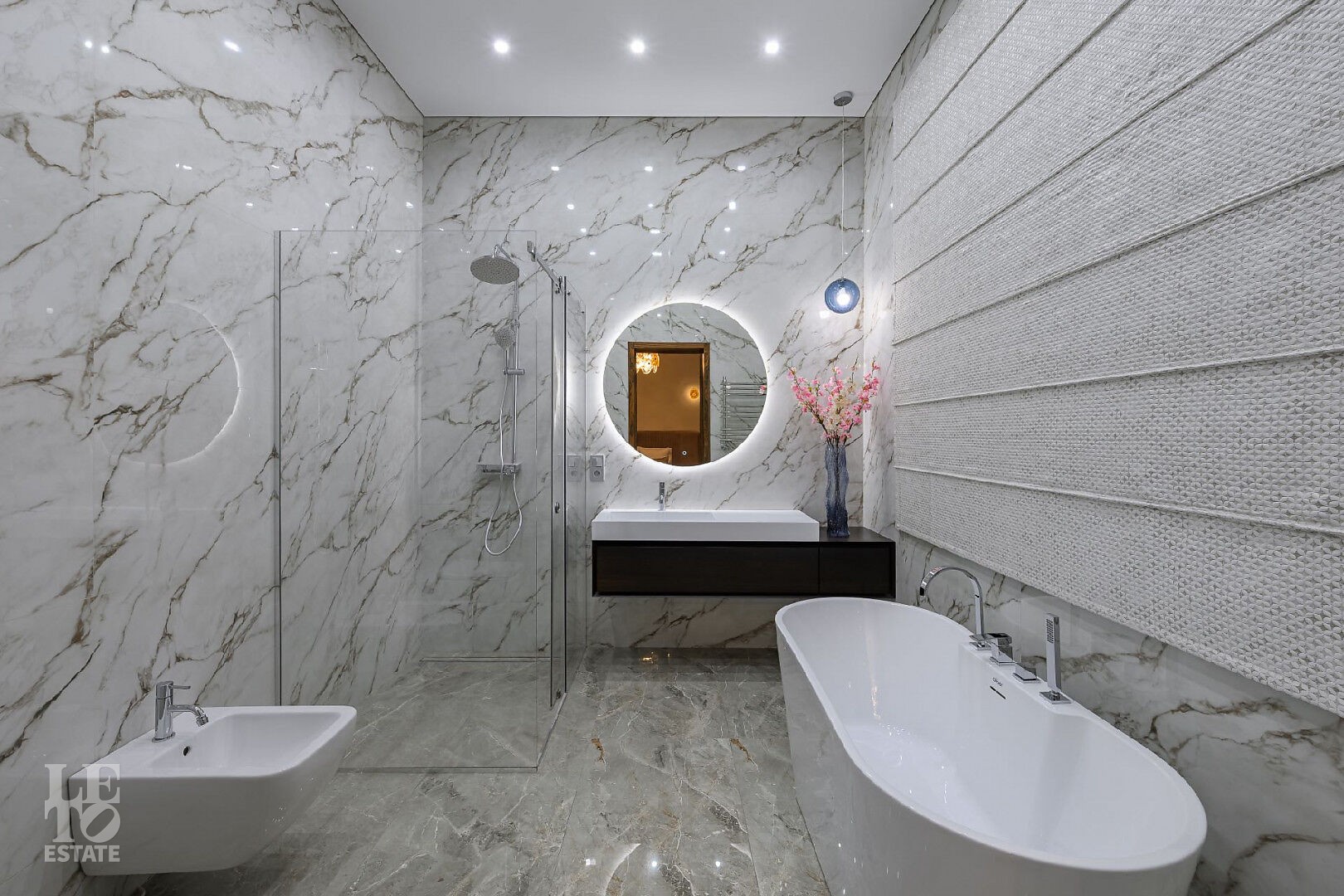 Фасад дома облицован натуральным камнем, цоколь из гранита. Въездная группа, терраса и дорожки вымощены из брусчатки. Дом полностью меблирован, отделка в доме выполнена с использованием высококачественных материалов - ценных пород дерева, шпона, натурального камня, мрамора, текстиль премиального качества, уровневое освещение, встроенная мебель индивидуального изготовления. Установлена система вентиляции с климат-контролем в каждом помещении.