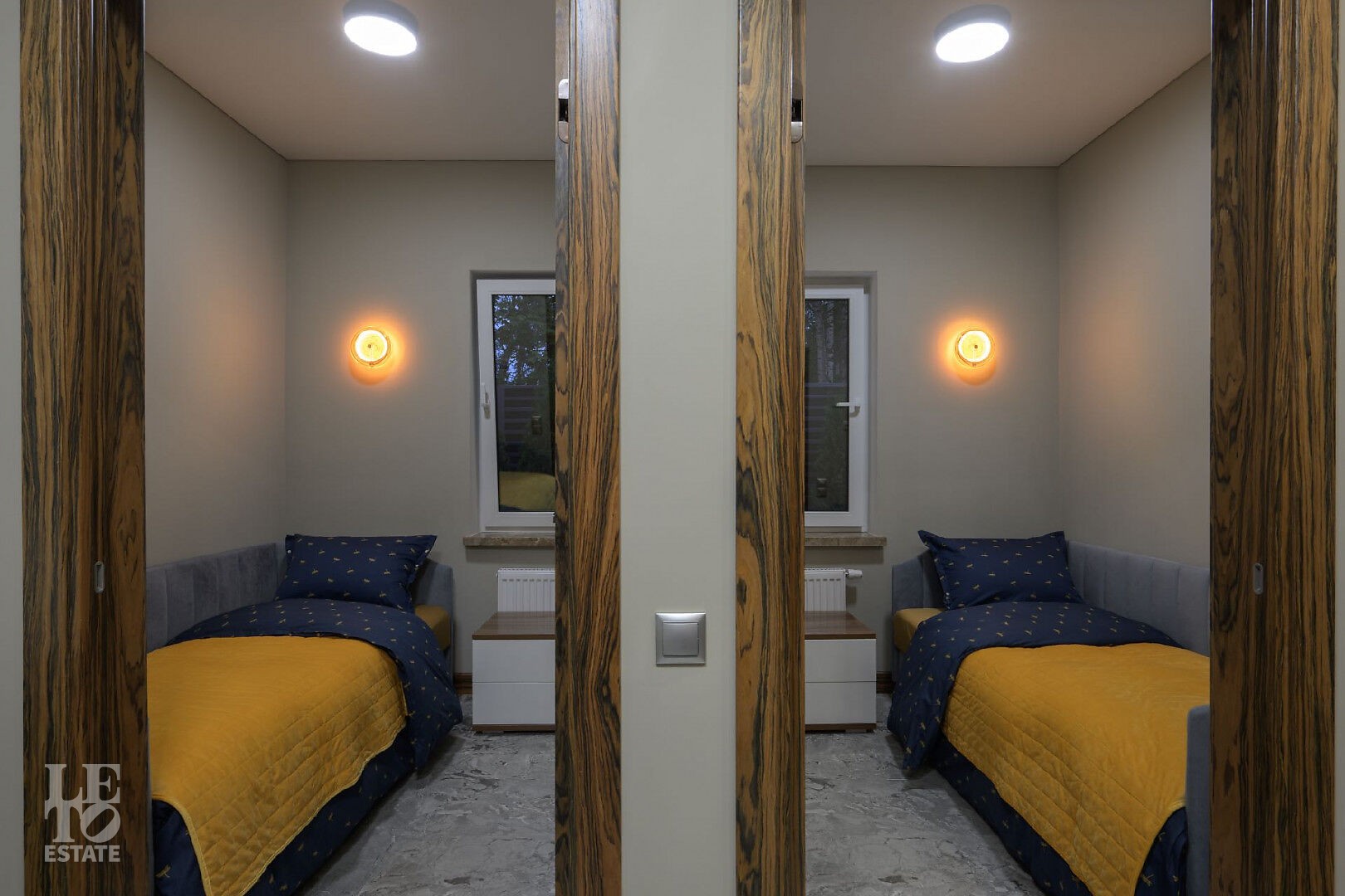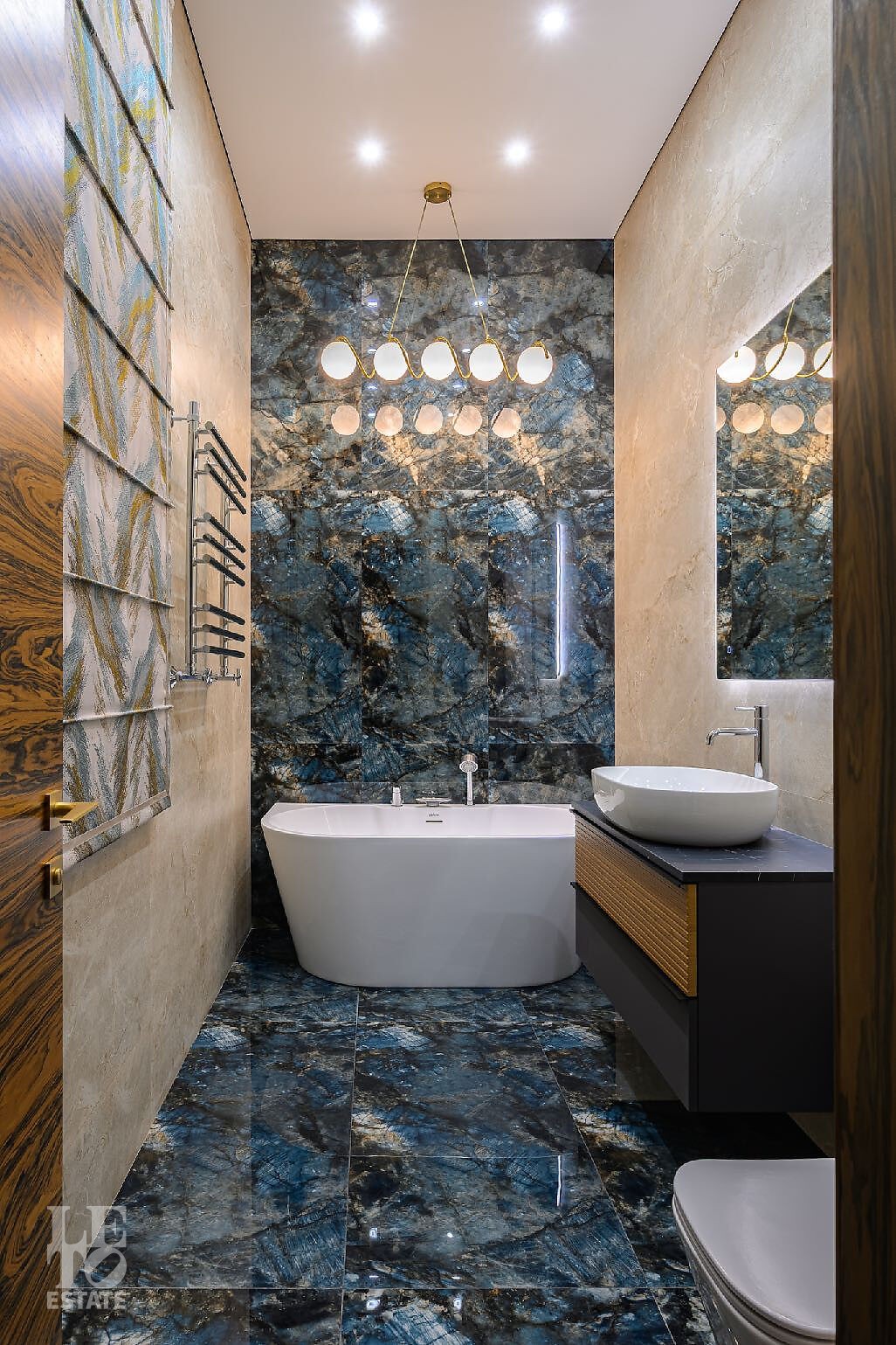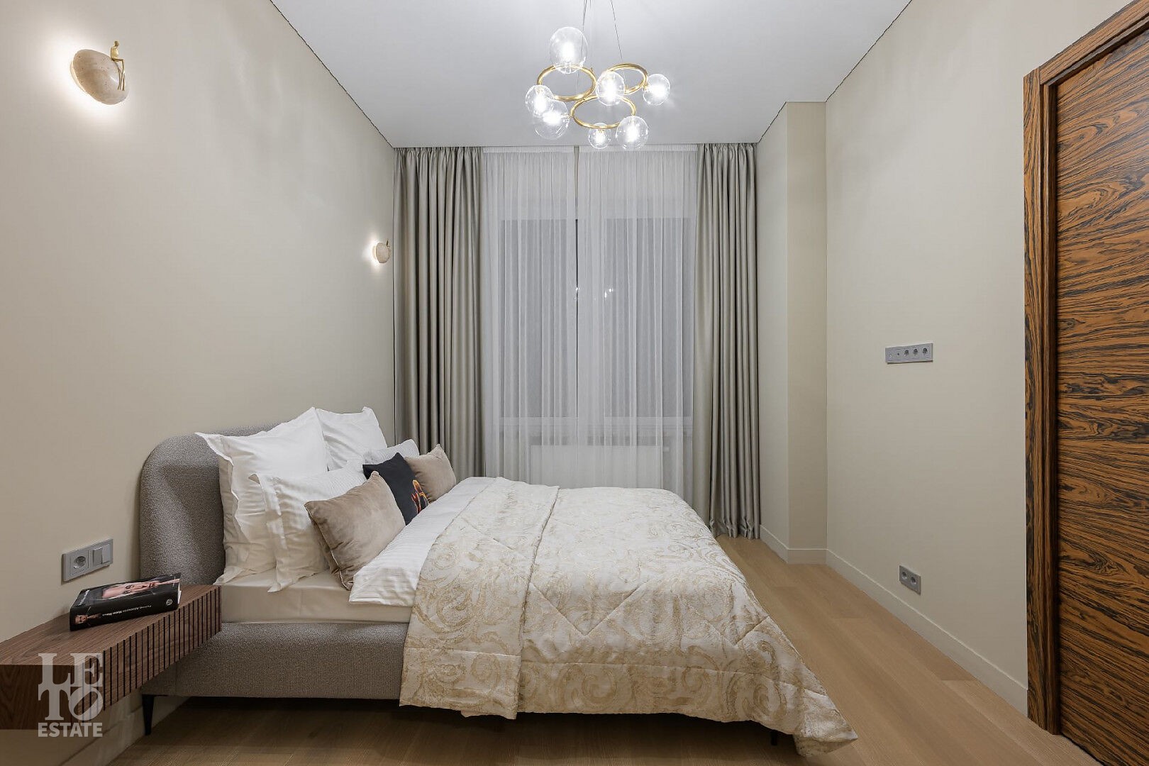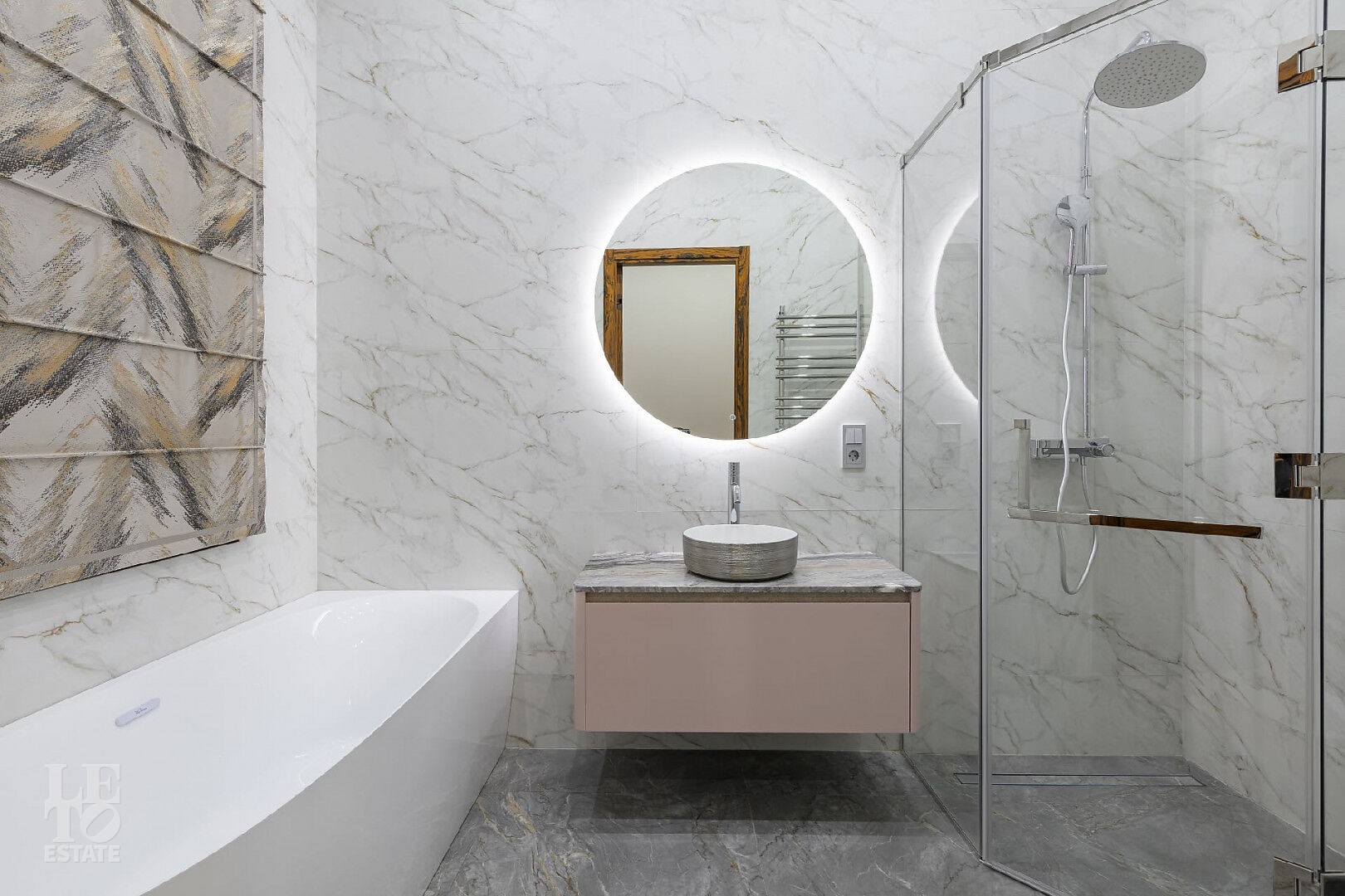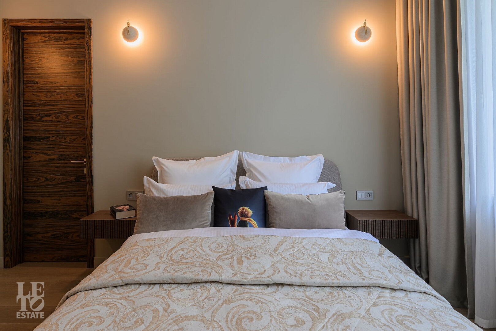 Фасад дома облицован натуральным камнем, цоколь из гранита. Въездная группа, терраса и дорожки вымощены из брусчатки. Дом полностью меблирован, отделка в доме выполнена с использованием высококачественных материалов - ценных пород дерева, шпона, натурального камня, мрамора, текстиль премиального качества, уровневое освещение, встроенная мебель индивидуального изготовления. Установлена система вентиляции с климат-контролем в каждом помещении.