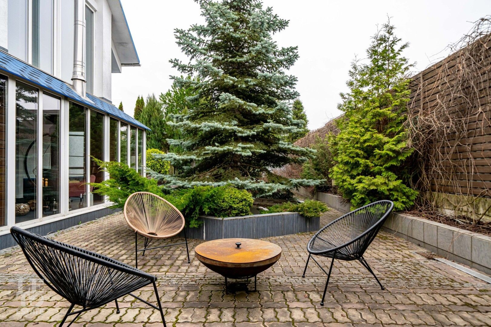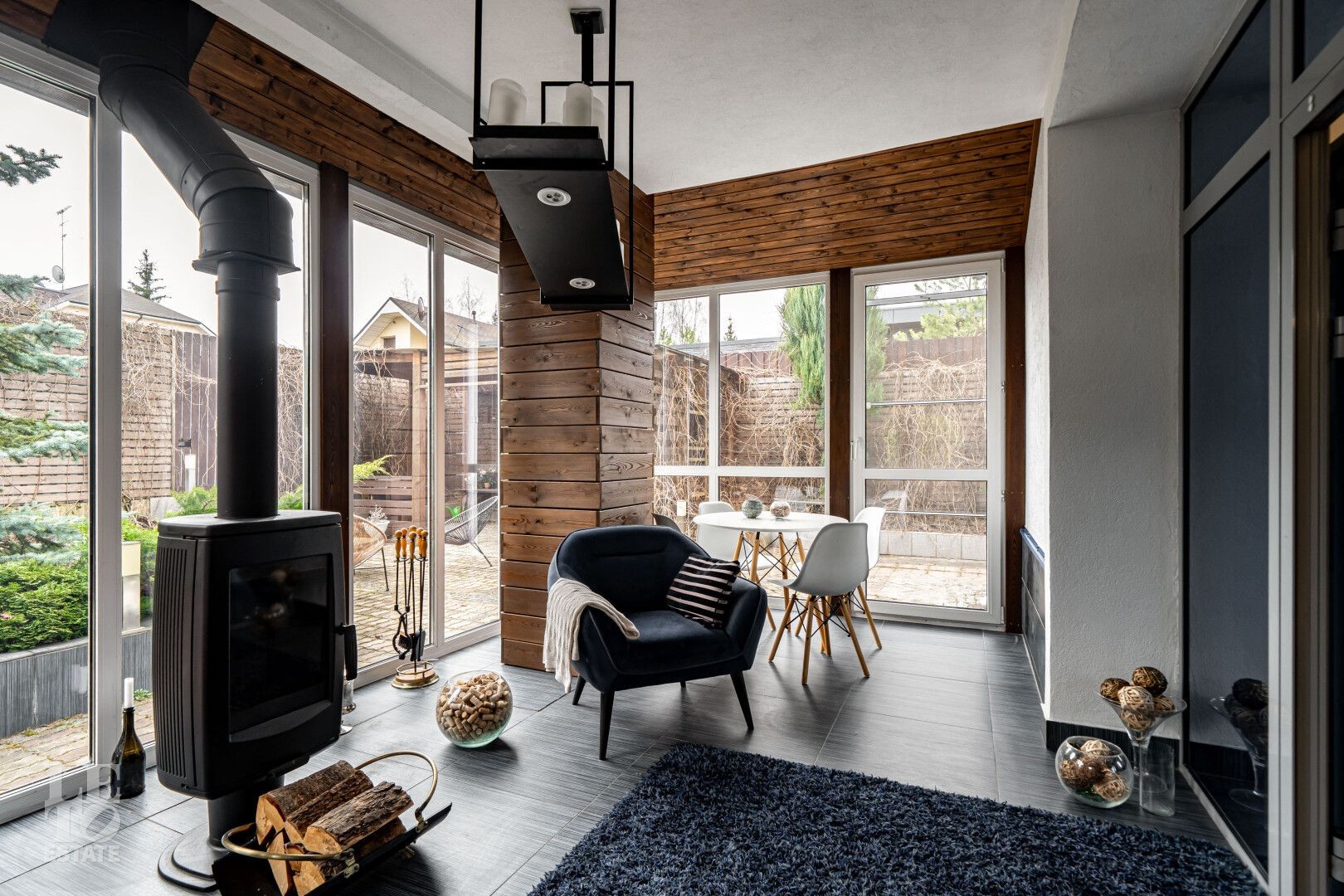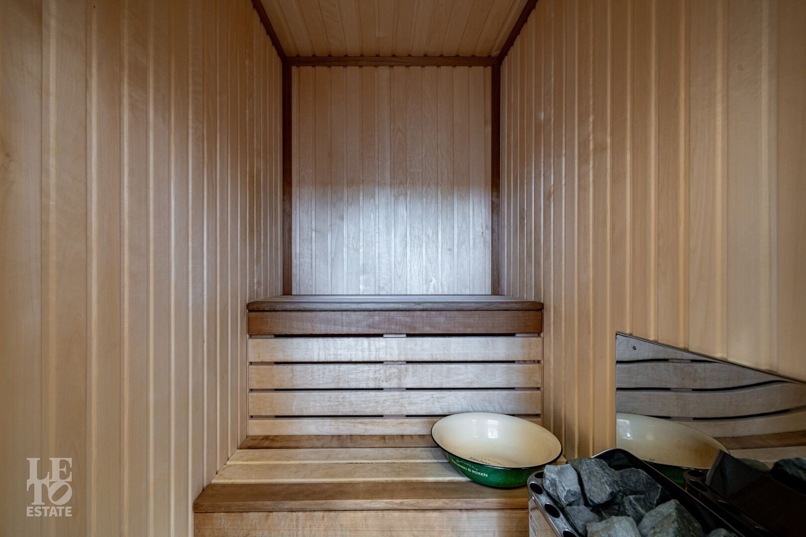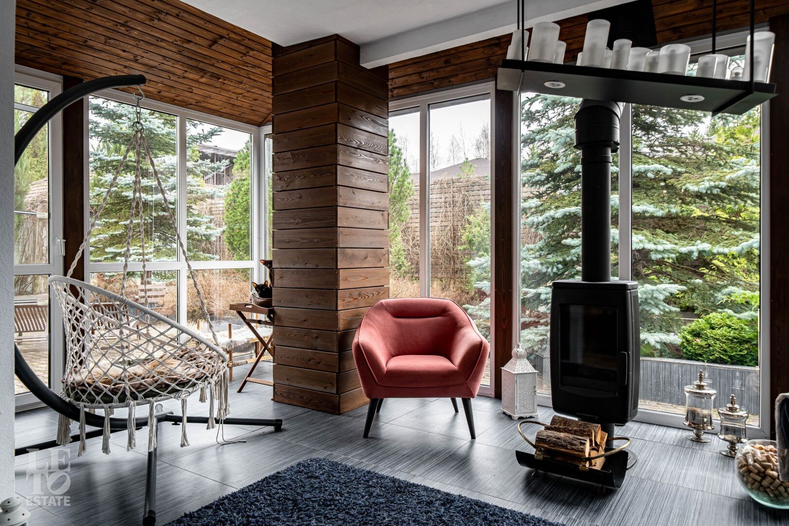 Первый этаж: гостиная-кухня-столовая, гостевой санузел с постирочной, гардероб, веранда-зимний сад с камином, гараж на две машины с гостевым блоком с сауной;
