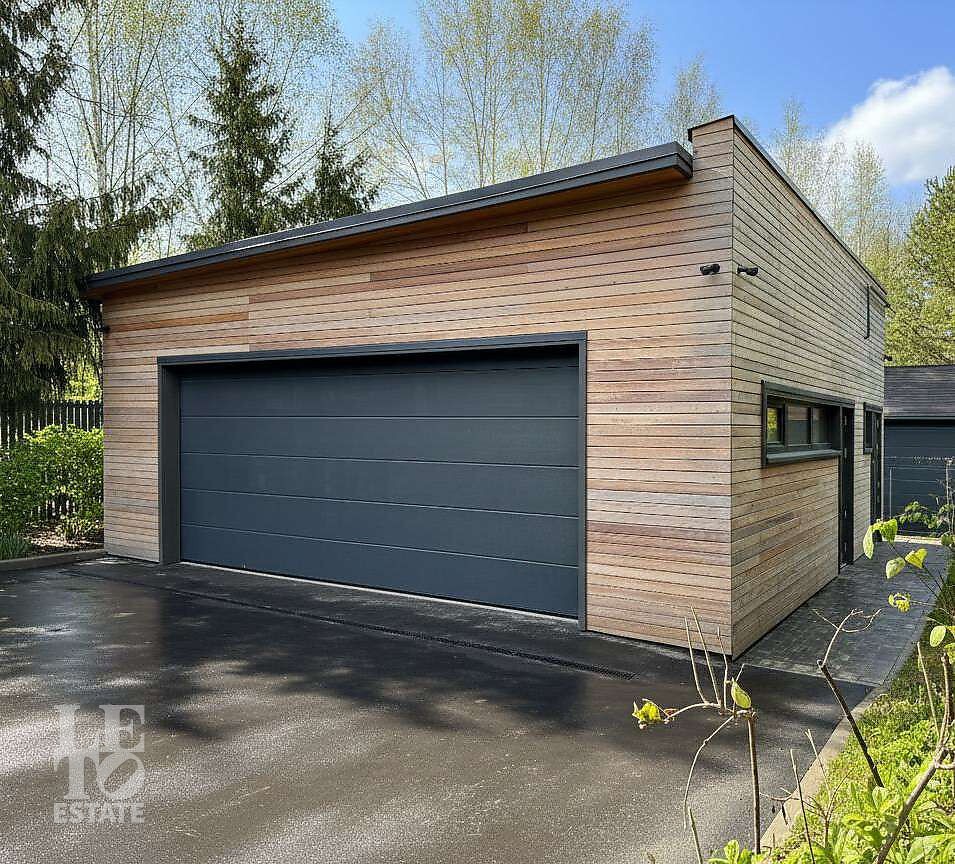 Гараж, рассчитанный на две большие машины — светлый, удобный, с окнами, электро зарядкой, продуманными системами хранения и слива воды. Его ворота длиной 7 метров и финские