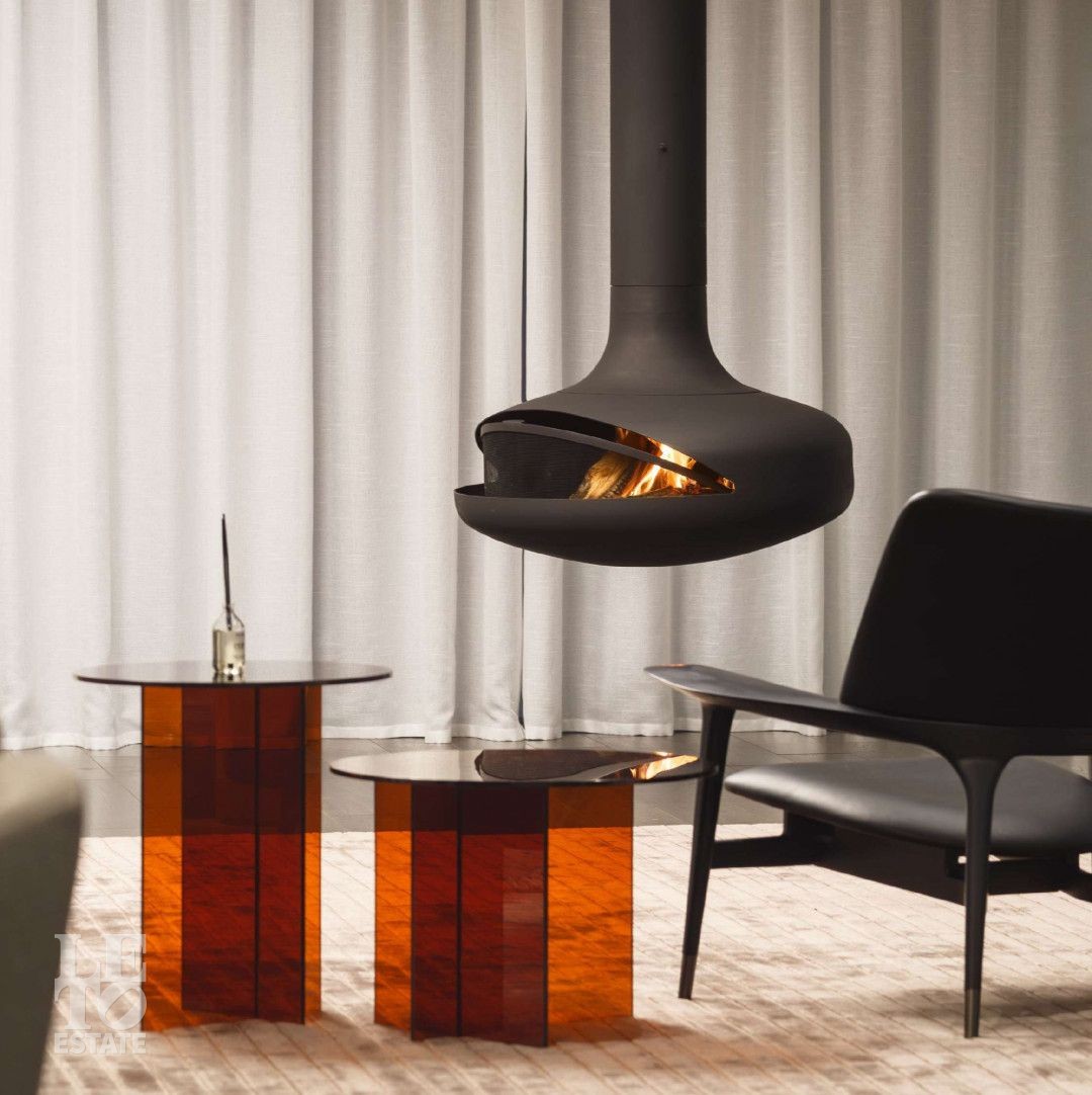 На полу — натуральный паркет, под которым расположена массивная бетонная плита с интегрированной системой тёплого пола. Здесь именно тёплый пол — основной источник отопления: он обеспечивает комфортную температуру и поддерживает благоприятный уровень влажности. Все отопление подключено к системе удалённого управления: температуру можно настраивать со смартфона, заранее прогревая дом к вашему приезду или переводя его в экономичный режим при отъезде.