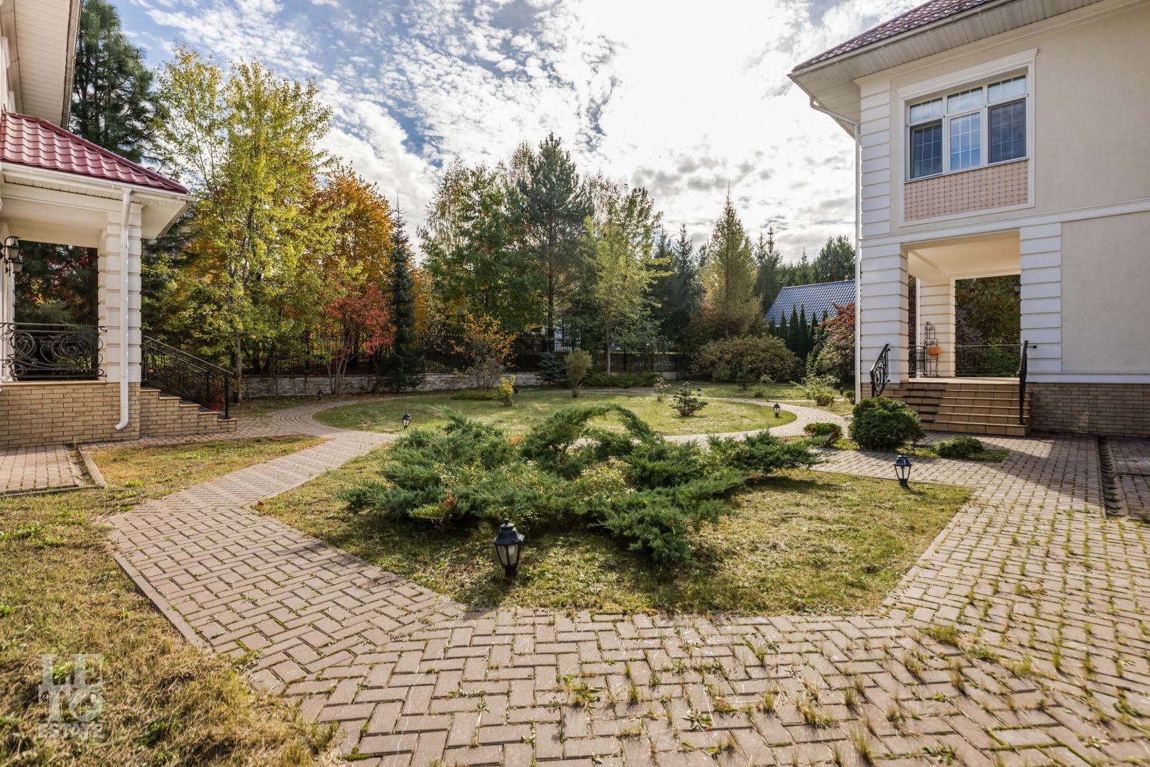 Территория дома правильной формы с высаженными взрослыми деревьями и хорошо освещена, готова к встрече нового хозяина и встрече гостей - на озелененной территории расположены гостевой дом и гараж.