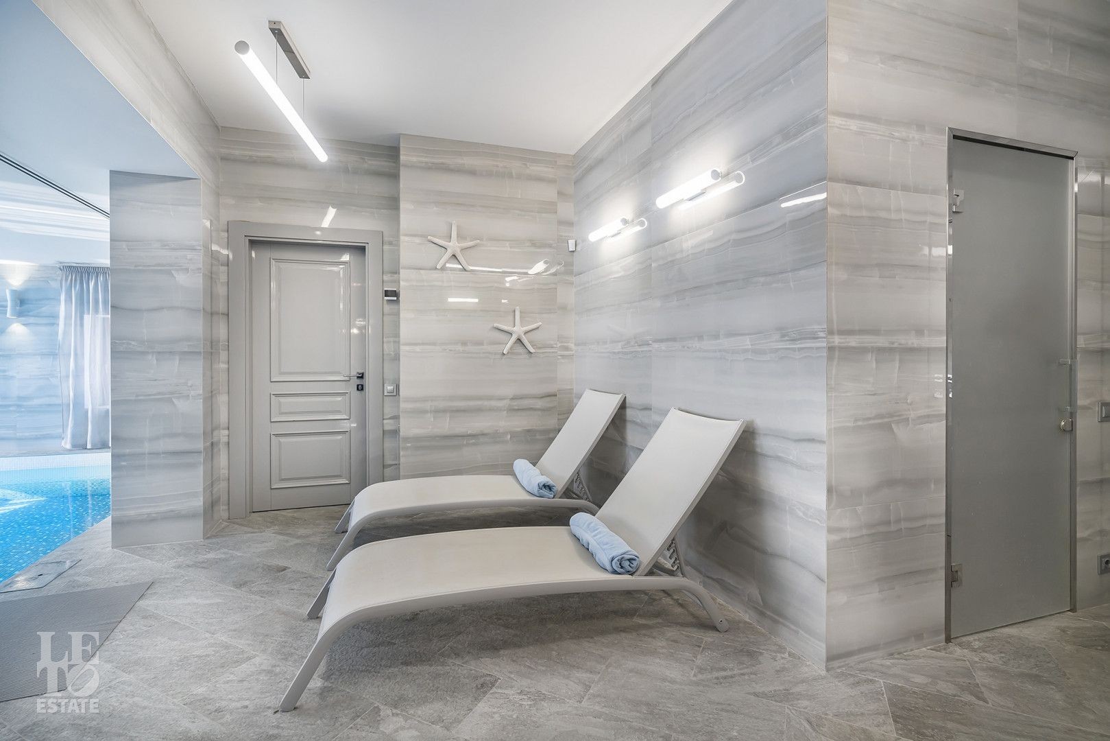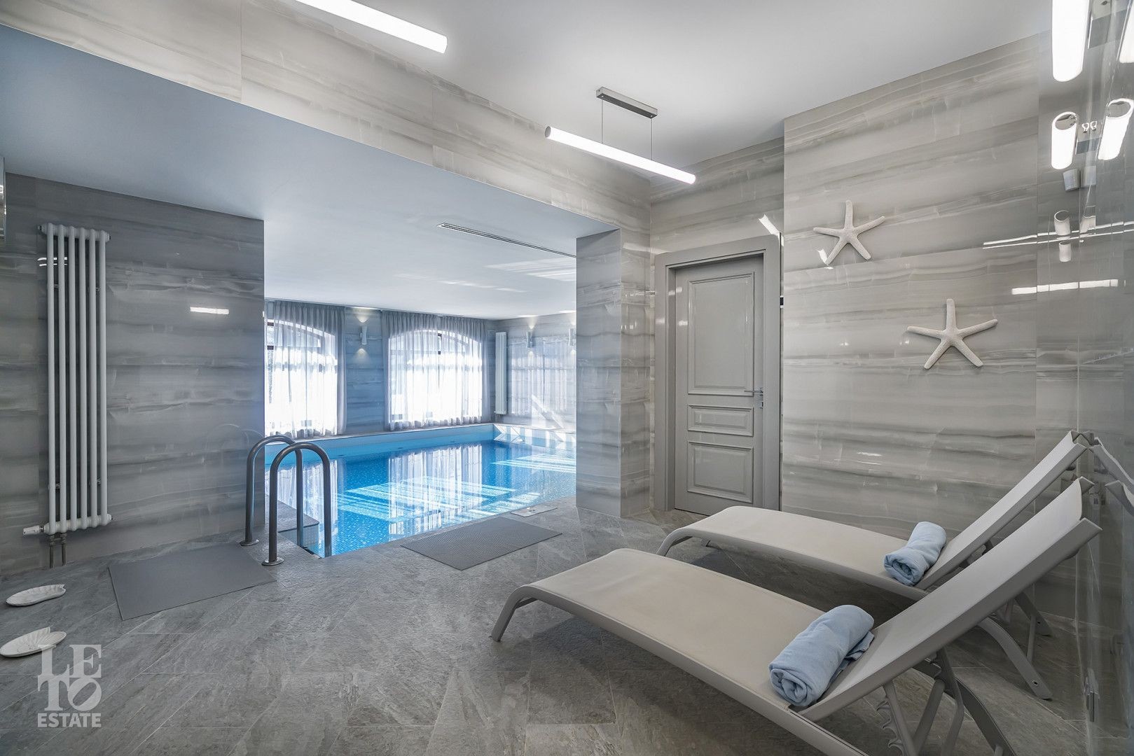 Первый этаж: холл с гардеробной, гостиная, кухня-столовая, гостевой санузел, гостевая комната домашний кинотеатр, SPA-зона (бассейн 35 кв.м. с противотоком, сауна, душевая, санузел), постирочная;