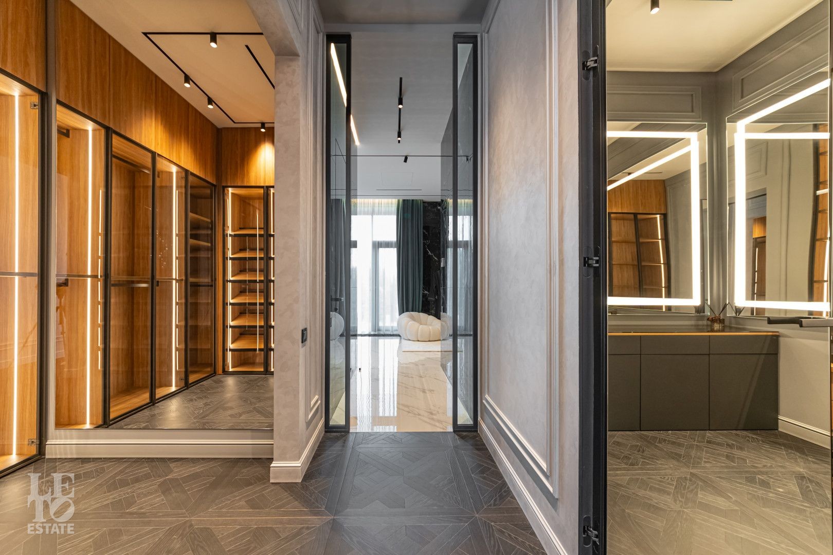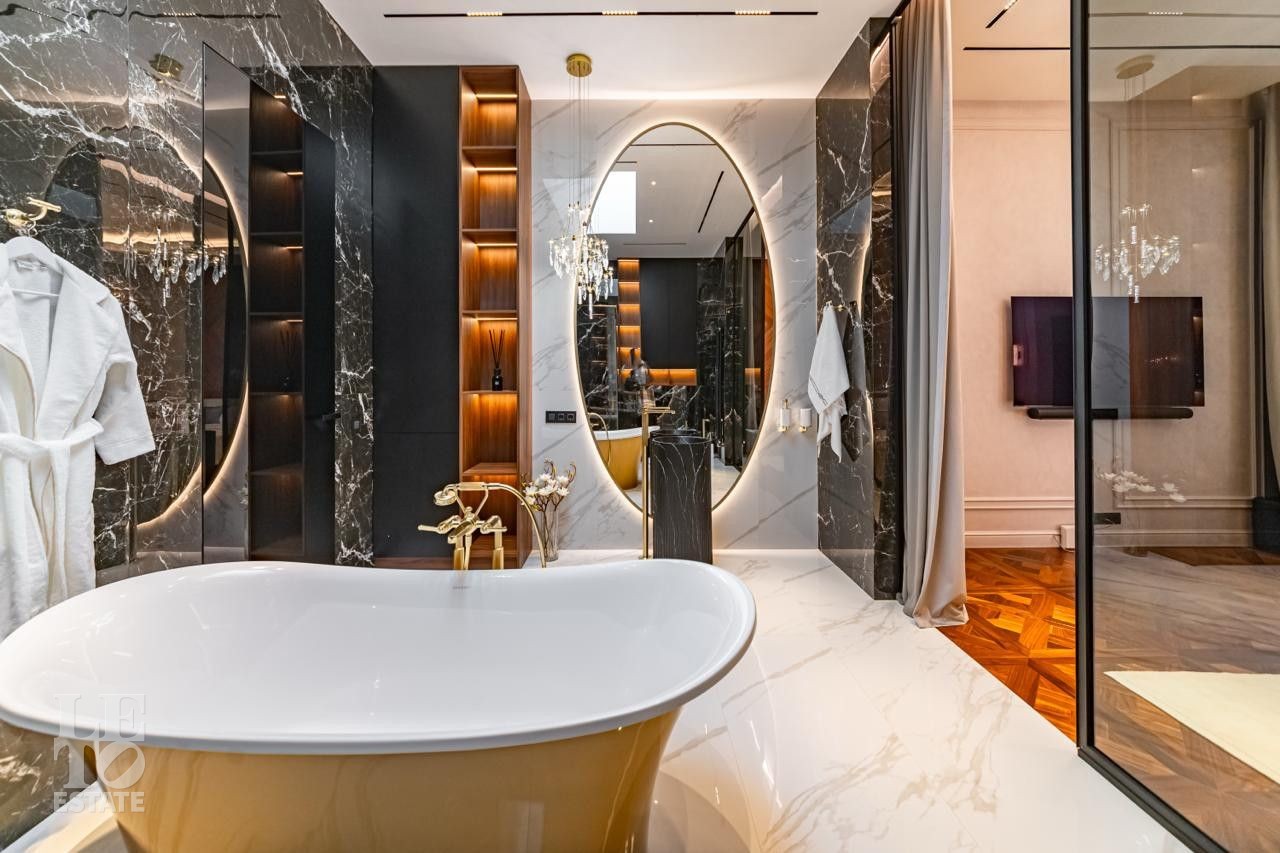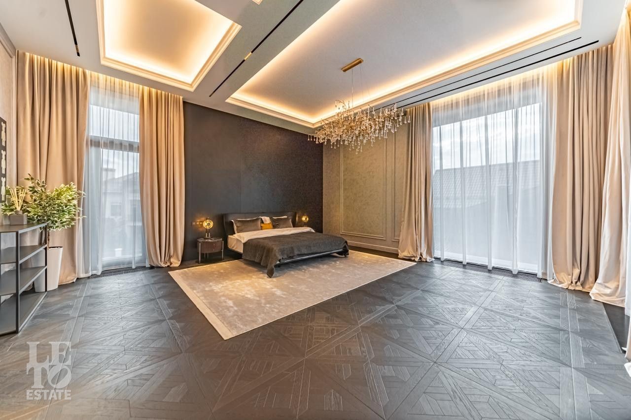 С одной стороны находится место силы для НЕГО - просторный мужской мастер блок с кабинетом, спальней, ванной комнатой с угловым окном и двумя бутик-гардеробными, а с другой —