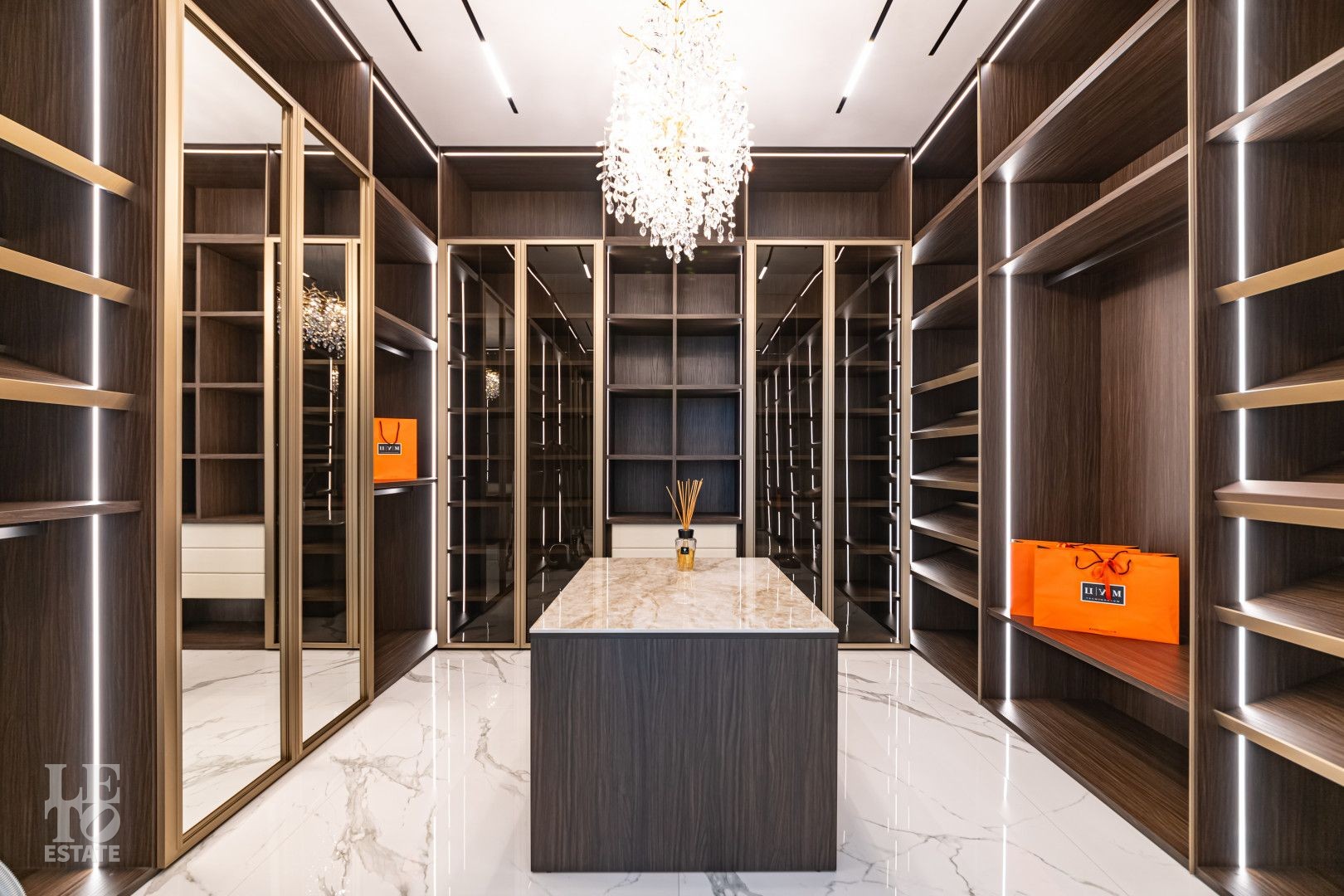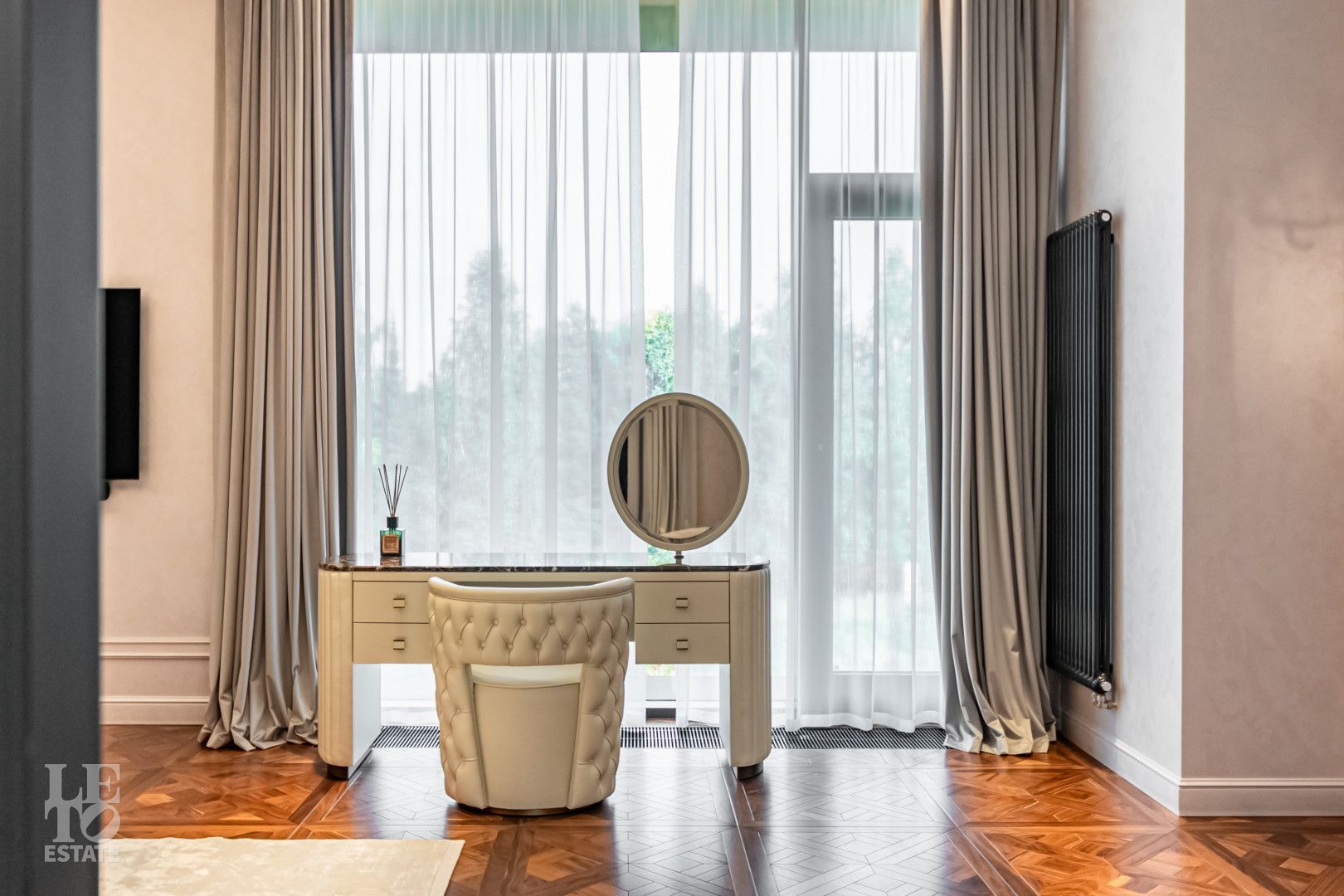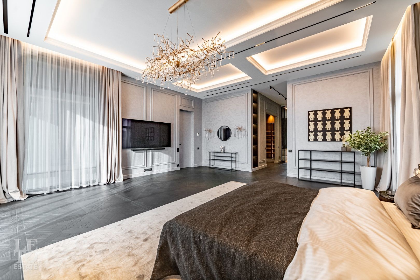 С одной стороны находится место силы для НЕГО - просторный мужской мастер блок с кабинетом, спальней, ванной комнатой с угловым окном и двумя бутик-гардеробными, а с другой —