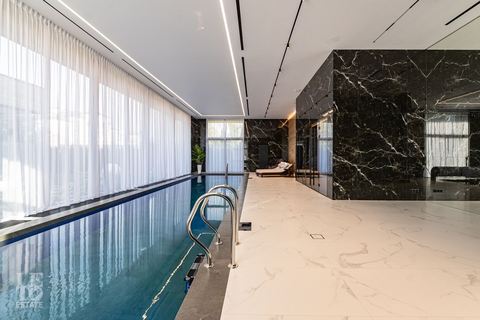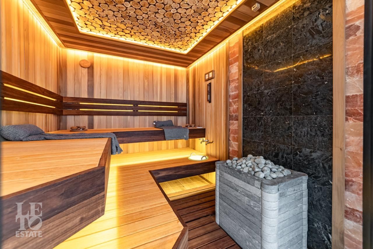 Спа-комплекс дома представлен прекрасным плавательным бассейном, который разместился вдоль панорамного окна, сауной с печью ручной работы из натурального камня и большой зоной отдыха. Конечно же, раздевалкой, санузлом, большой душевой с встроенным в потолок обливным ведром и постирочной.