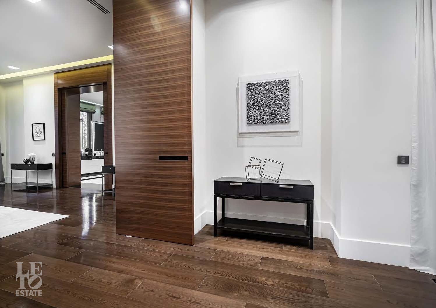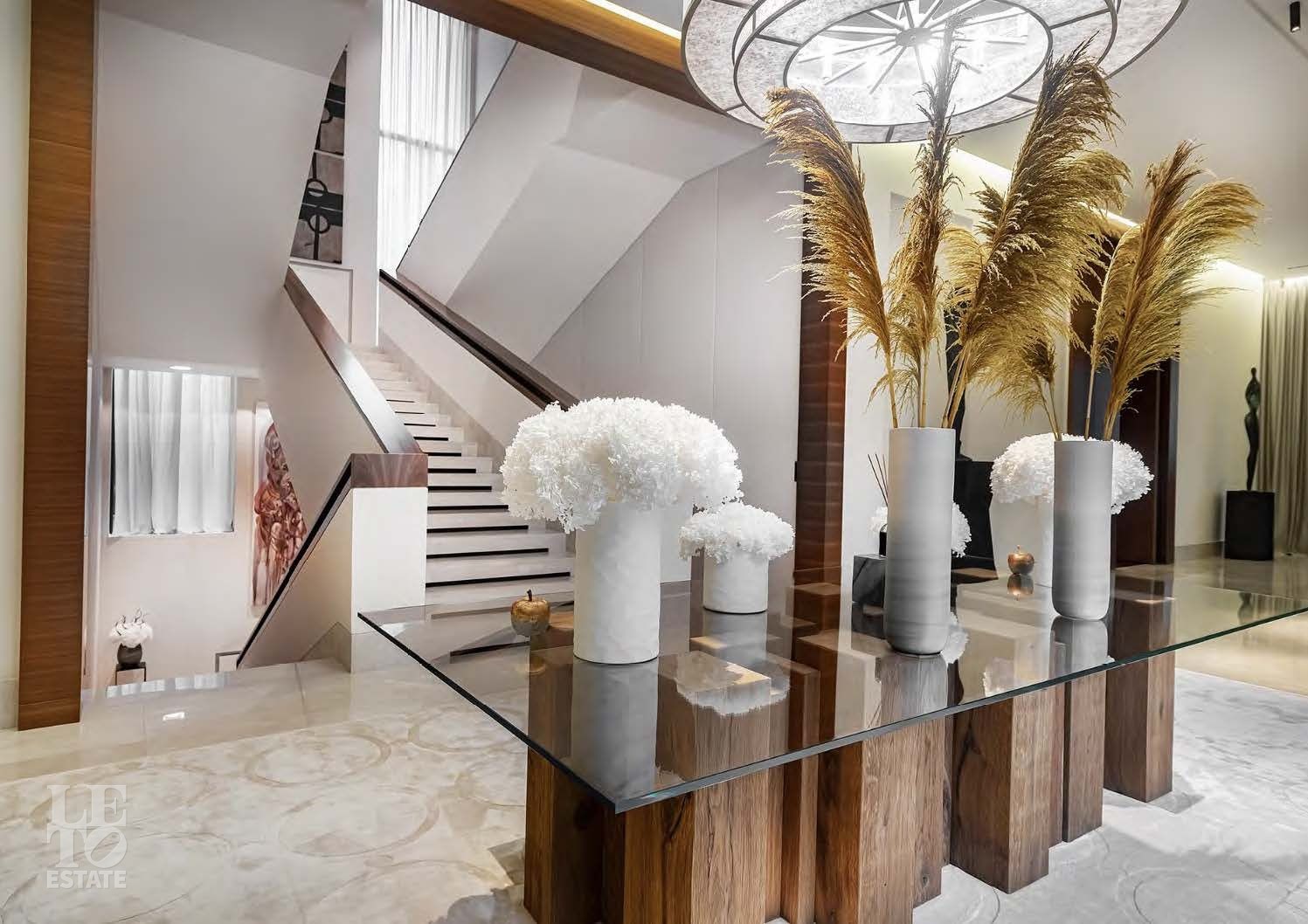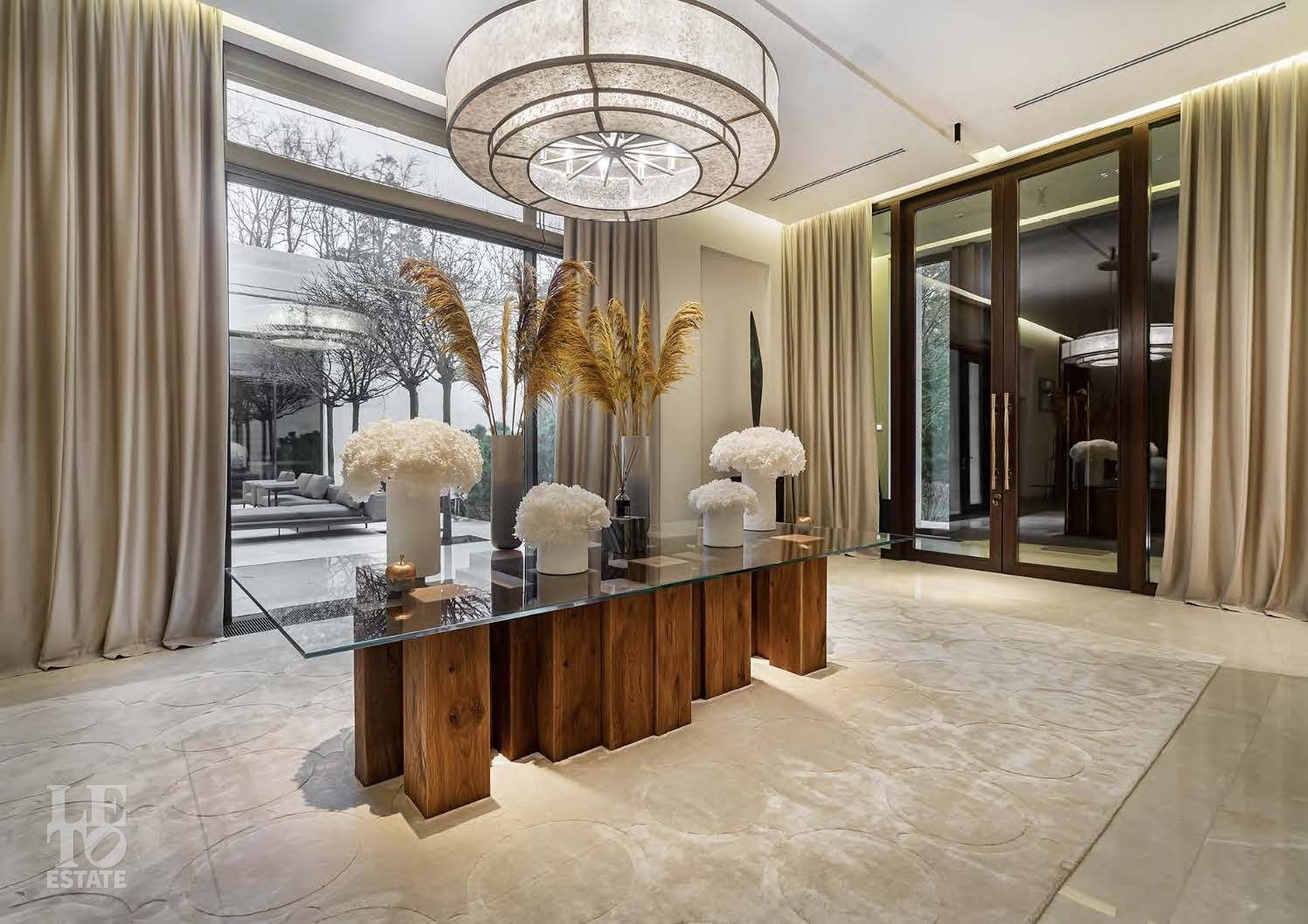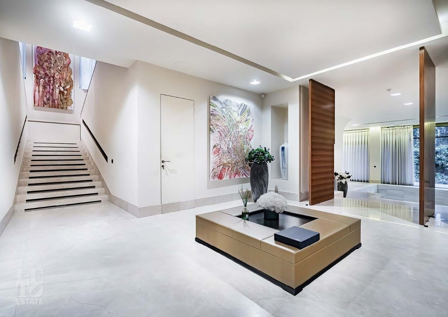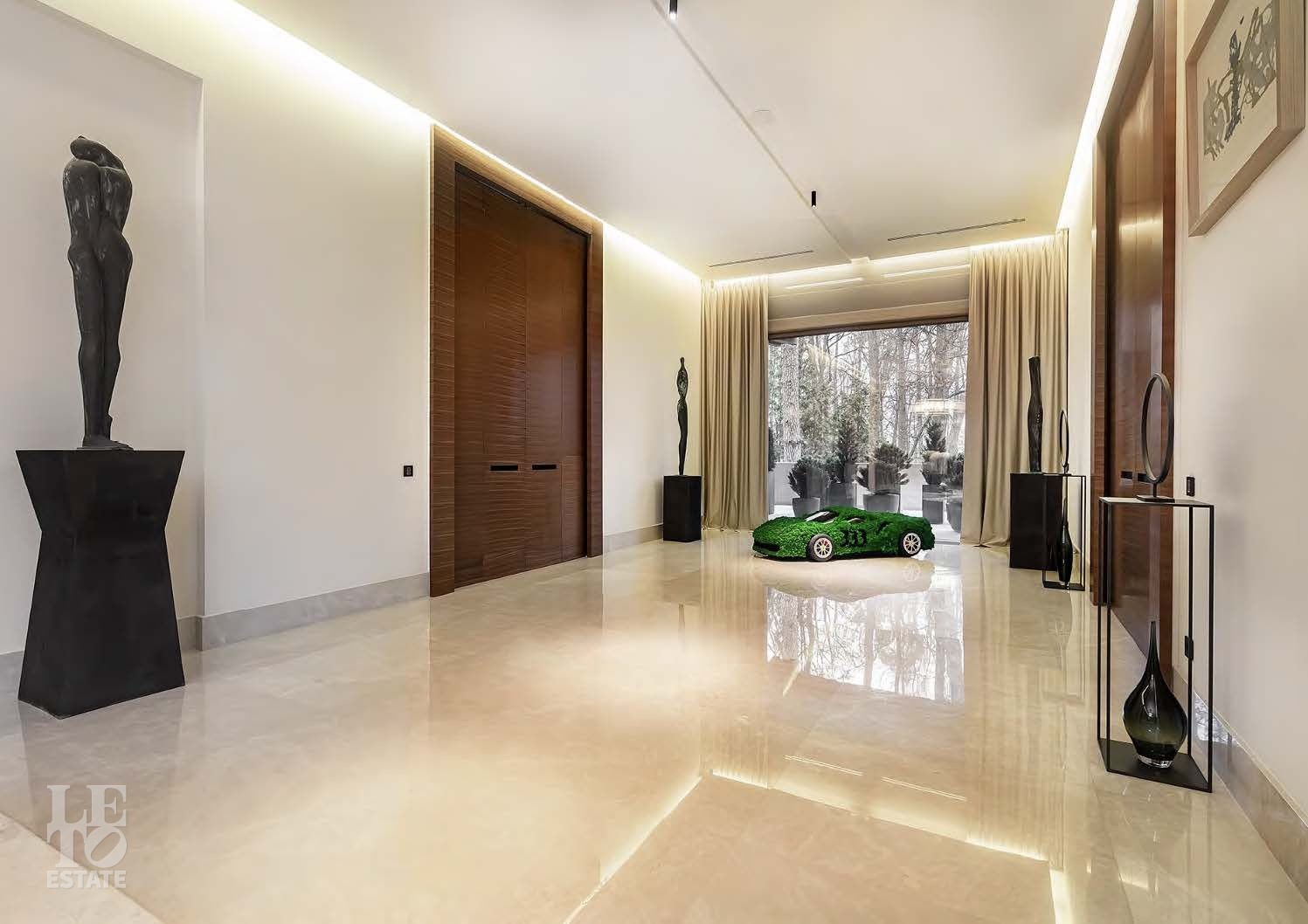 Вилла выполнена в стиле модерн. Входная группа – входные двери высотой около 4 м со скульптурными бронзовыми ручками. Зал с высокими потолками (3,9 м) украшен авторскими скульптурами и мебелью, изготовленной на заказ. Пространство построено в теплом и