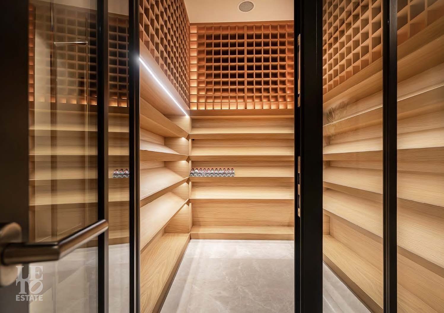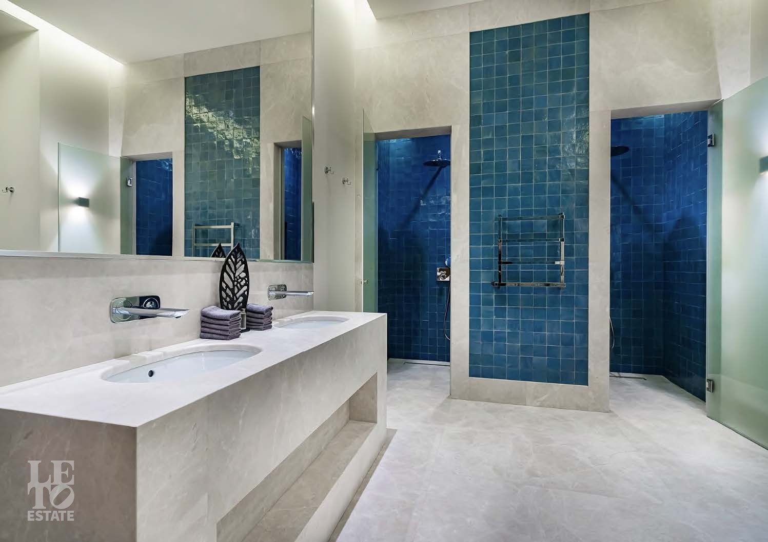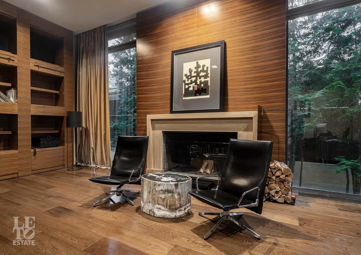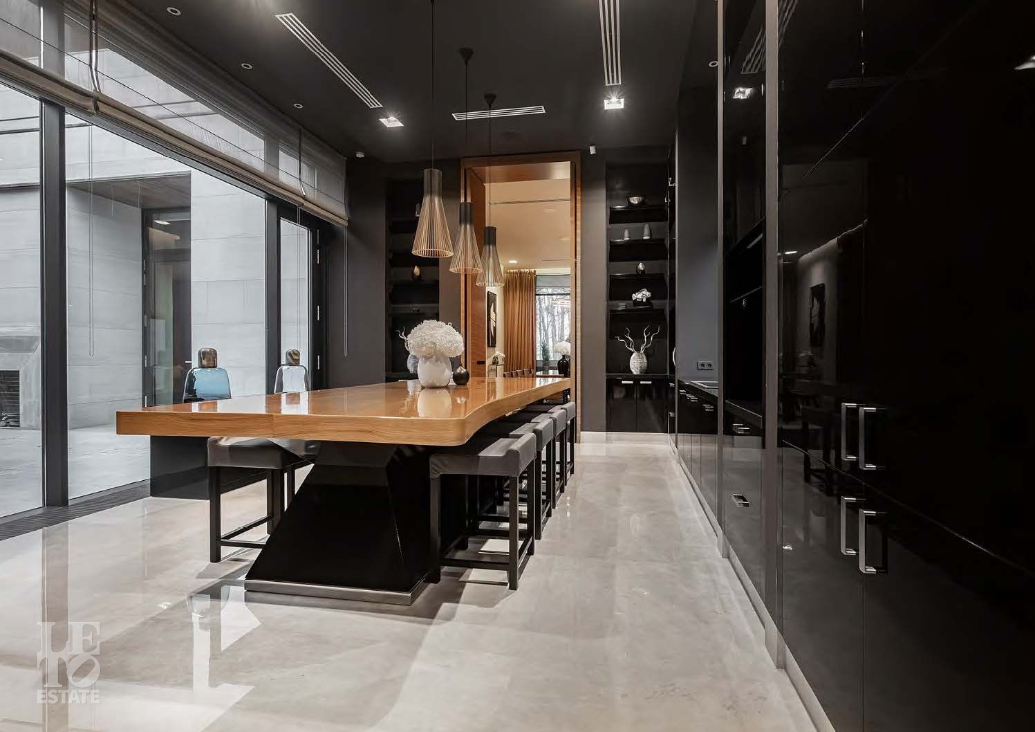 Вилла выполнена в стиле модерн. Входная группа – входные двери высотой около 4 м со скульптурными бронзовыми ручками. Зал с высокими потолками (3,9 м) украшен авторскими скульптурами и мебелью, изготовленной на заказ. Пространство построено в теплом и