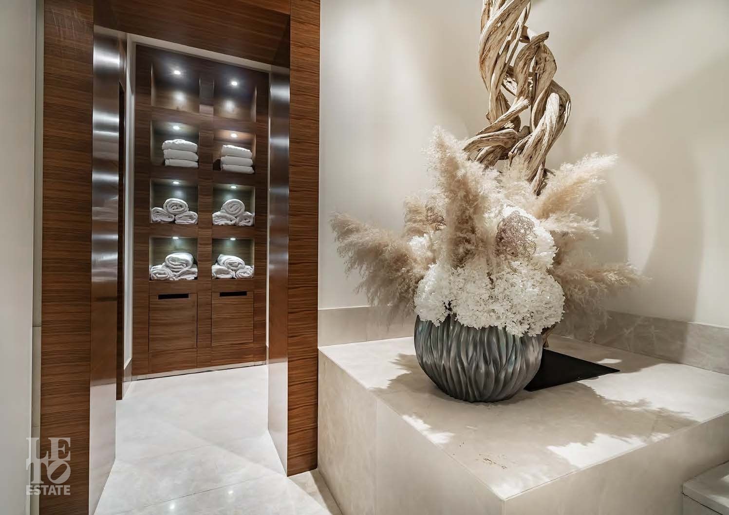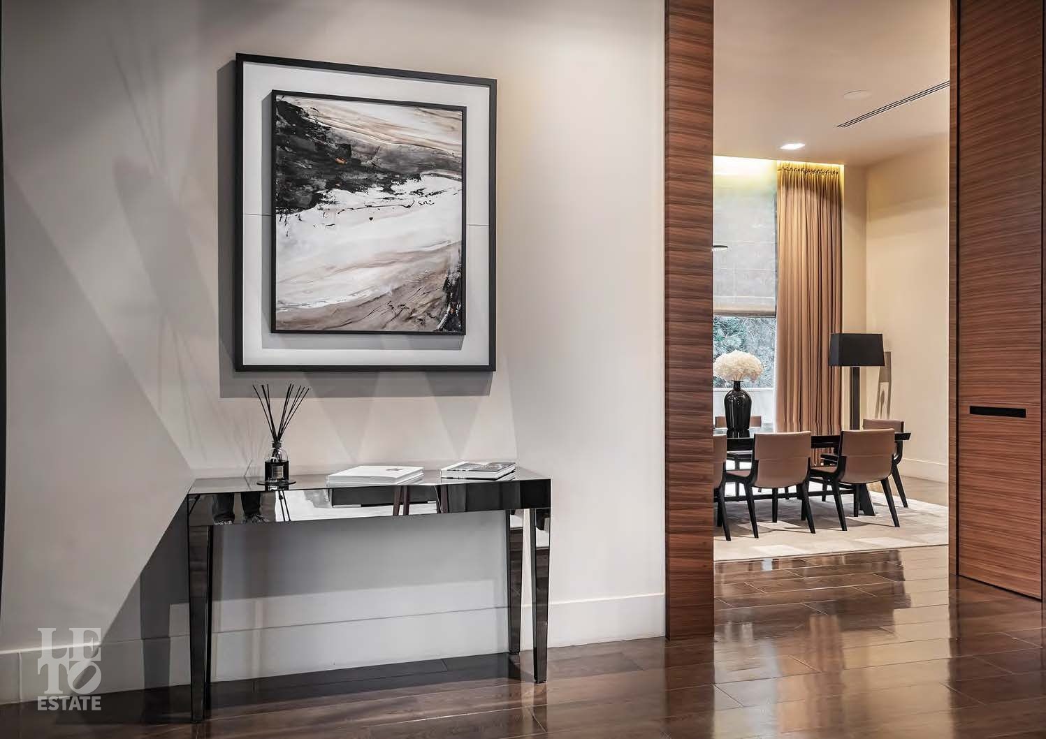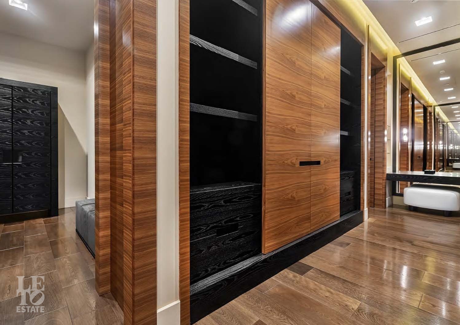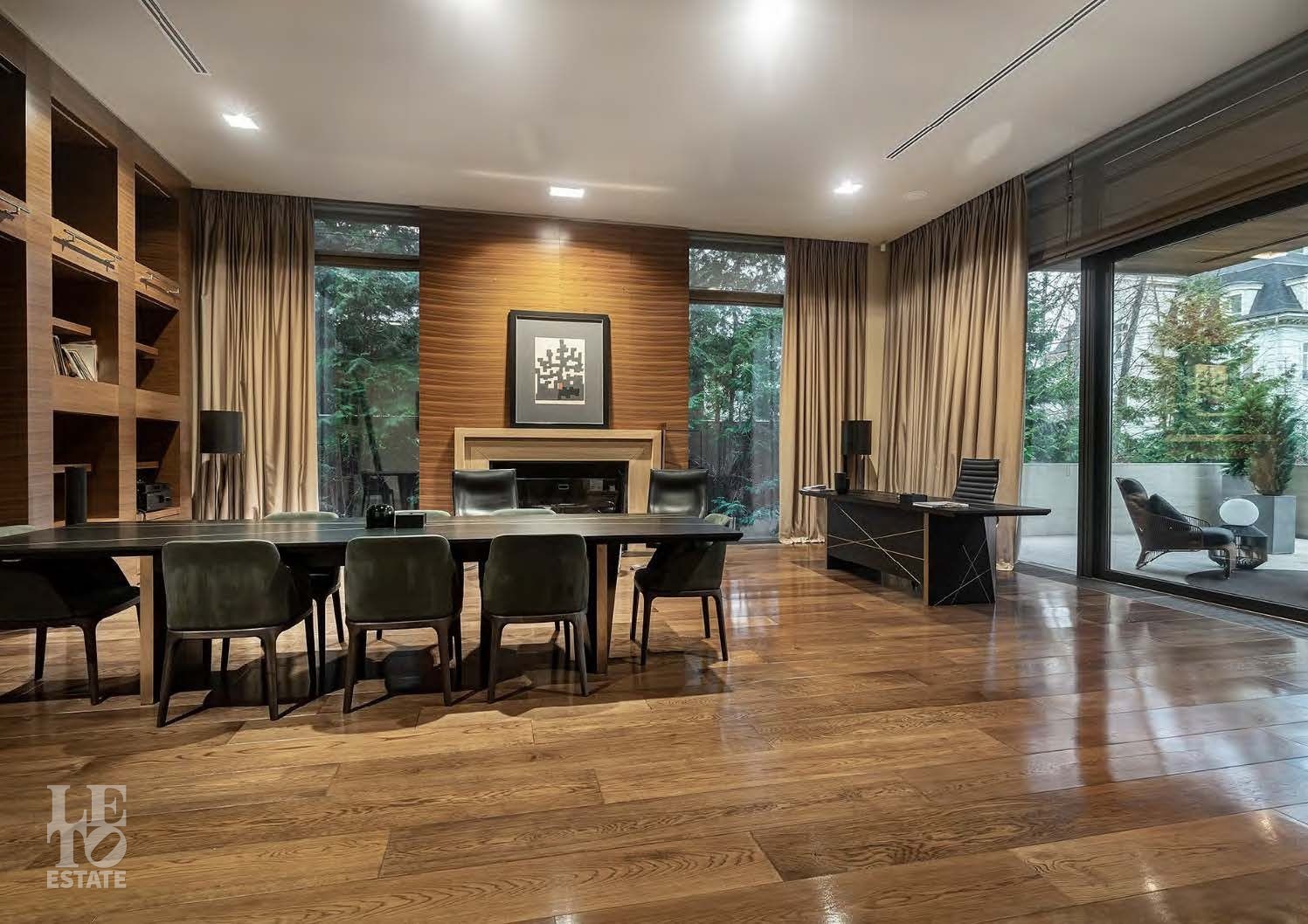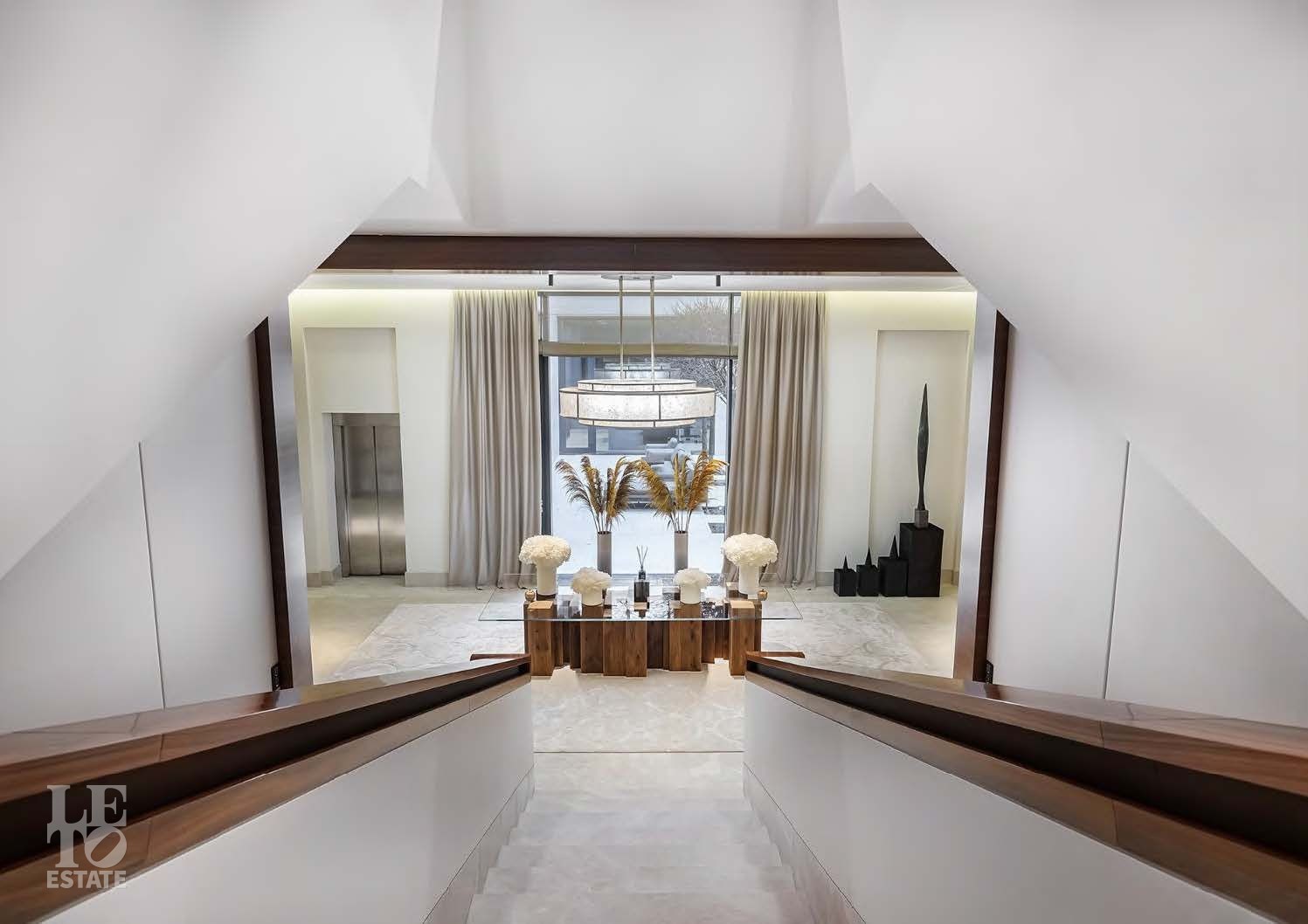 Вилла выполнена в стиле модерн. Входная группа – входные двери высотой около 4 м со скульптурными бронзовыми ручками. Зал с высокими потолками (3,9 м) украшен авторскими скульптурами и мебелью, изготовленной на заказ. Пространство построено в теплом и