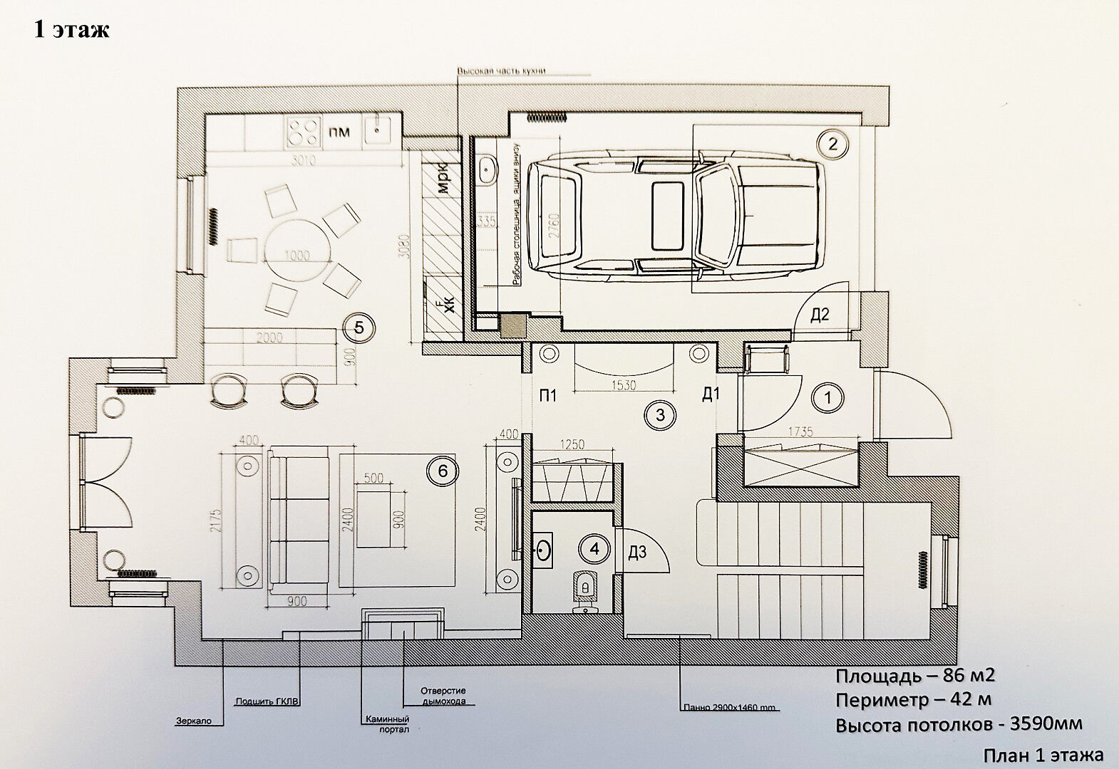 Первый этаж: кухня-гостиная, гостевой с/у, прихожая, гараж;