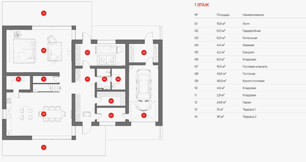 Первый этаж: прихожая, гостиная с выходом на террасу, санузел, кухня-столовая с выходом на террасу, SPA-зона (хаммам), котельная, гараж на один автомобиль;