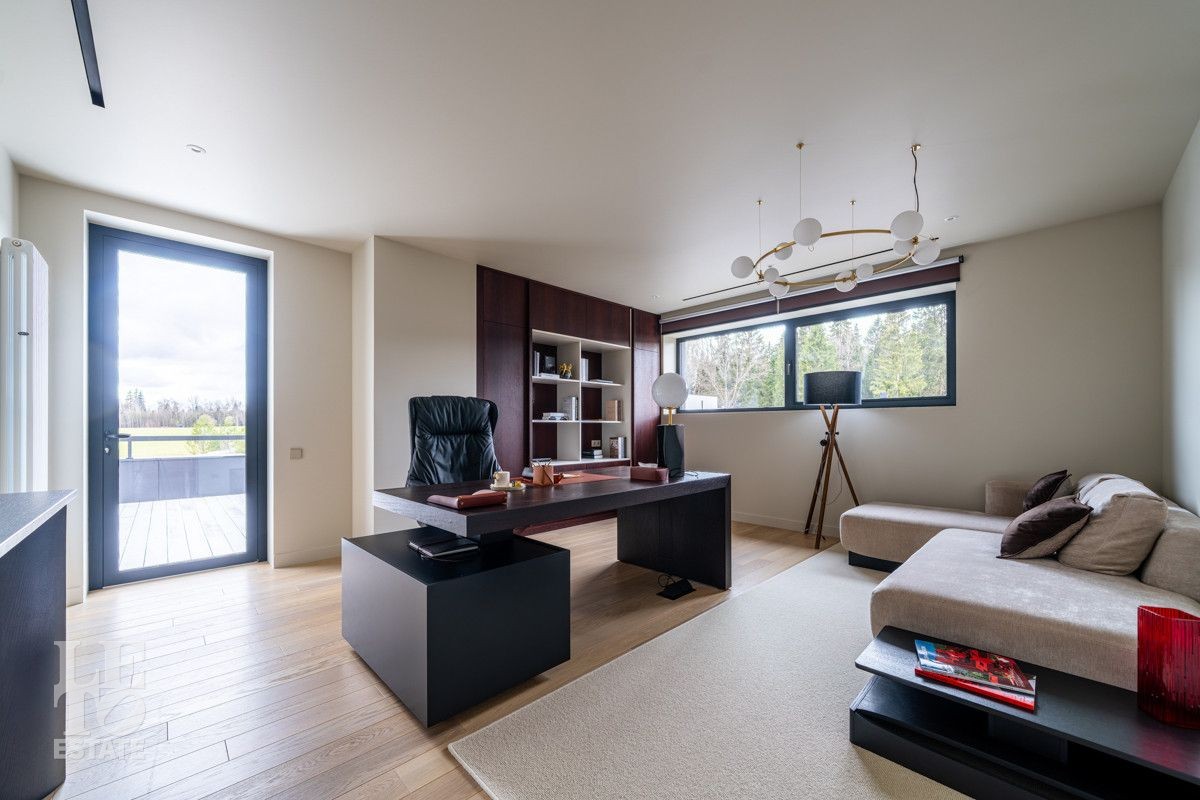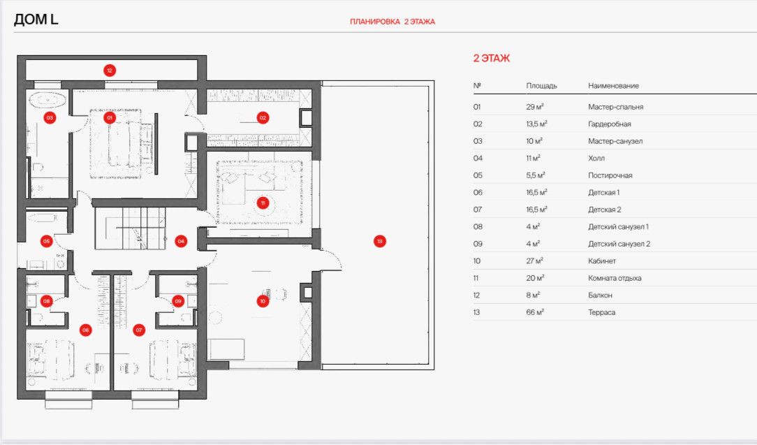 Второй этаж: мастер-спальня, гардеробная, ванная комната, терраса, кабинет, комната отдыха, балкон, детская спальня, санузел, детская спальня, санузел, гостевая спальня.
