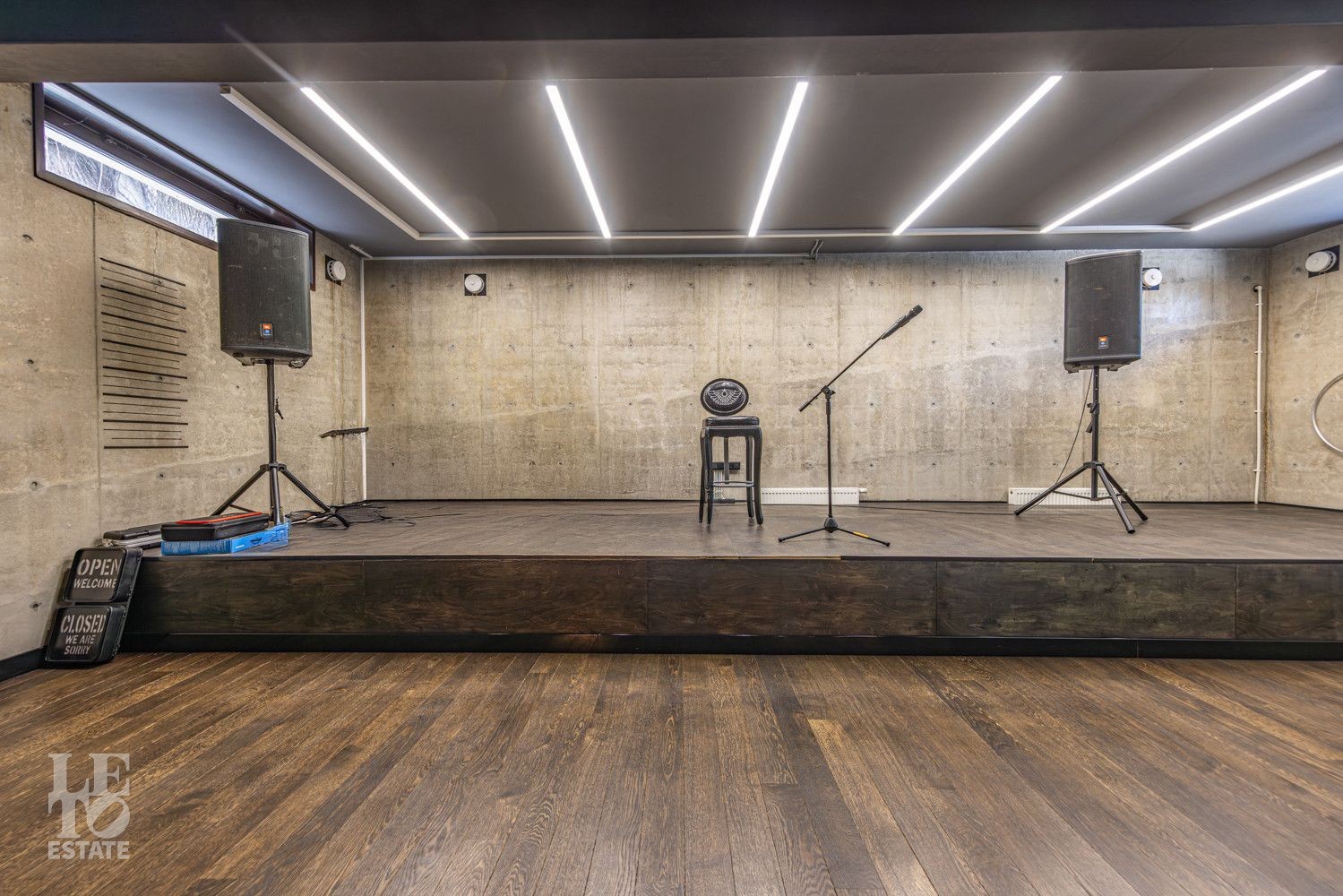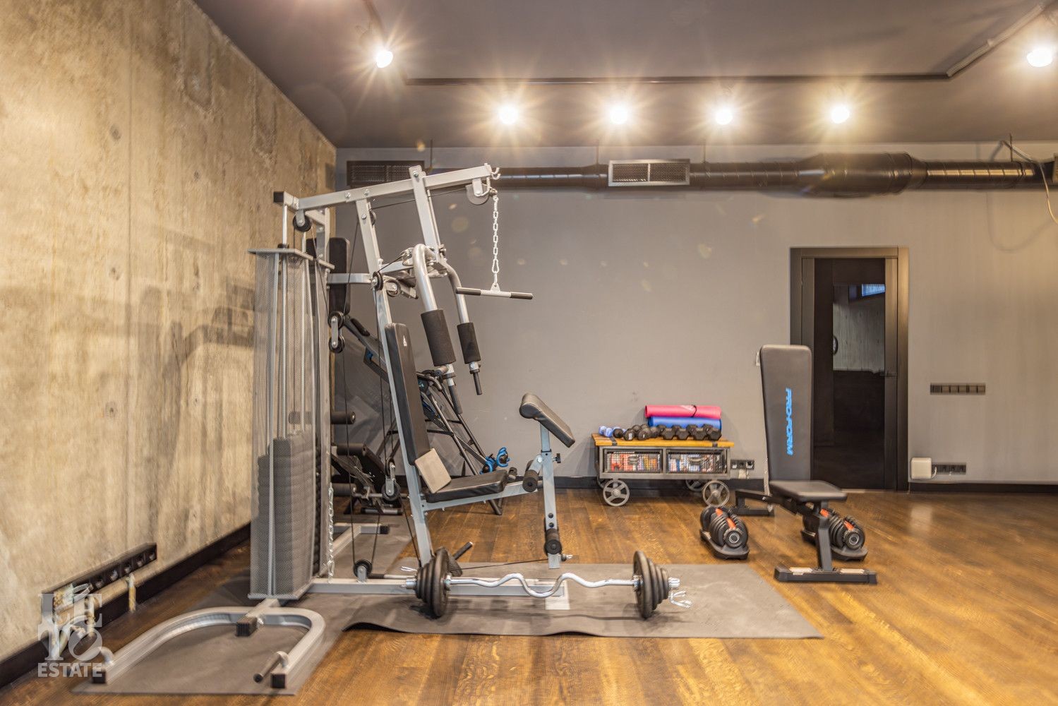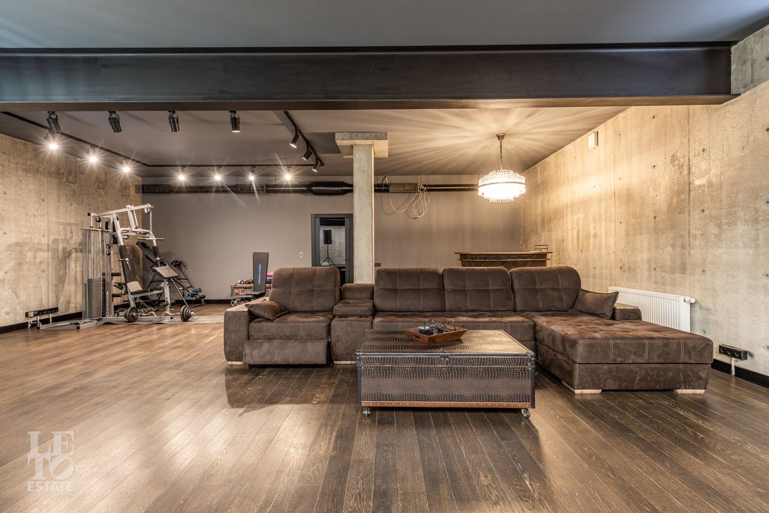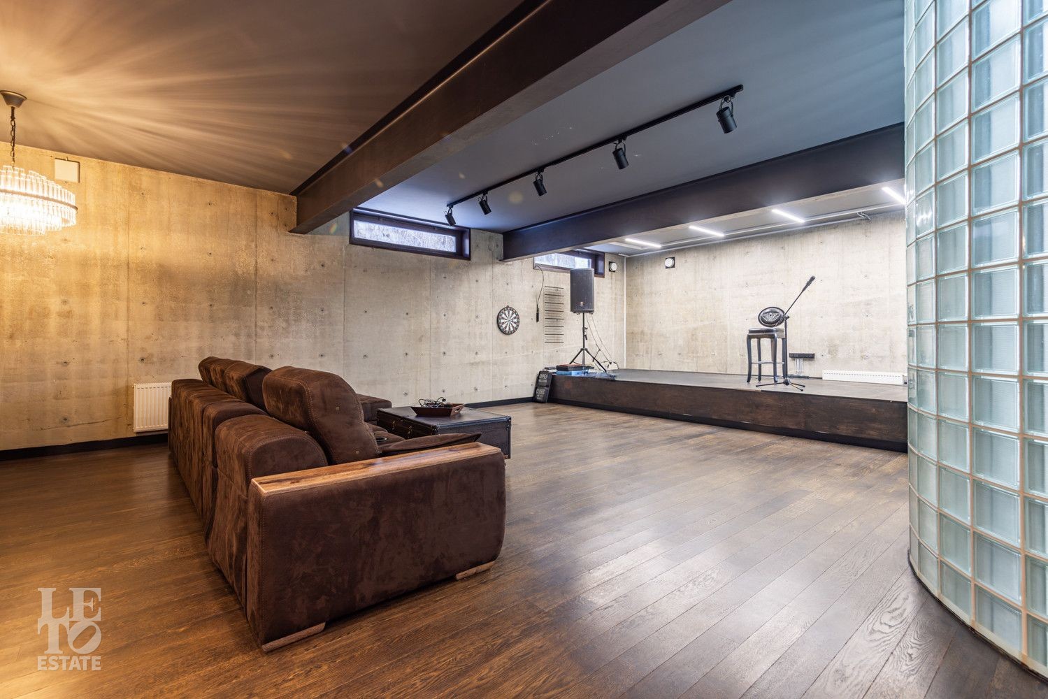 Цокольный этаж: большой зал в стиле лофт с сценой и музыкальным оборудованием, домашний спортзал, спальня, сауна, хамам, душевая, постирочная, санузел;
