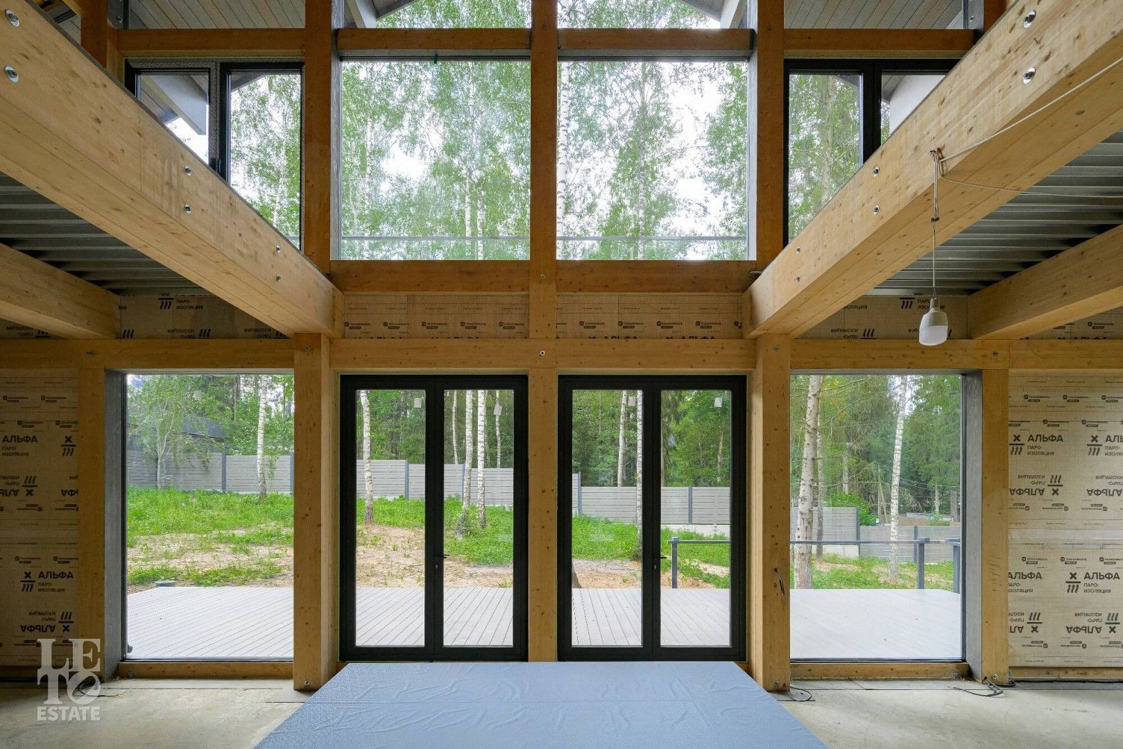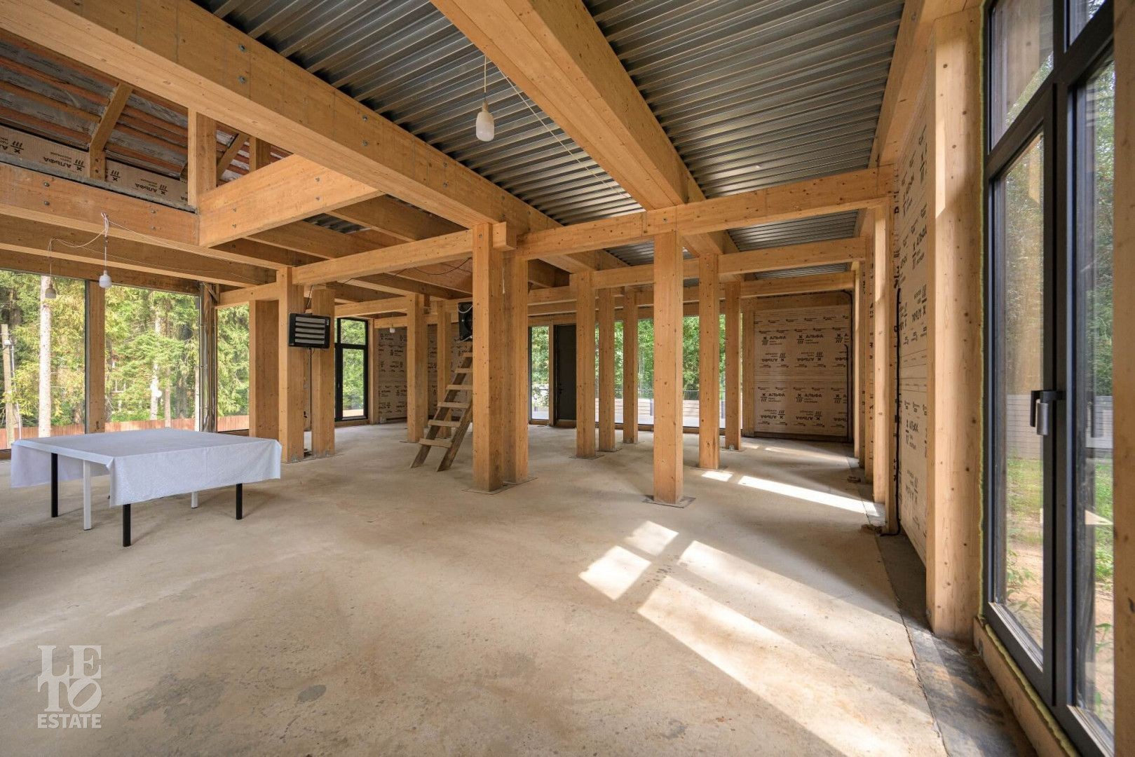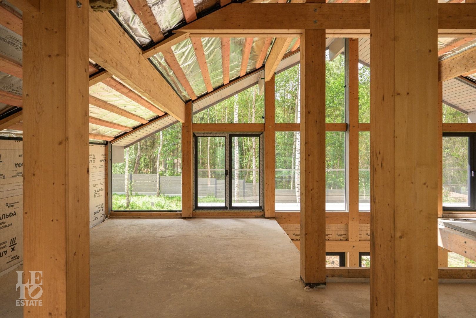 Дом построен по технологии фахверк. Использовались дорогие материалы: клееный брус с увеличенным сечением 27×30, алюминиевые окна Alutech, фальцевая кровля, монолитный цоколь, железо-бетонные перекрытия. Текущее состояние - “под отделку”. Установлен временный котел. Выполнена вечерняя подсветка фасада.