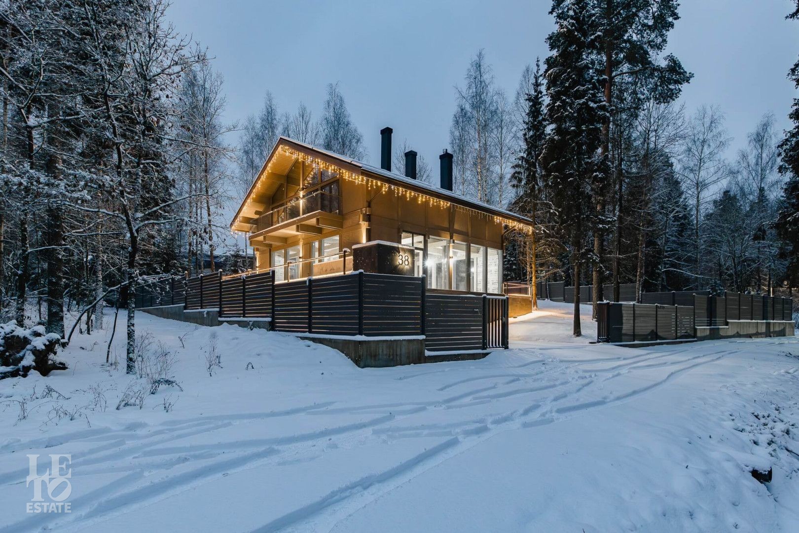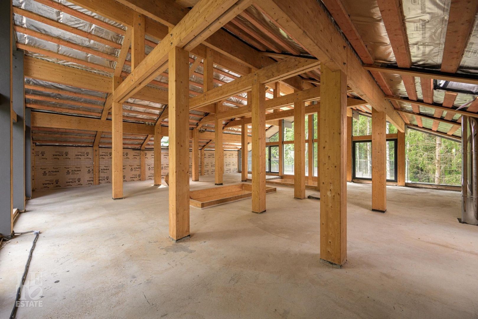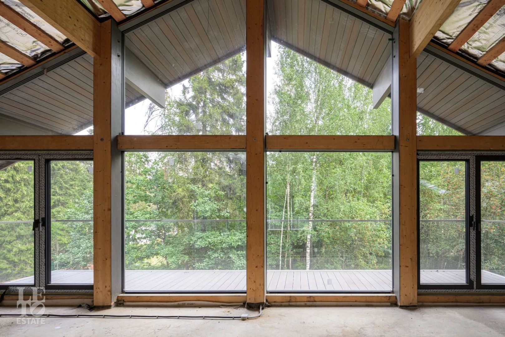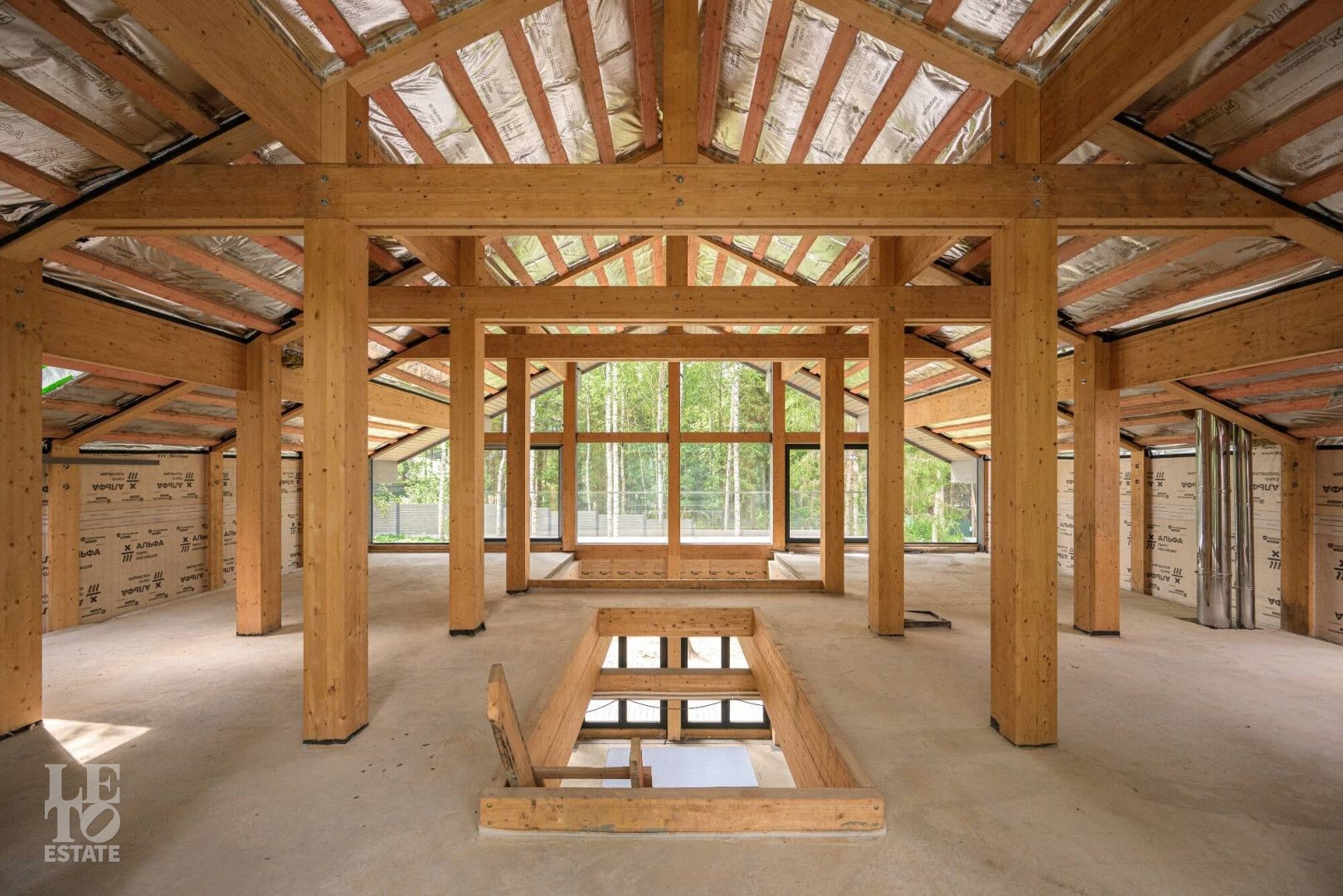 Дом построен по технологии фахверк. Использовались дорогие материалы: клееный брус с увеличенным сечением 27×30, алюминиевые окна Alutech, фальцевая кровля, монолитный цоколь, железо-бетонные перекрытия. Текущее состояние - “под отделку”. Установлен временный котел. Выполнена вечерняя подсветка фасада.