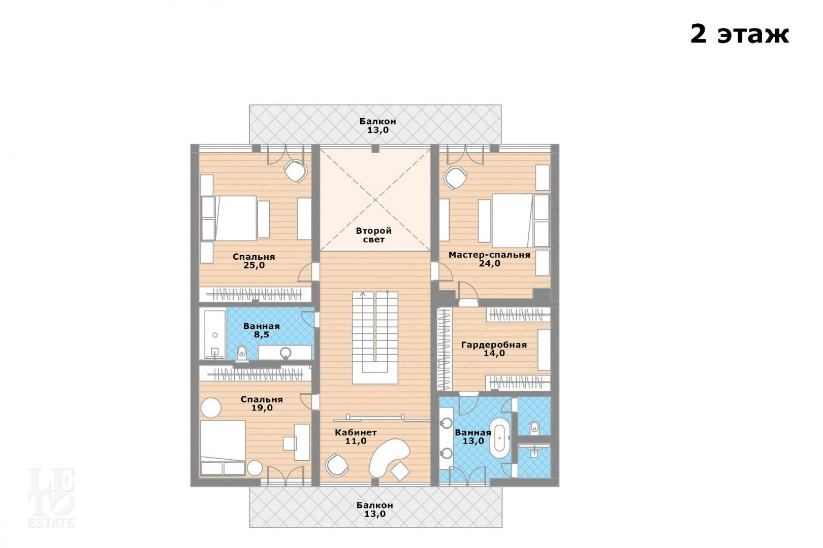 Второй этаж: мастер-спальня с гардеробной и ванной комнатой, две спальни, ванная комната, кабинет, балконы.