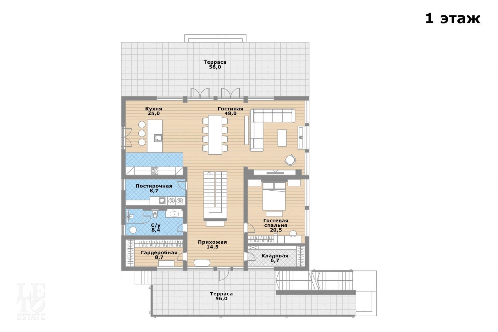 Первый этаж: прихожая с гардеробной, кухня, столовая-гостиная со вторым светом, гостевая спальня, санузел, постирочная, кладовая, террасы;