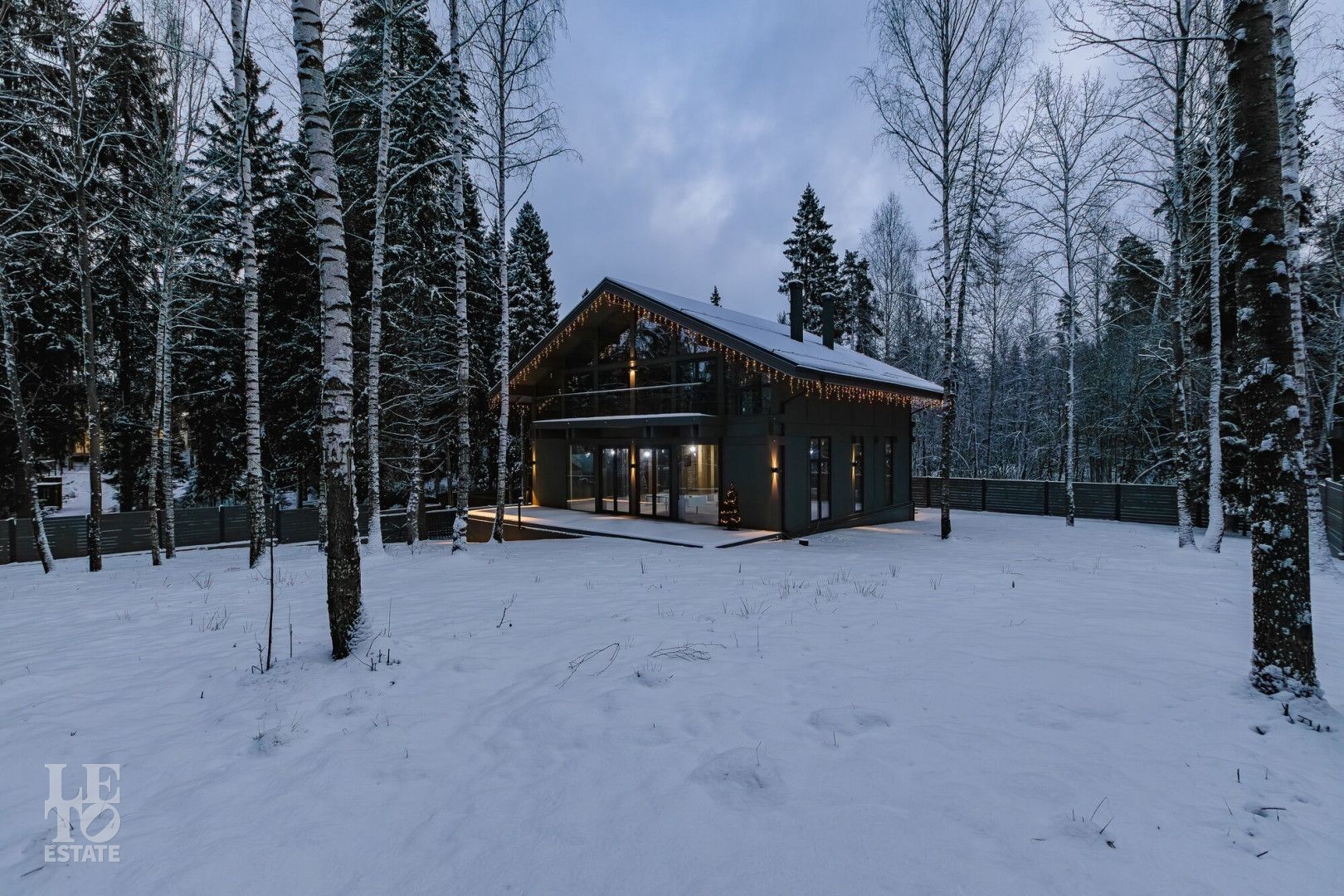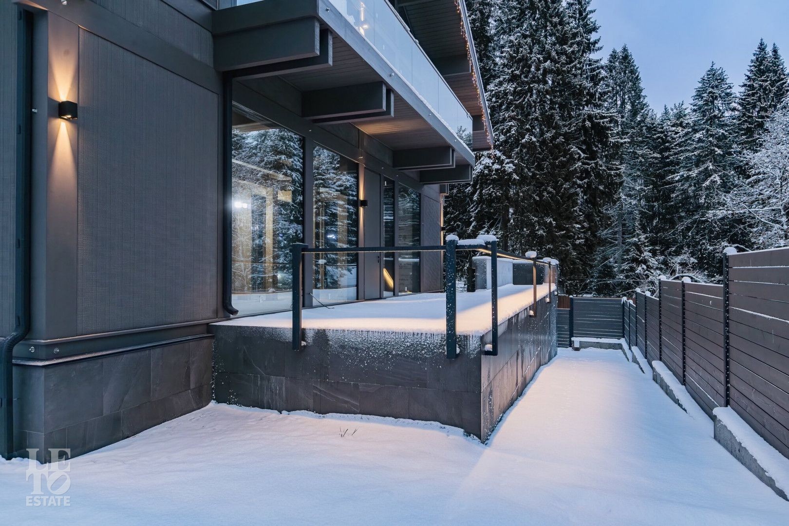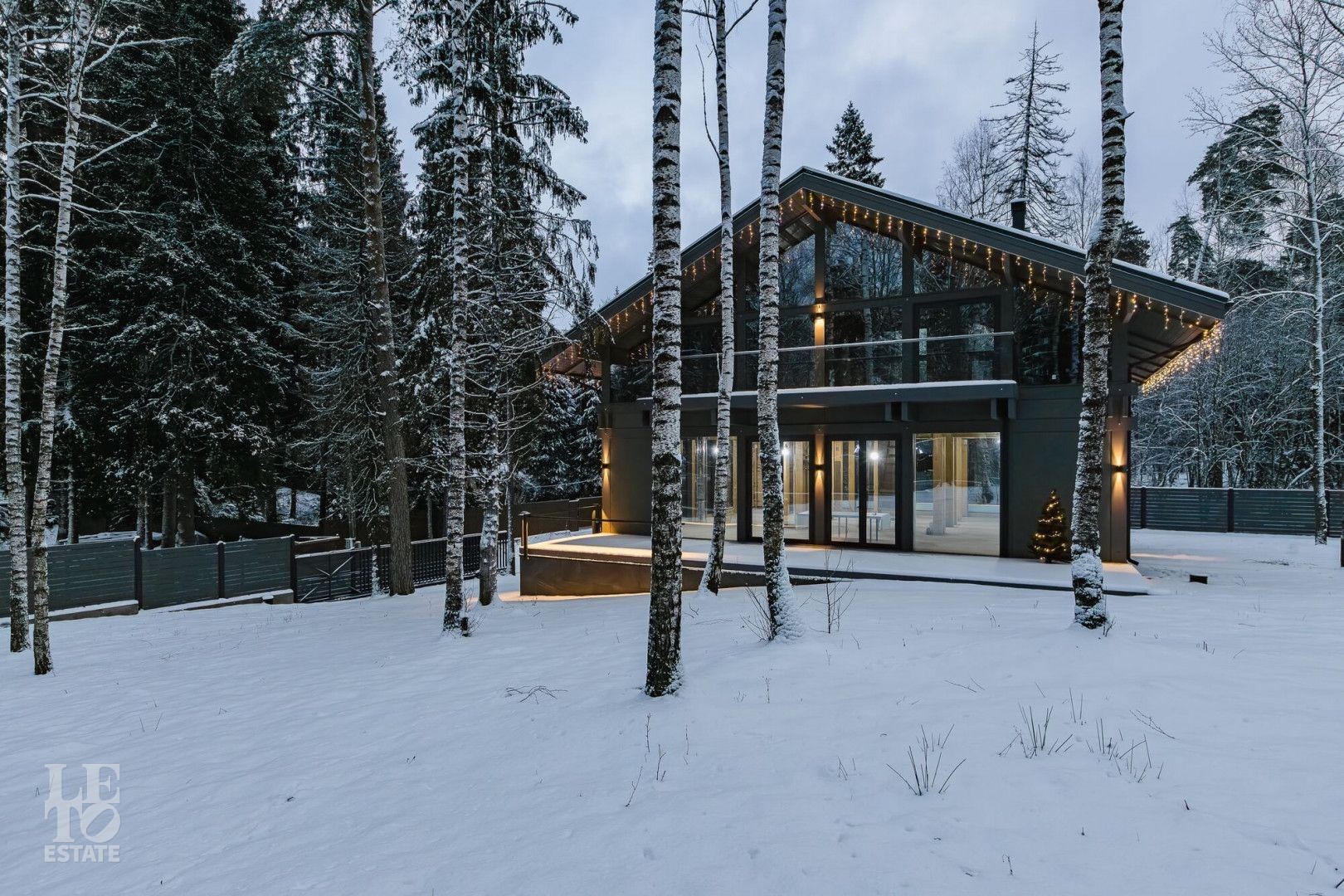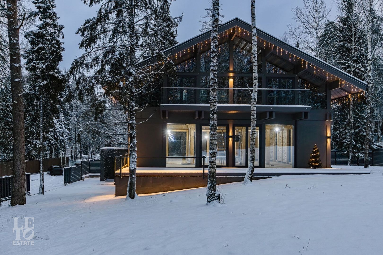 Премиальный дом статно вписан в естественный ландшафт участка, а большое остекление выигрышно наполняет дом светом и живописными видами, расширяя границы участка.