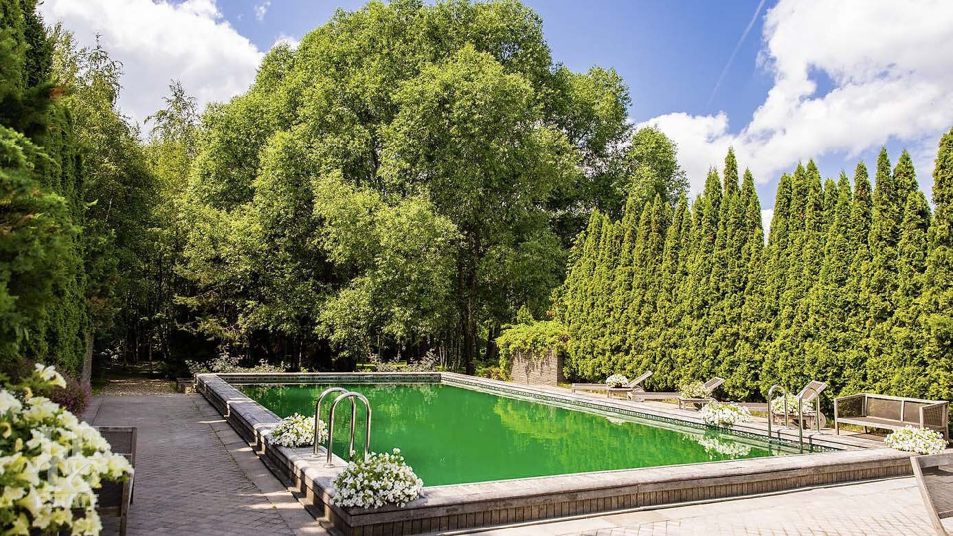 На участке есть отдельно стоящий дом для персонала с двумя блоками, чайный домик и уличный бассейн.