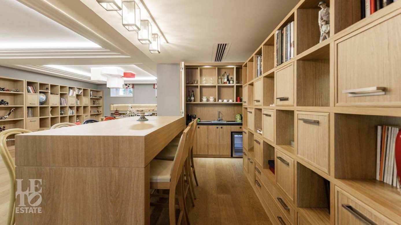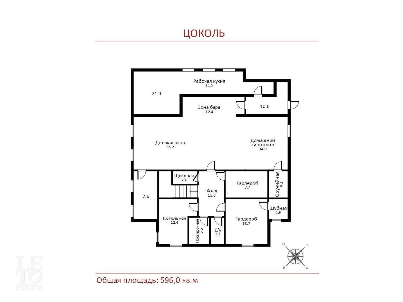 Цокольный этаж: зона бара, домашний кинотеатр, детская зона, оружейная, шубная, щитовая, котельная, рабочая кухня, постирочная, гардеробные комнаты, санузел, холл, дополнительные свободные помещения.