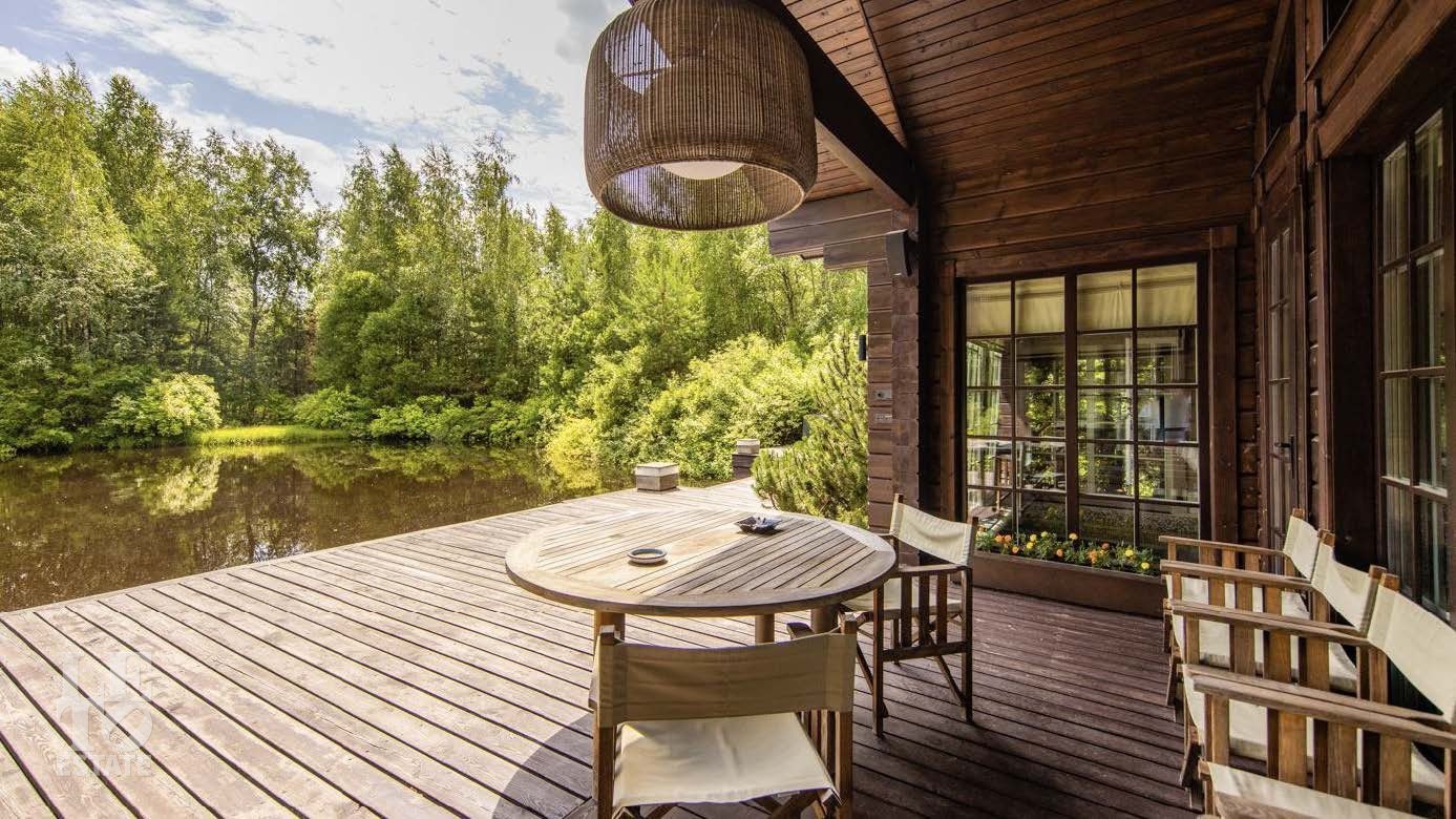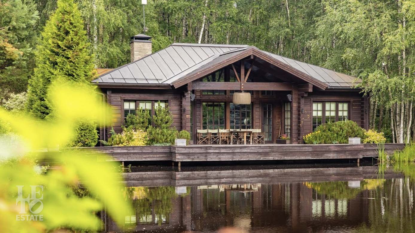 Дом гармонично вписывается в природный ландшафт. Деревянный банный комплекс, построенный из натурального дерева, создает ощущение тепла и уюта. Он расположен на берегу искусственного водоема, что добавляет ему уникальности.