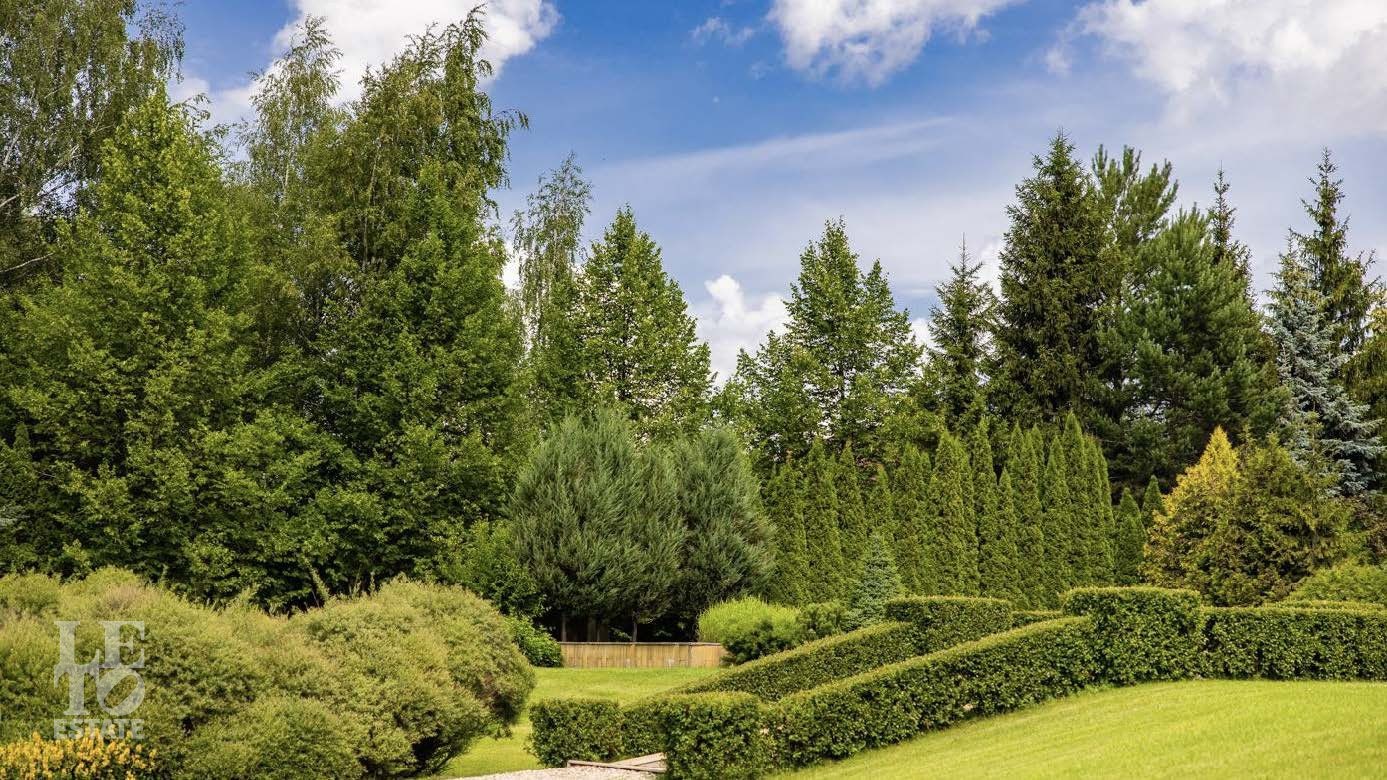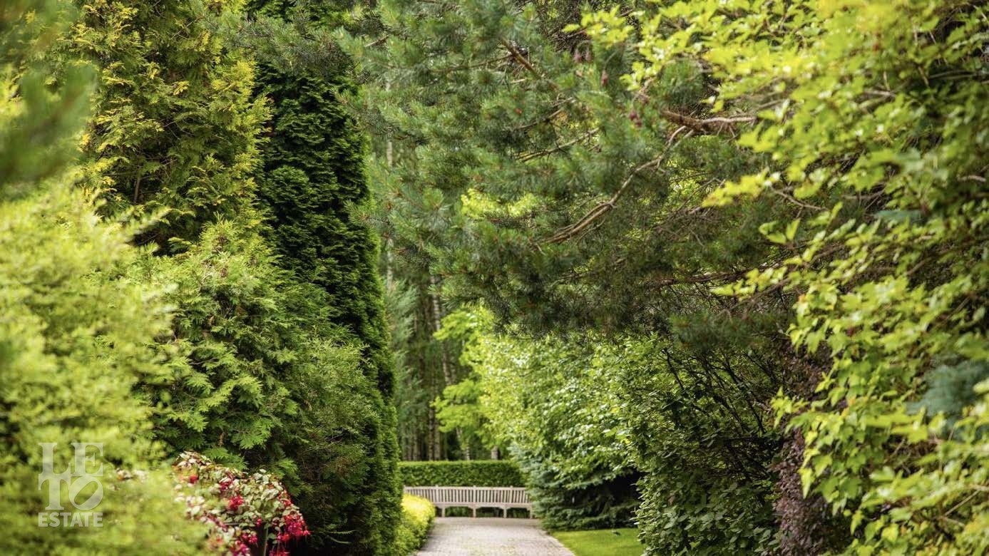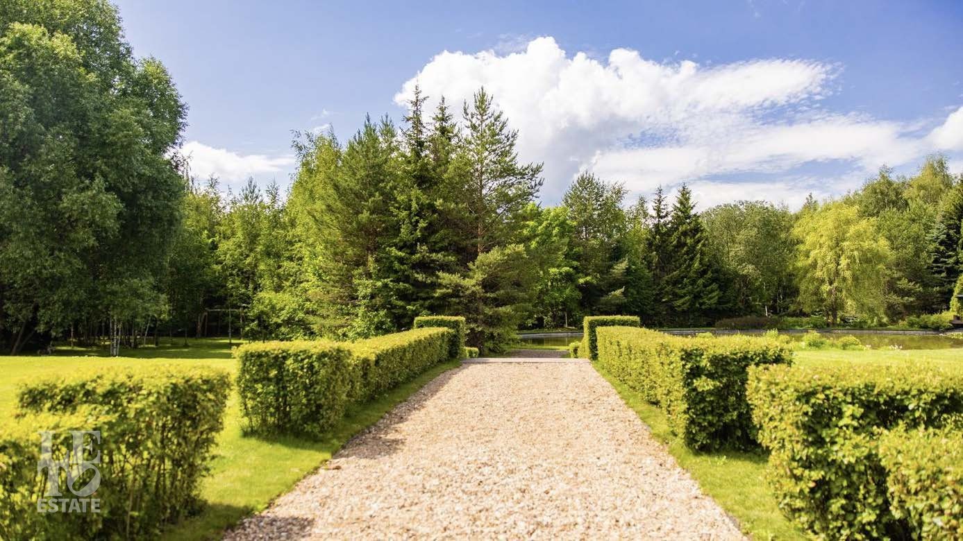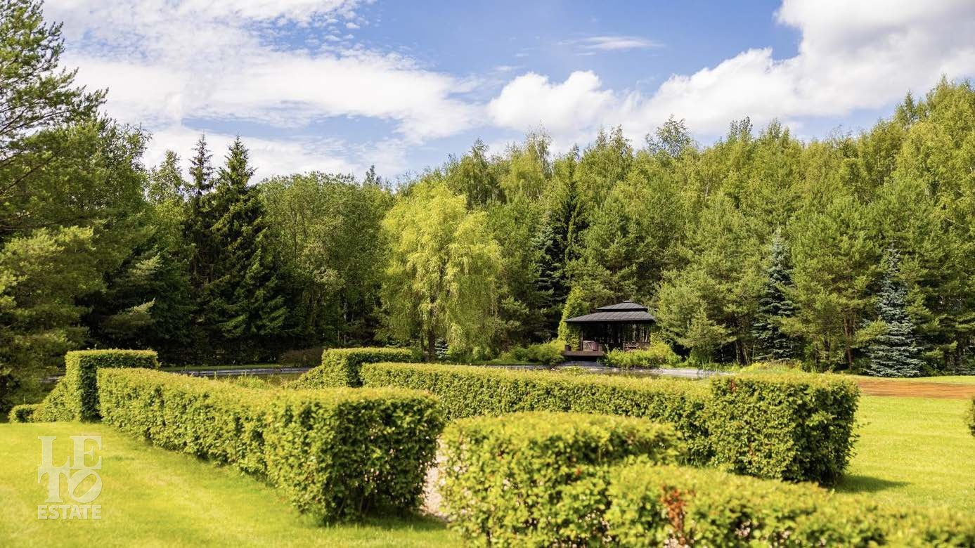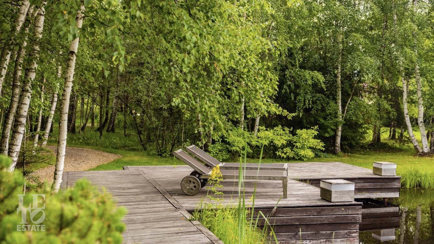 На территории в 2 гектара разбит полноценный парковый ансамбль с искусственными озерами, прогулочными аллеями и взрослыми хвойными деревьями. Аромат соснового леса и живописный ландшафт создают особую атмосферу. Здесь также находятся отдельно стоящий гаражный комплекс на 4 машино-места с блоком для персонала, гостевой дом и банный комплекс с дизайном в стиле альпийского шале.