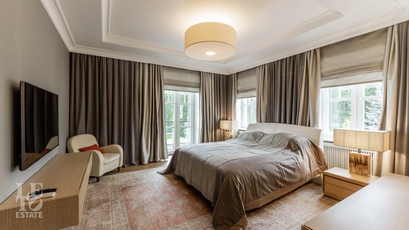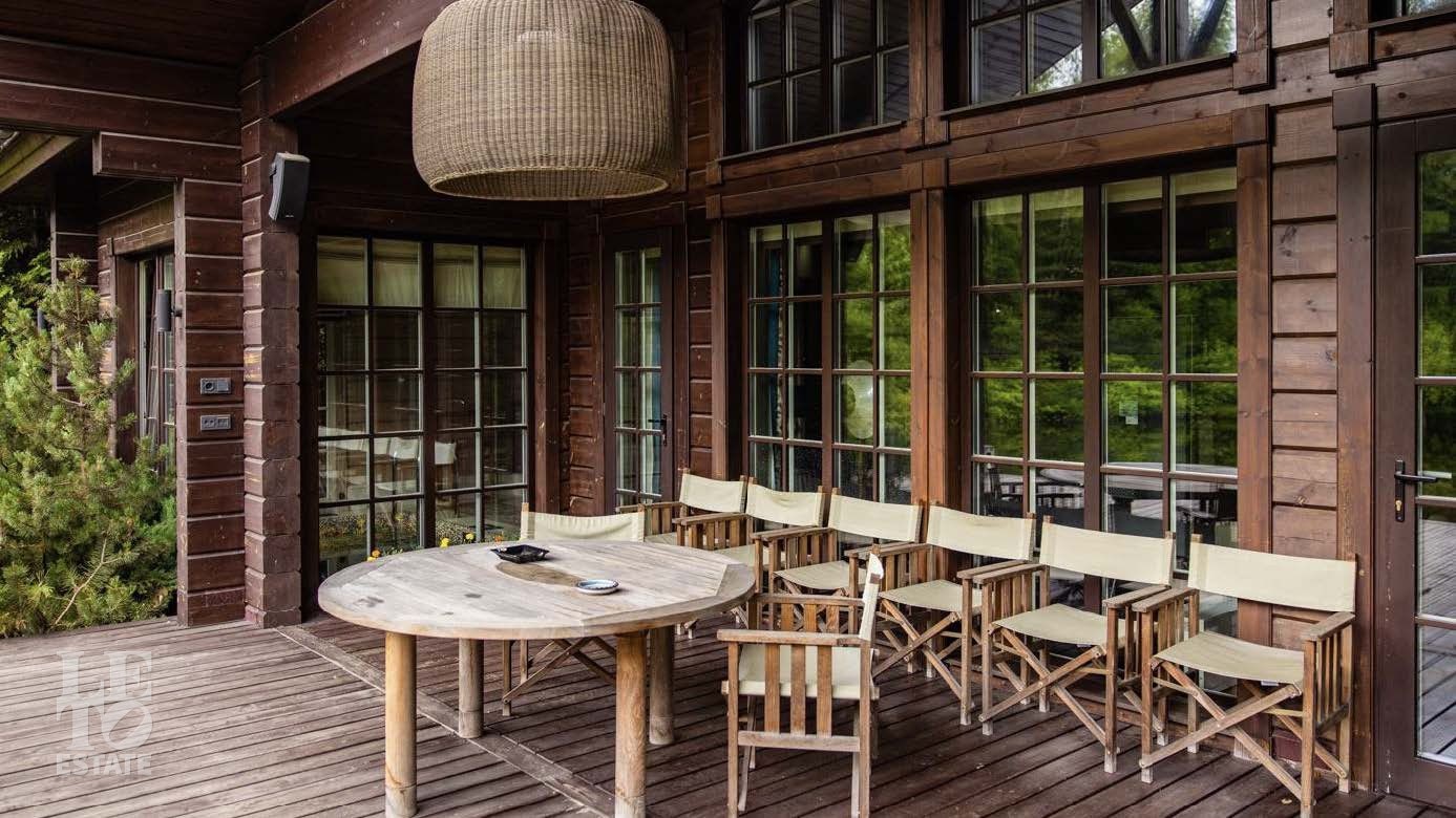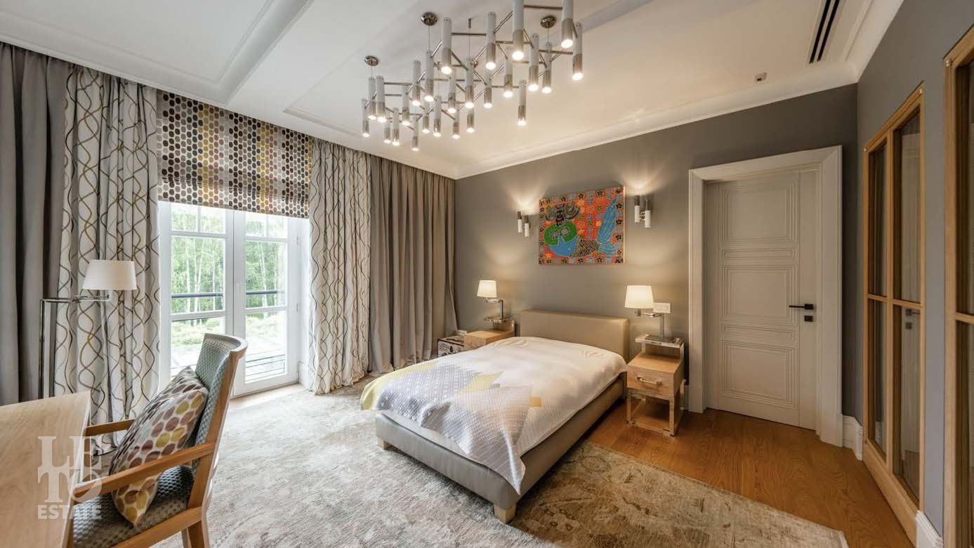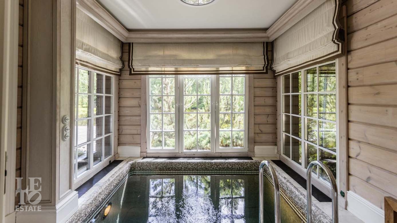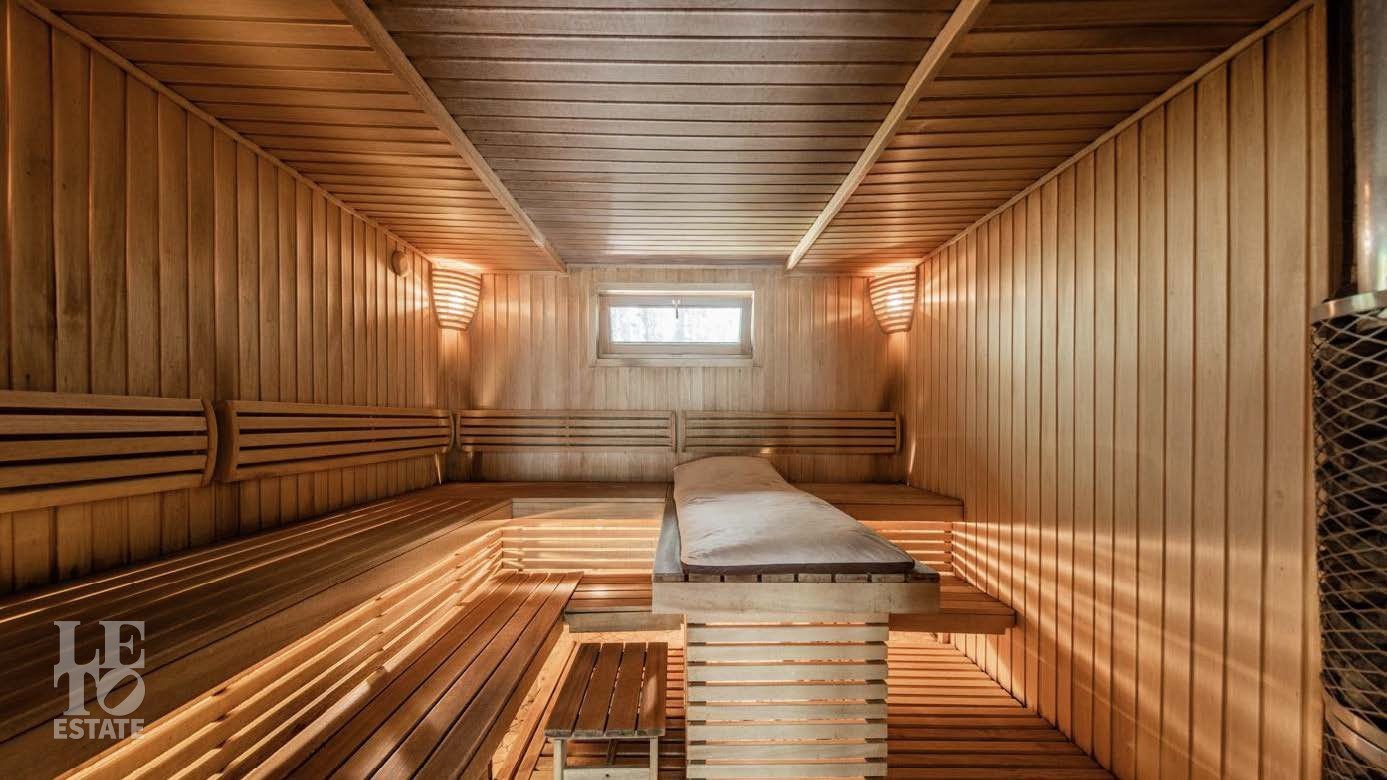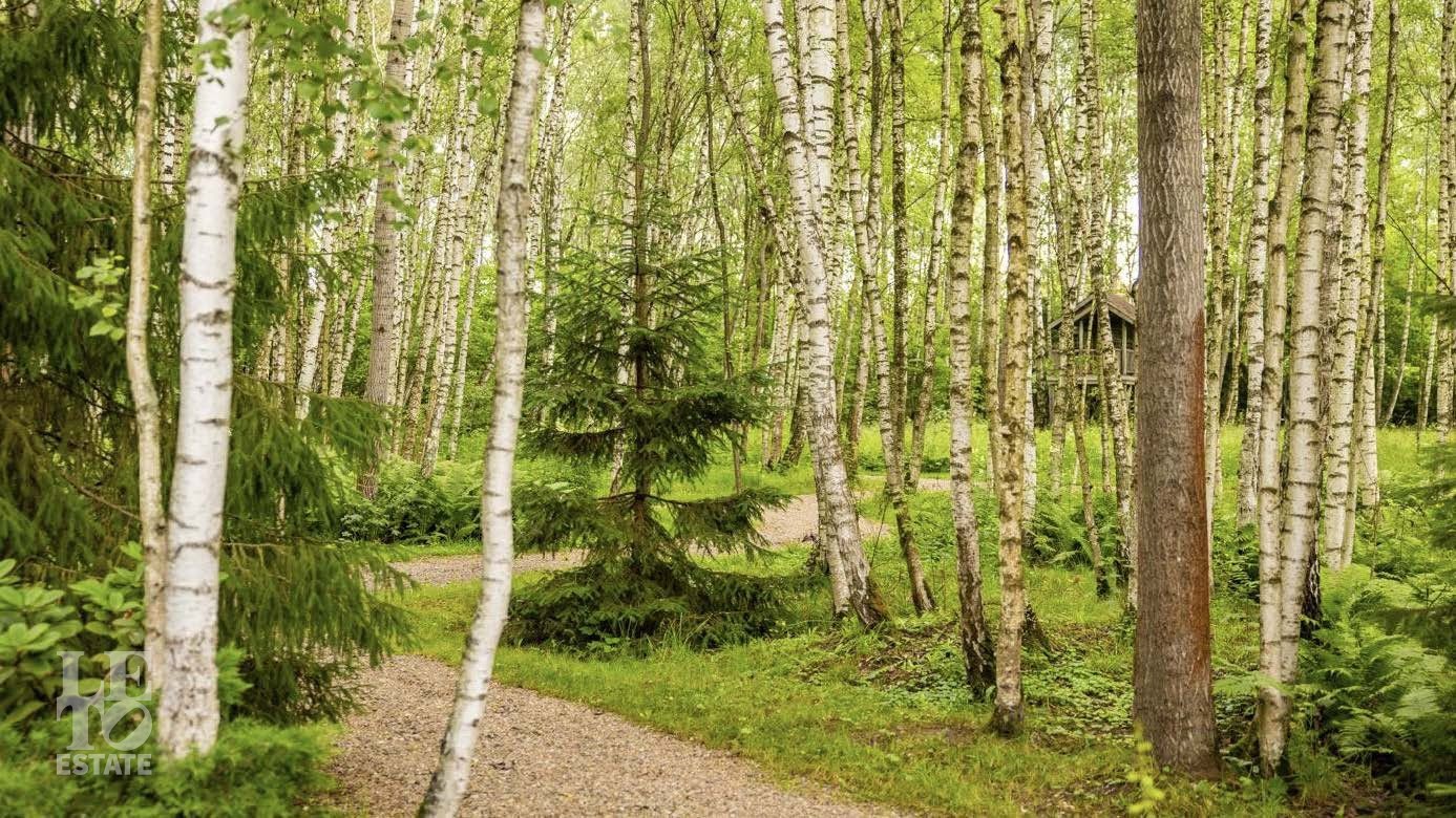 На территории в 2 гектара разбит полноценный парковый ансамбль с искусственными озерами, прогулочными аллеями и взрослыми хвойными деревьями. Аромат соснового леса и живописный ландшафт создают особую атмосферу. Здесь также находятся отдельно стоящий гаражный комплекс на 4 машино-места с блоком для персонала, гостевой дом и банный комплекс с дизайном в стиле альпийского шале.