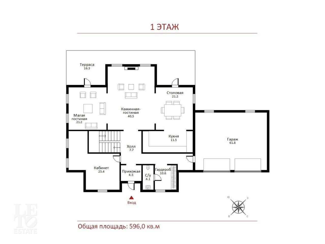 Первый этаж: кухня, столовая, каминная-гостиная и малая гостиная с выходом на открытую террасу, терраса, кабинет, гараж, санузел, прихожая, холл, гардероб, гараж на 2 м/м.