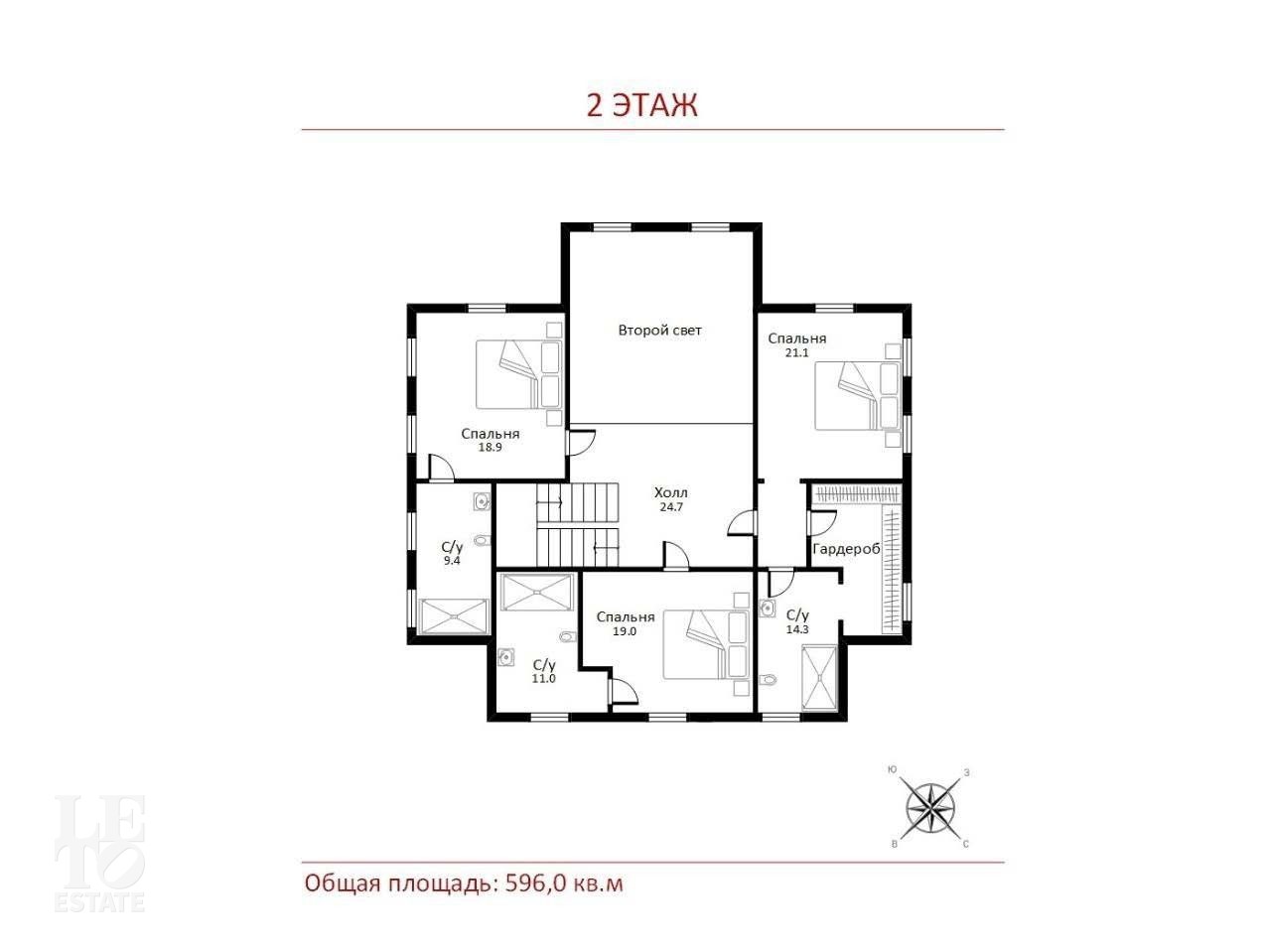 Второй этаж: мастер-спальня с гардеробной и санузлом, 2 спальни с санузлами.