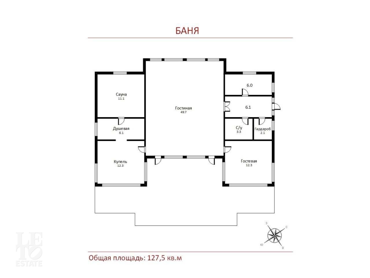 Банный комлекс: холл, гардеробная, раздевалка, совмещенная гостиная, кухня и столовая, русская баня, купель, душевая, санузел.