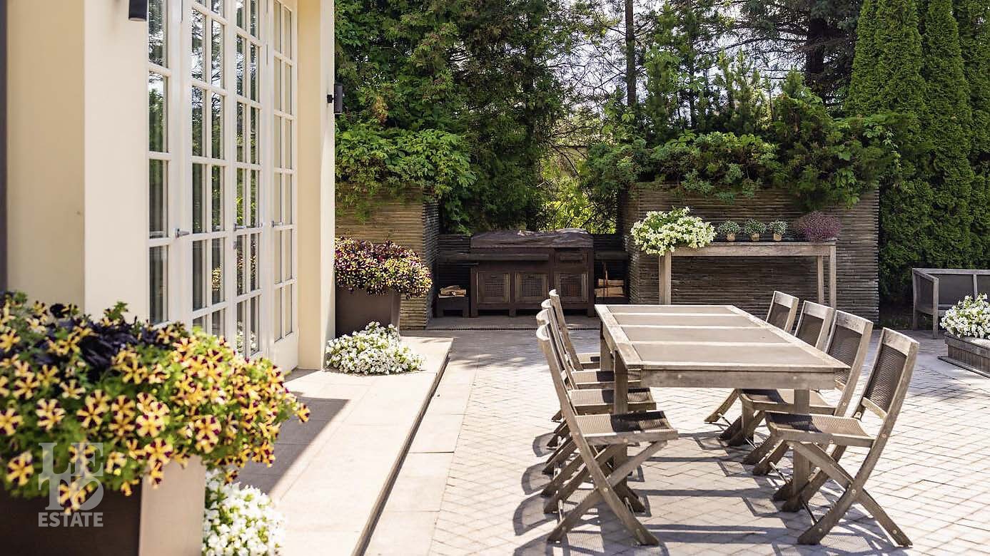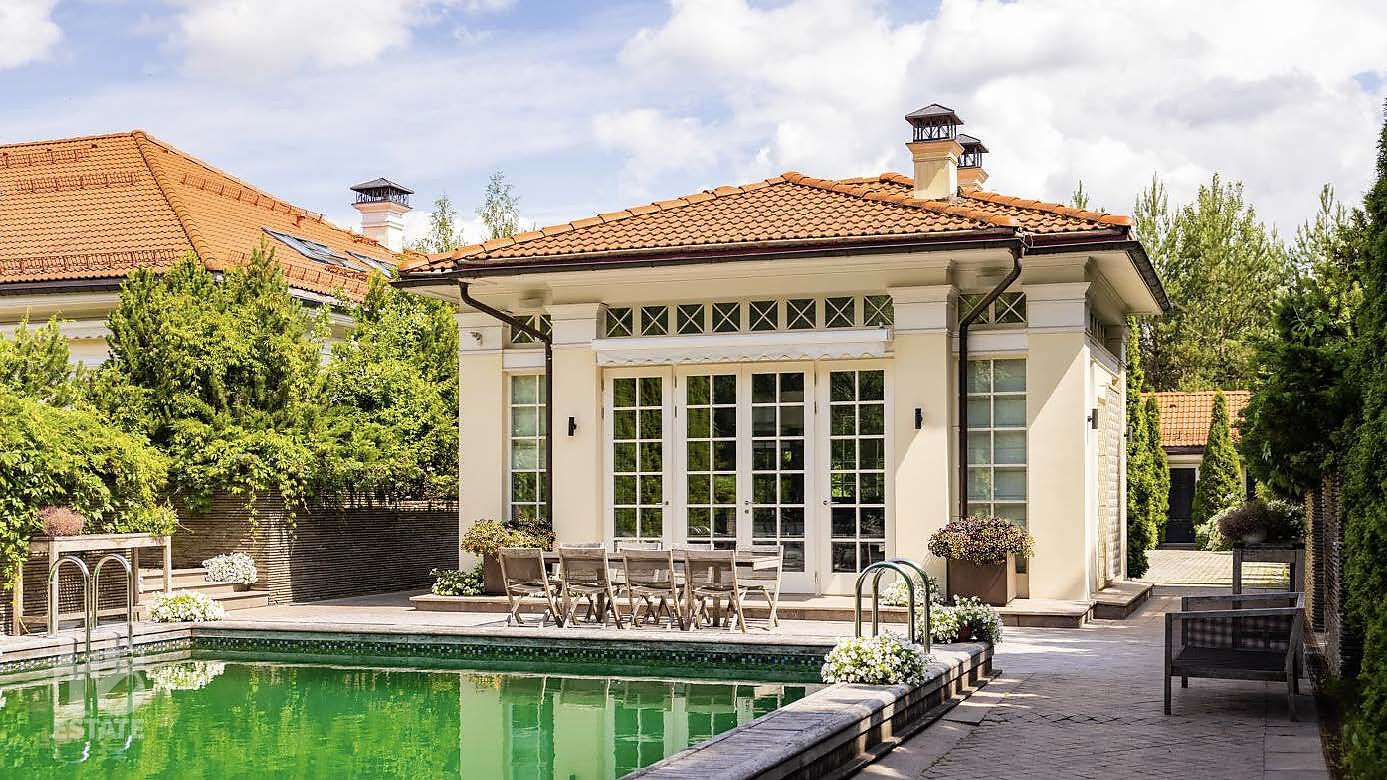 На территории также есть гостевой дом площадью 50 кв. м, отдельно стоящий гаражный комплекс на 4 машино-места с блоком для персонала, дом для персонала с двумя блоками, чайный домик и уличный бассейн. Прогулочные аллеи, зоны отдыха у воды с видовыми площадками и летний бассейн органично вписаны в ландшафт.