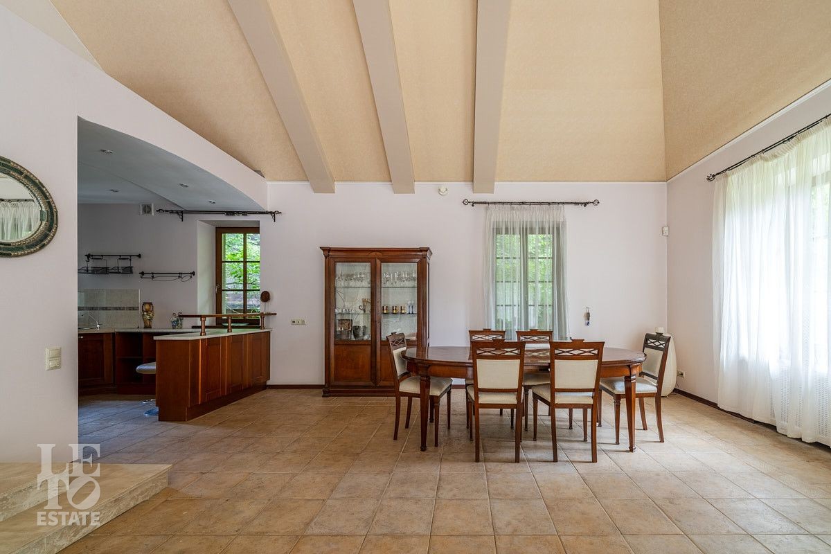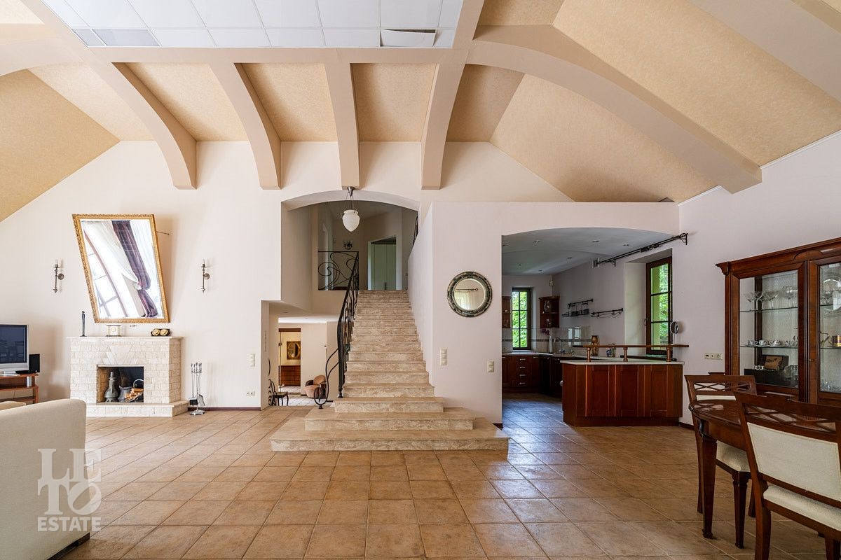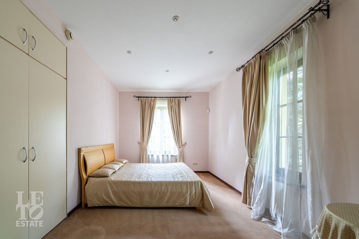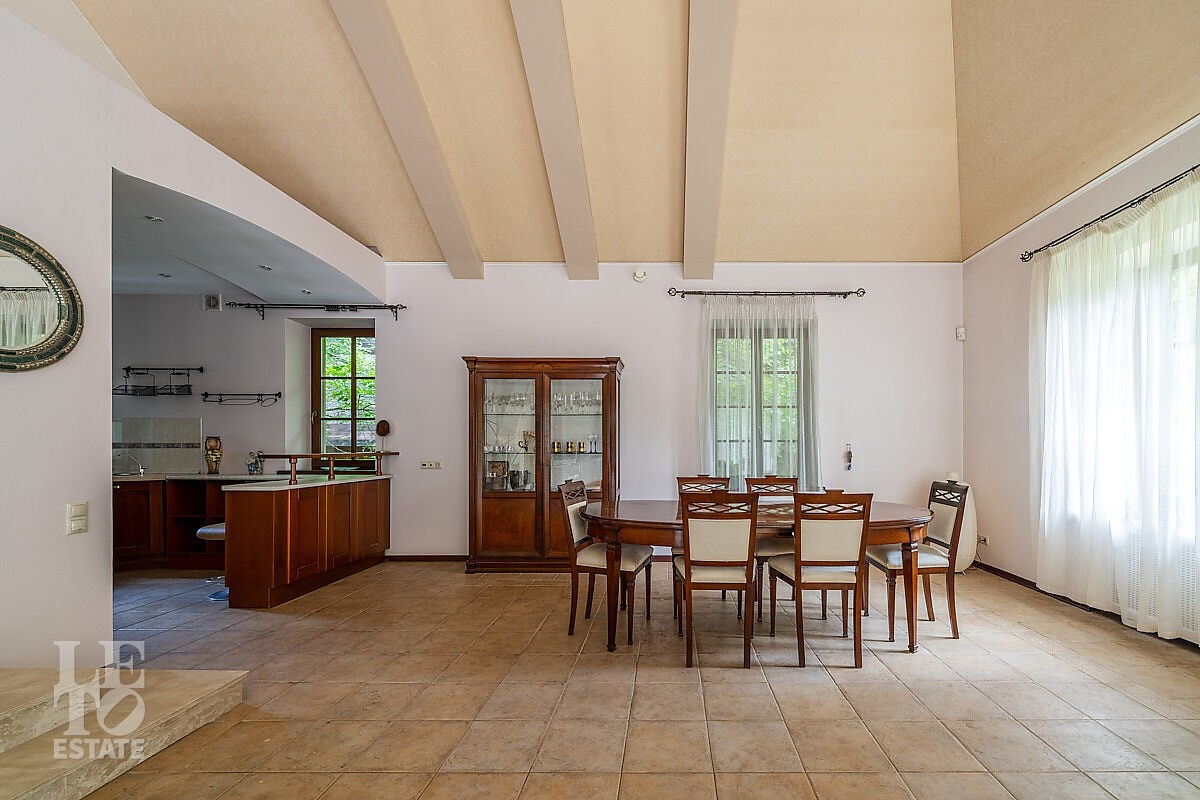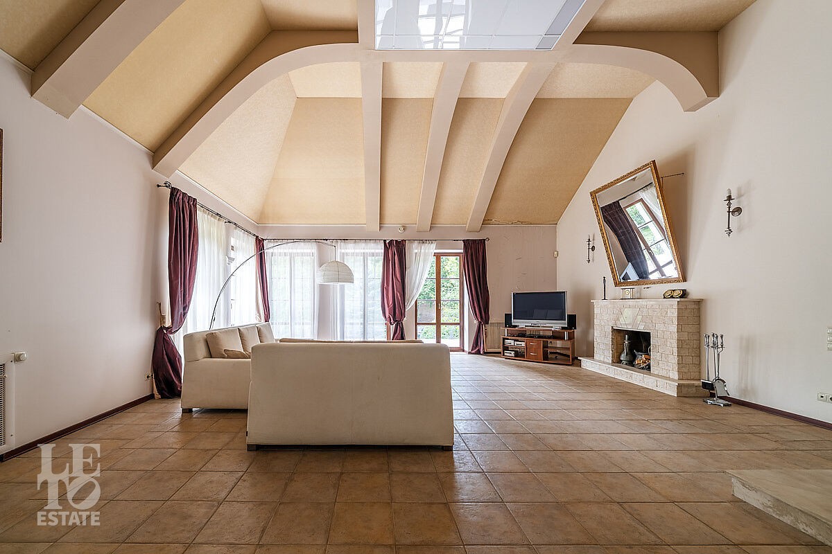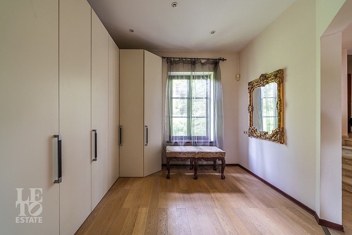 Во внутренней отделке использованы качественные дорогие материалы, ремонт выполнен в классическом стиле, дом продается полностью укомплектованным мебелью и техникой. Просторная гостиная с высоким потолком и дровяным камином, благодаря большим окнам, наполняется солнечным светом, а также имеет выход на террасу, где можно наслаждаться свежим воздухом. Также важно отметить наличие двух спален и кабинета на первом этаже дома.