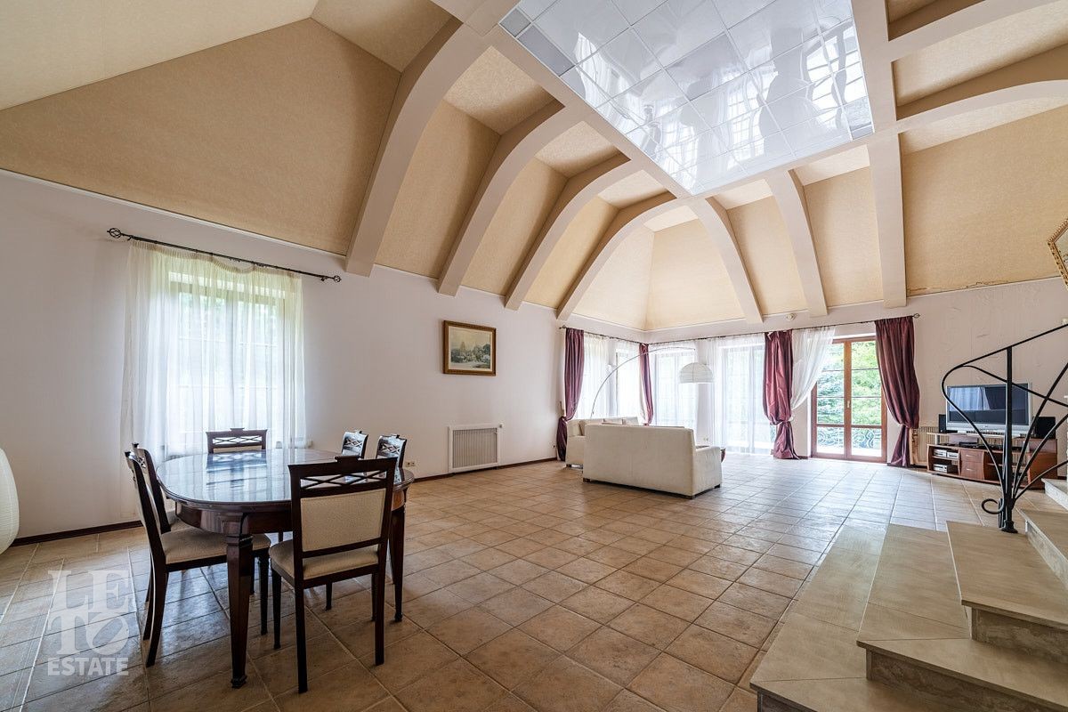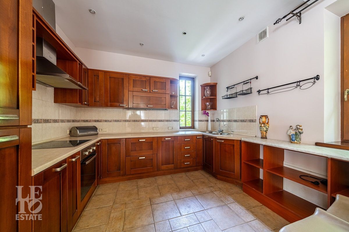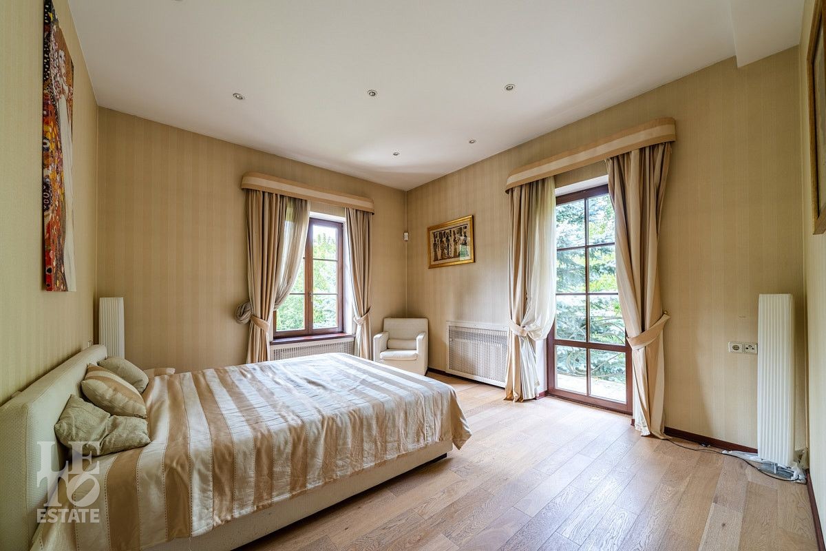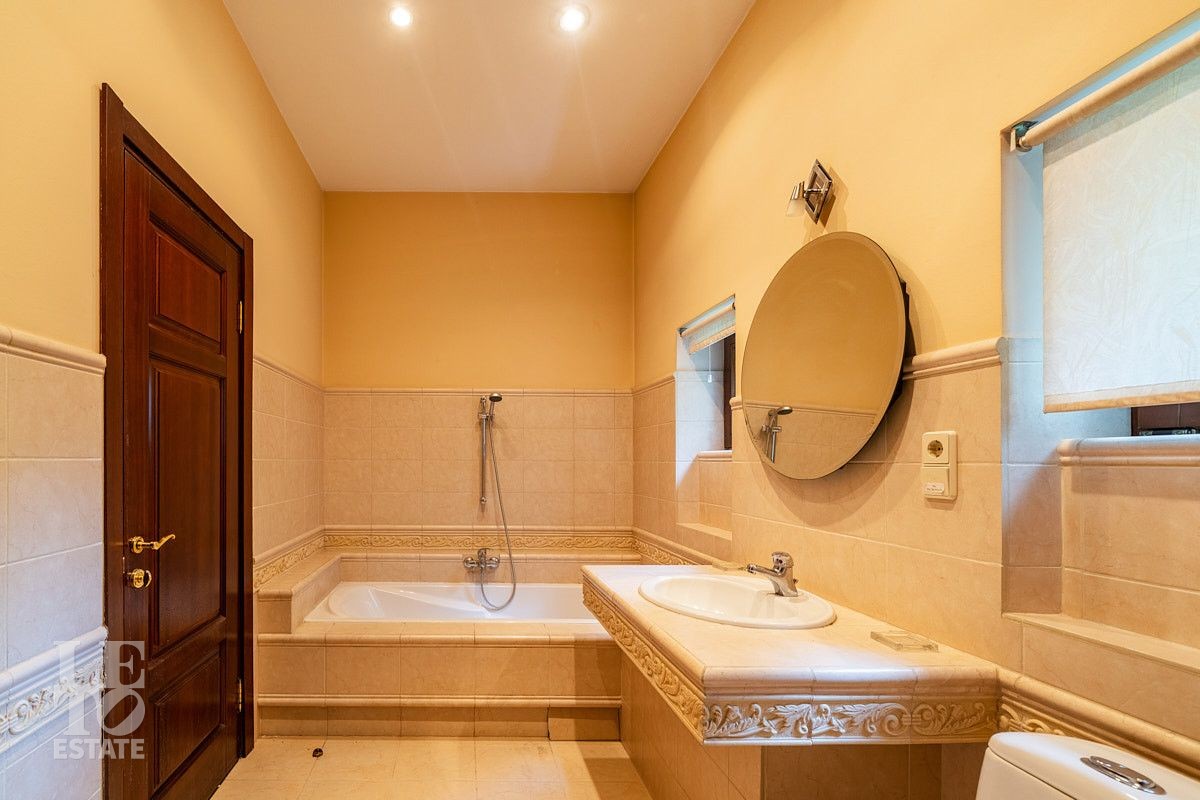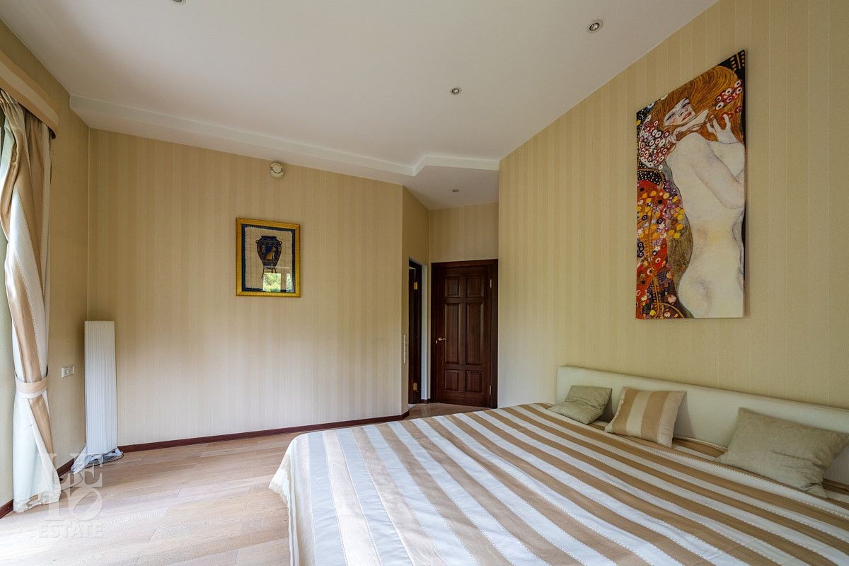 Во внутренней отделке использованы качественные дорогие материалы, ремонт выполнен в классическом стиле, дом продается полностью укомплектованным мебелью и техникой. Просторная гостиная с высоким потолком и дровяным камином, благодаря большим окнам, наполняется солнечным светом, а также имеет выход на террасу, где можно наслаждаться свежим воздухом. Также важно отметить наличие двух спален и кабинета на первом этаже дома.