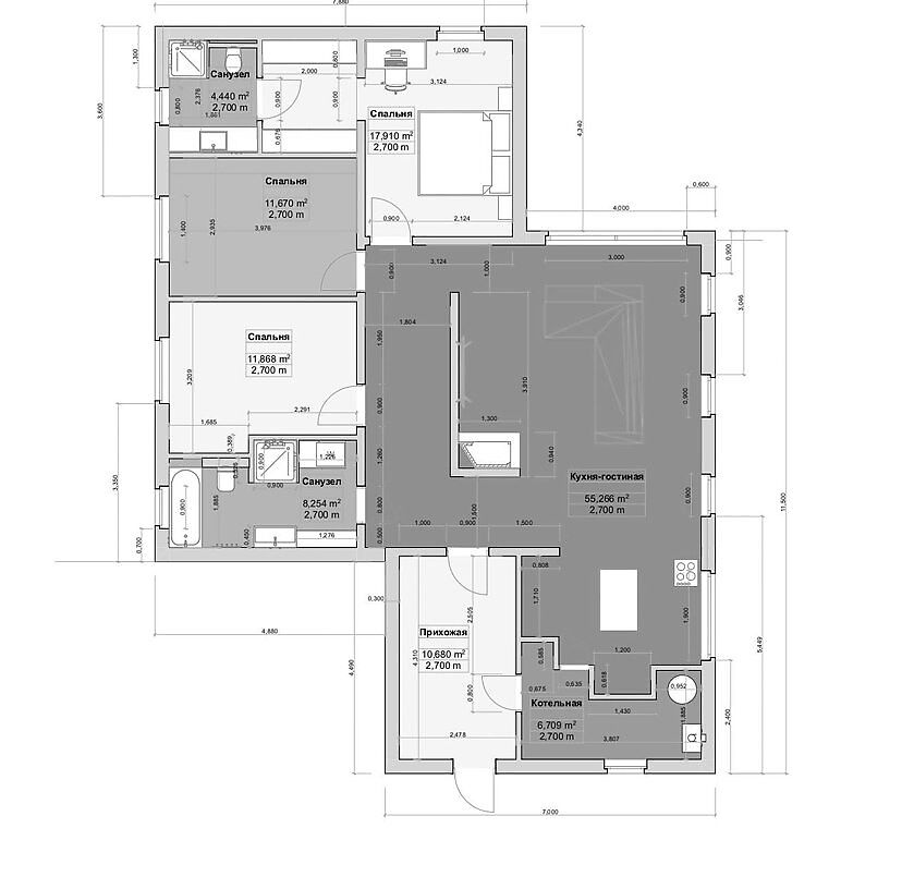 Прихожая, котельная, кухня-столовая -гостиная , основная спальня с гардеробной и санузлом, две спальни, санузел.
