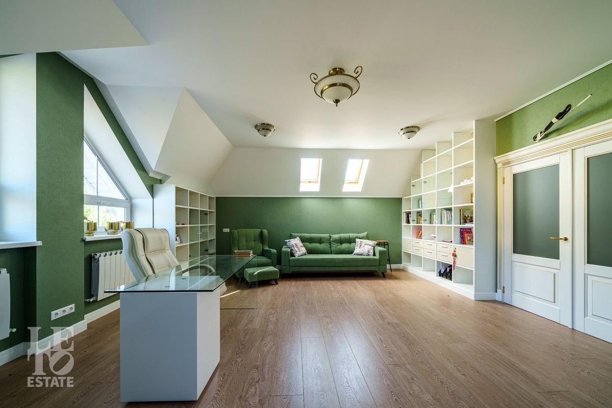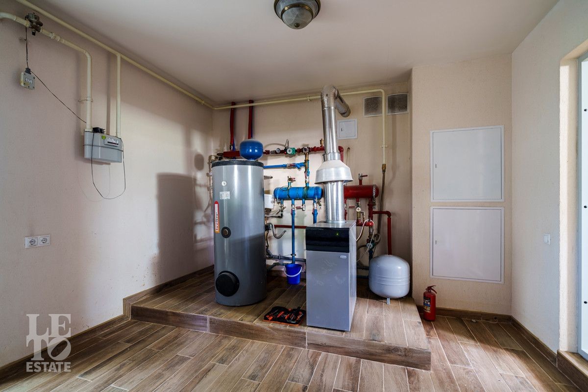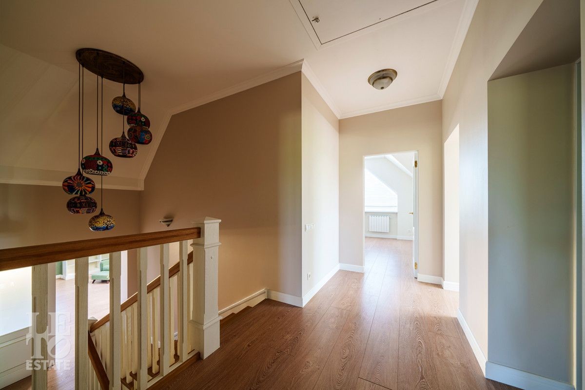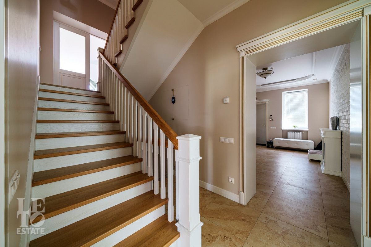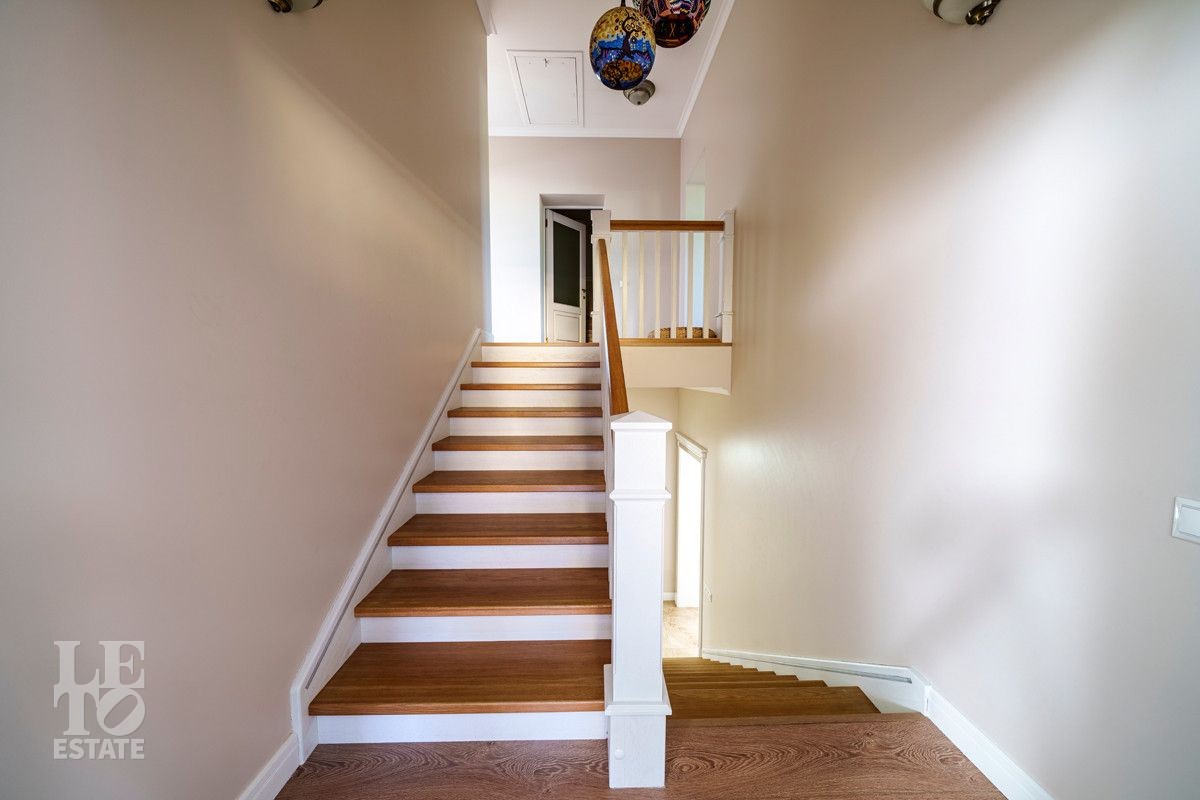 Внутренняя отделка выполнена с использованием только качественных и дорогостоящих материалов. Полы выложены декоративной плиткой и паркетной доской из массива дерева. Кухня выполнена на заказ и оснащена всей необходимой встроенной техникой ведущих мировых производителей (Zigmund & Shtain, NEFF, Liebherr). В дом заведены и разведены теплые полы от фирмы Rehau, оснащены системой «аквастоп». Сделаны выводы под систему кондиционирования. Под окнами установлены конвекторы. Лестница выполнена из натурального дерева (дуб).