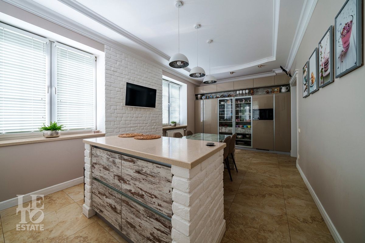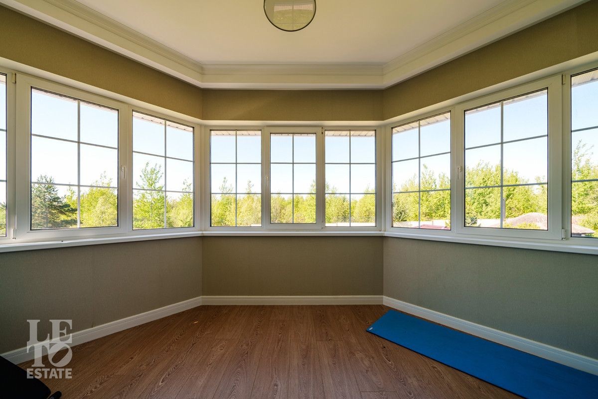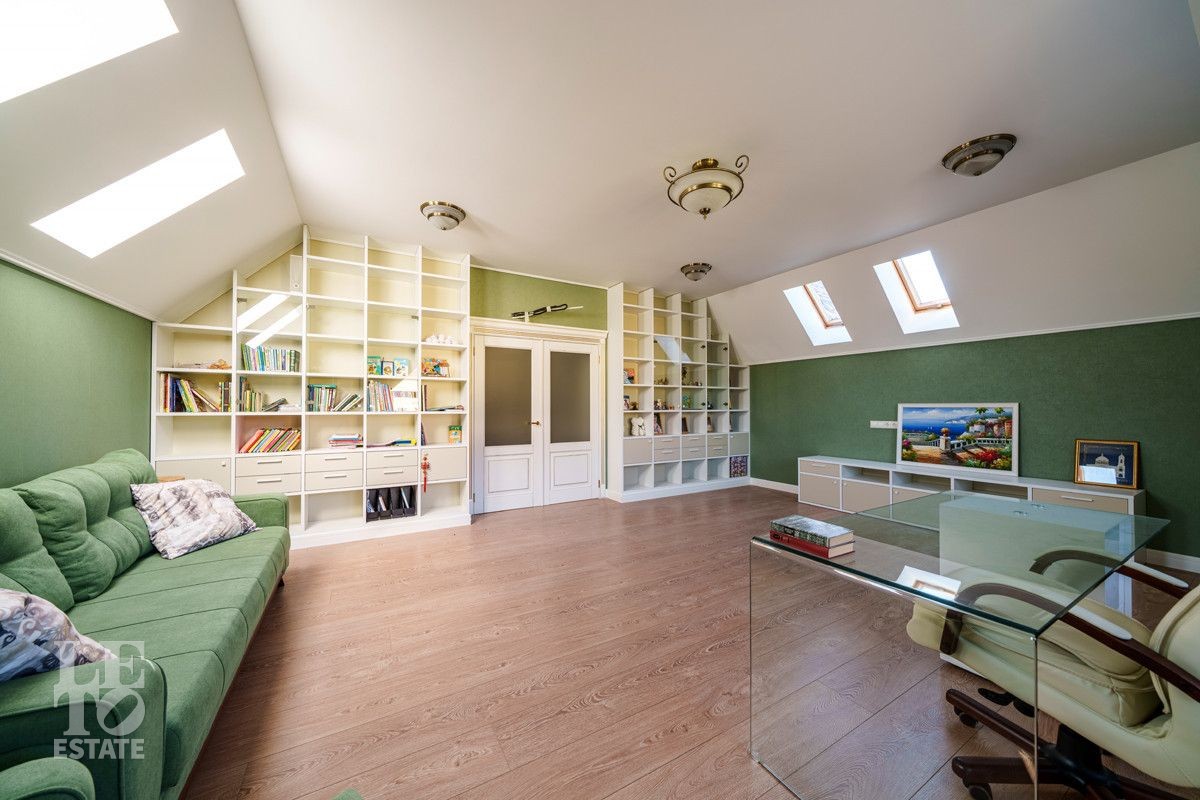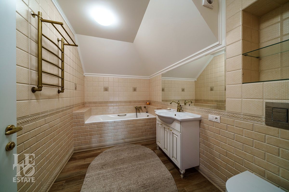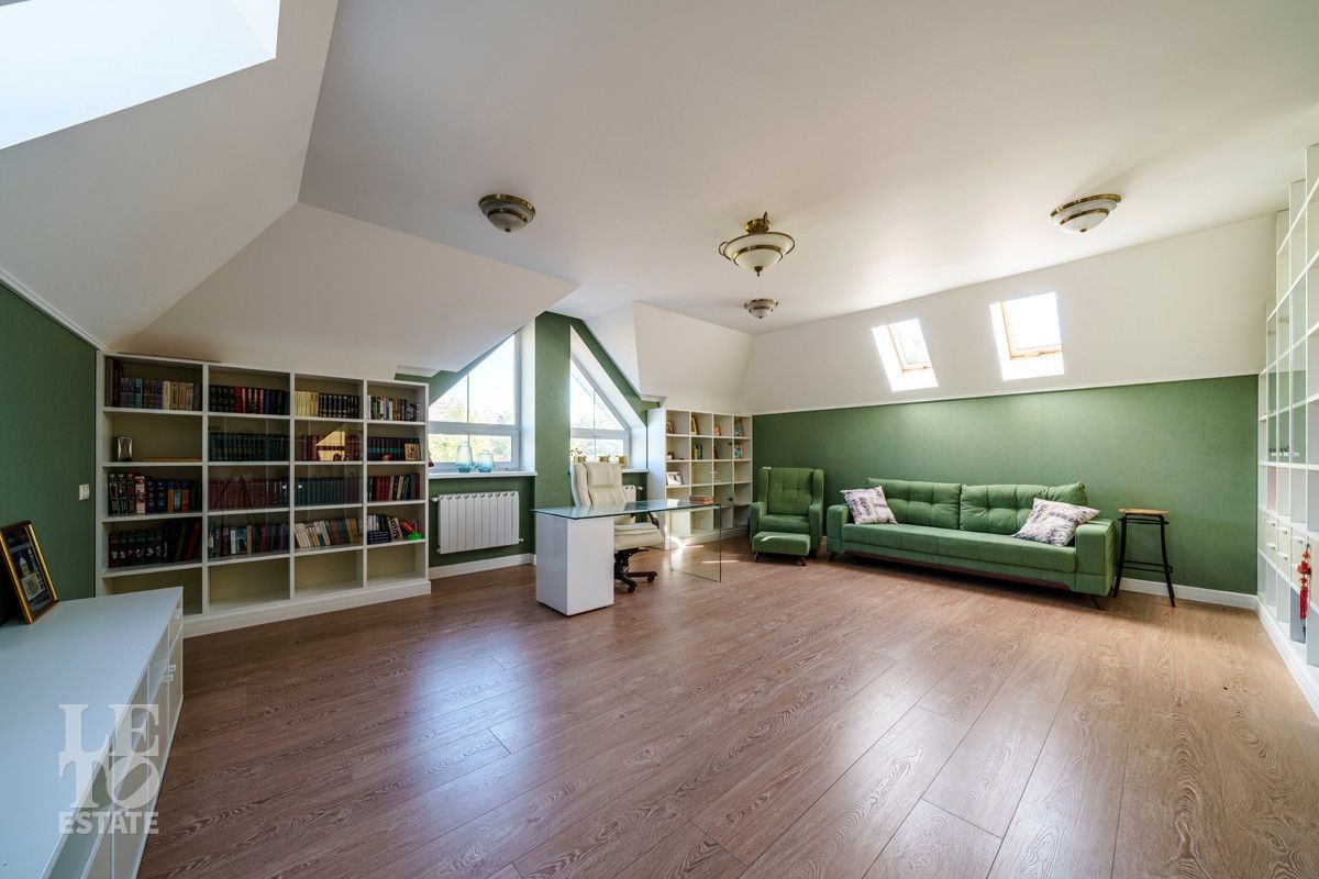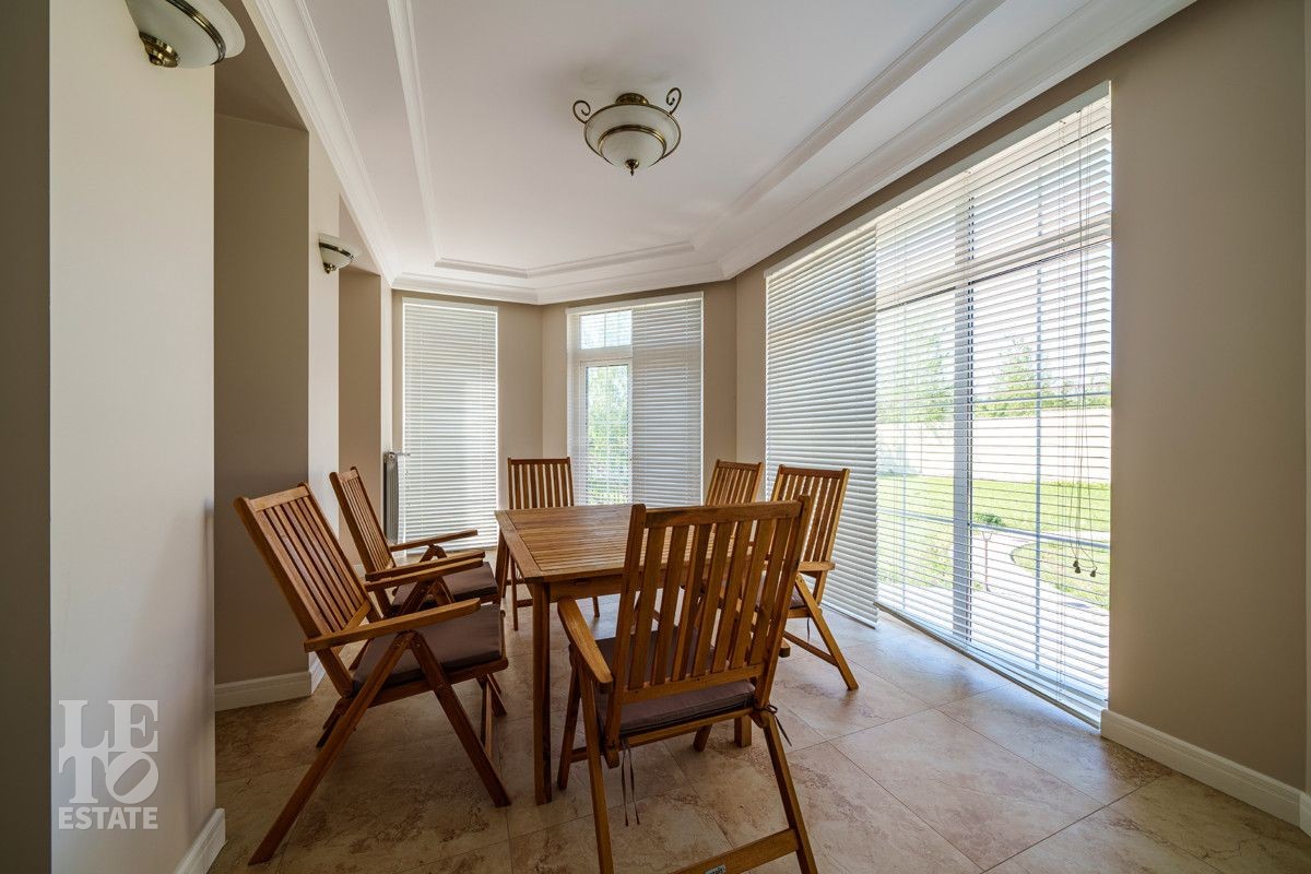 Внутренняя отделка выполнена с использованием только качественных и дорогостоящих материалов. Полы выложены декоративной плиткой и паркетной доской из массива дерева. Кухня выполнена на заказ и оснащена всей необходимой встроенной техникой ведущих мировых производителей (Zigmund & Shtain, NEFF, Liebherr). В дом заведены и разведены теплые полы от фирмы Rehau, оснащены системой «аквастоп». Сделаны выводы под систему кондиционирования. Под окнами установлены конвекторы. Лестница выполнена из натурального дерева (дуб).