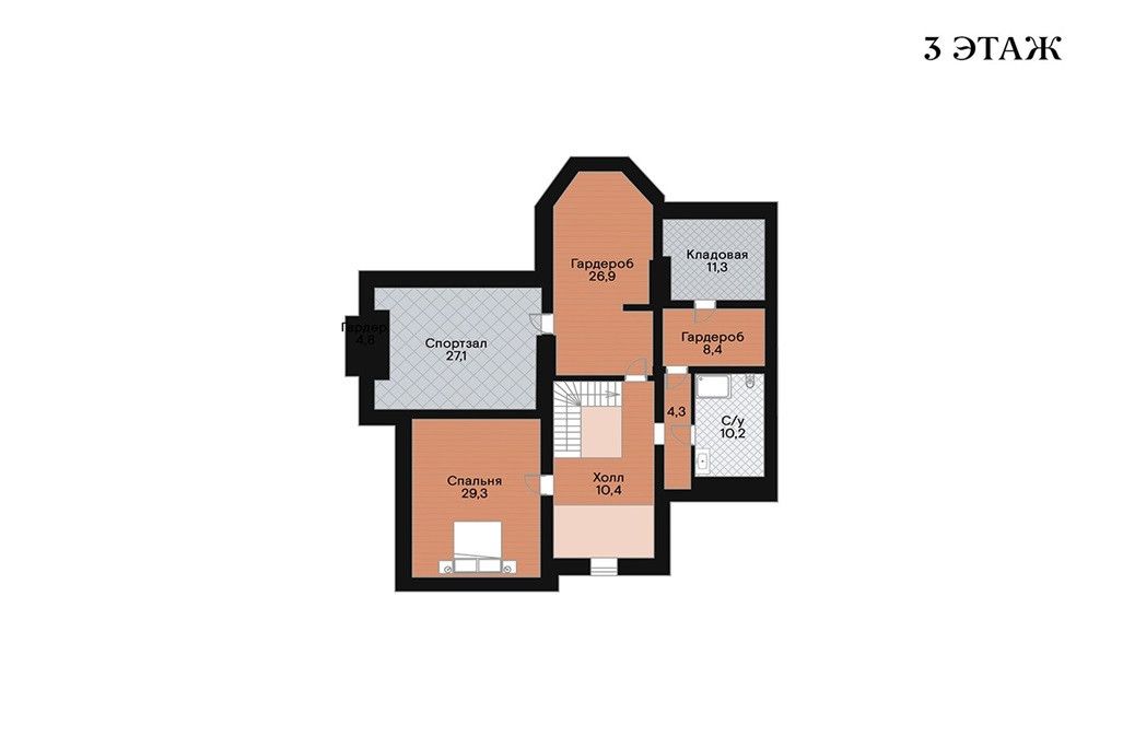 Третий этаж: две спальни, санузел с душевой, спортзал и игровая.
