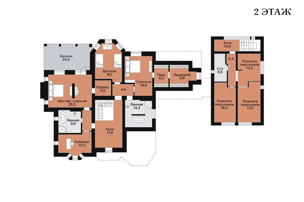 Второй этаж: холл, мастер-спальня с двумя гардеробными, санузлом и выходом на открытую террасу с джакузи и 2 шезлонгами, три спальни, гардеробная, санузел;
