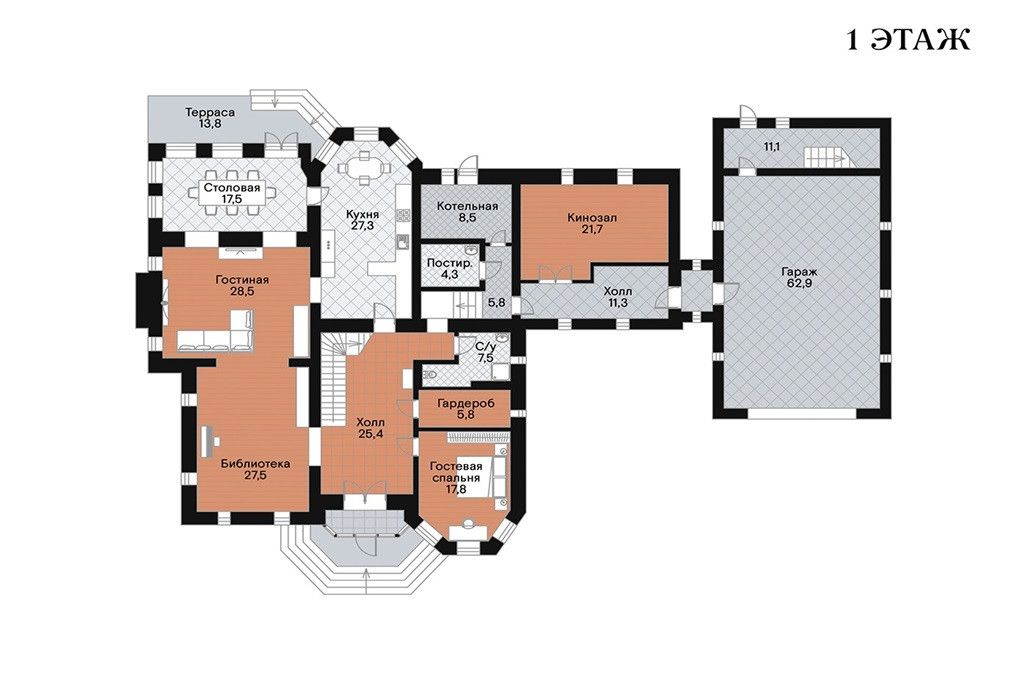 Первый этаж: холл, гардеробная, кухня, столовая, гостиная и каминная зона, спальня, санузел, постирочная, котельная, кинозал, гараж для 3-х автомобилей;