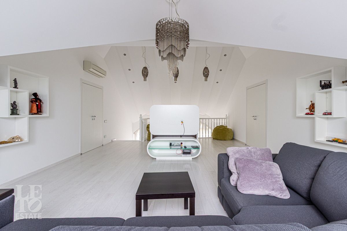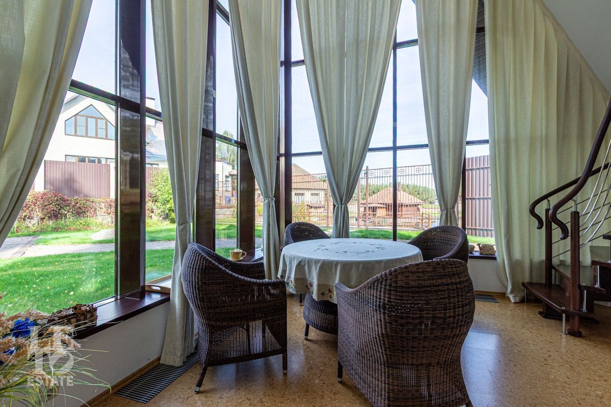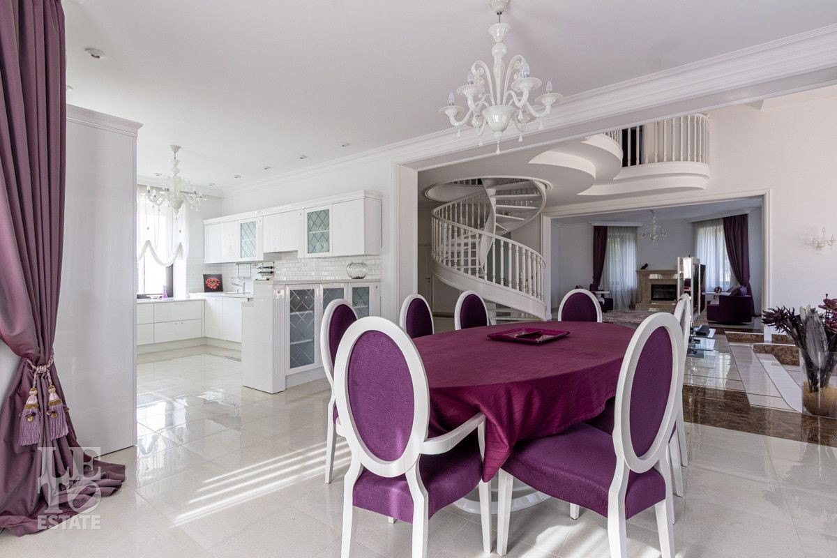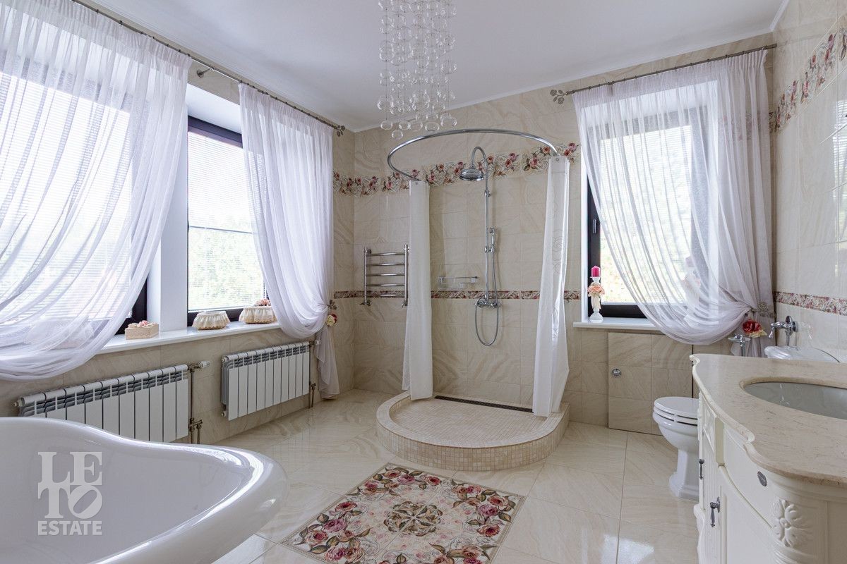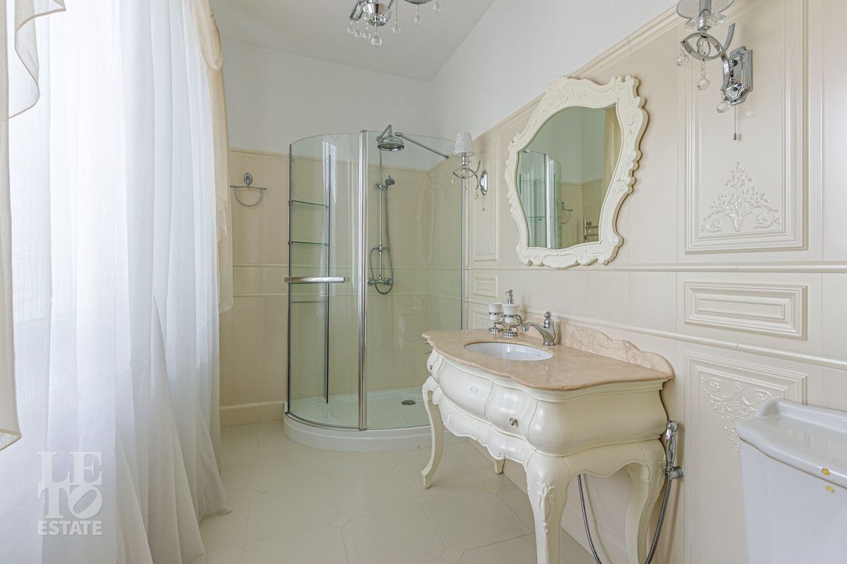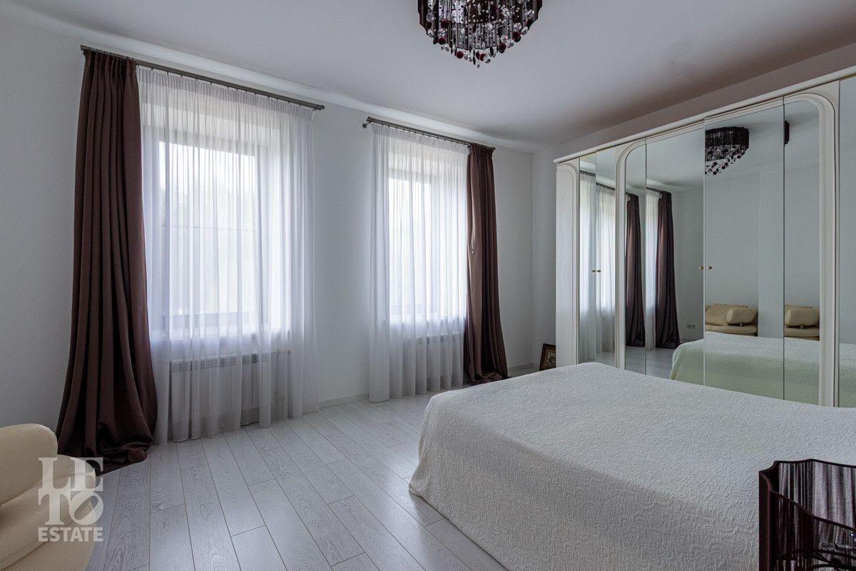 Основной дом (568.4 кв.м.) — это просторное и светлое родовое гнездо для большой семьи. Он выполнен из кирпича в классическом стиле с панорамным остеклением, наполняющим интерьеры светом, и оформлен в элегантной светлой палитре. Ключевые фишки: второй свет в гостиной, создающий ощущение простора, теплые полы для комфорта в любое время года. Сюда заведены все коммуникации (газ, электричество, септик, скважина), что гарантирует автономность и отсутствие хлопот.