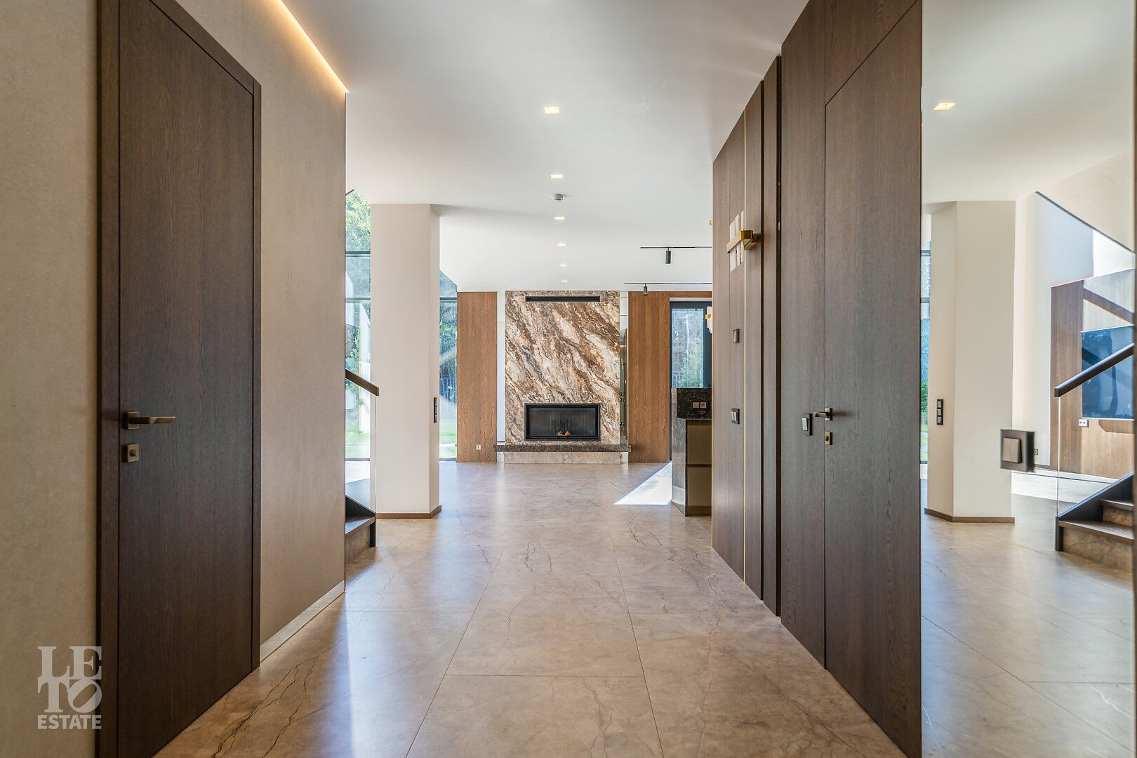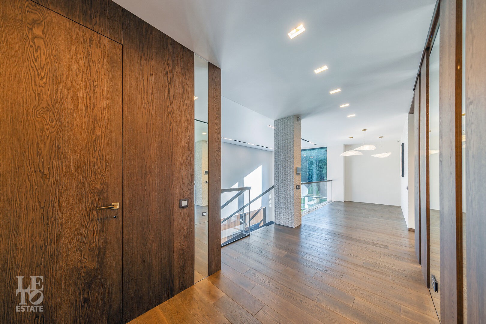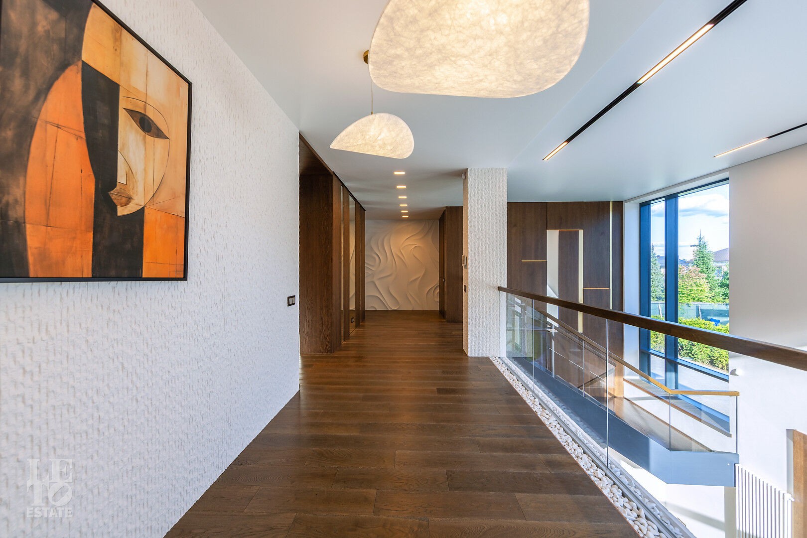 Второй этаж: холл, кабинет, мастер спальня со своим с\у и гардеробной, спальня с с\у и гардеробной, спальня с с\у, квартира для персонала с отдельным входом из гаража, эксплуатируемая кровля над бассейном.
