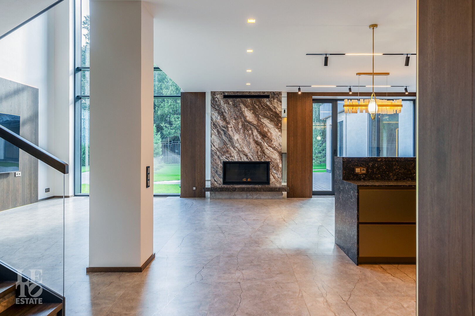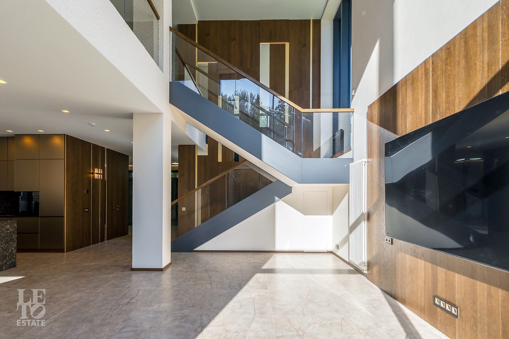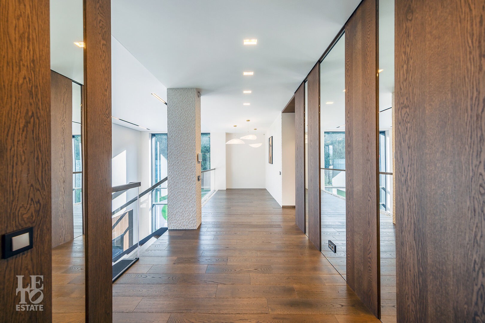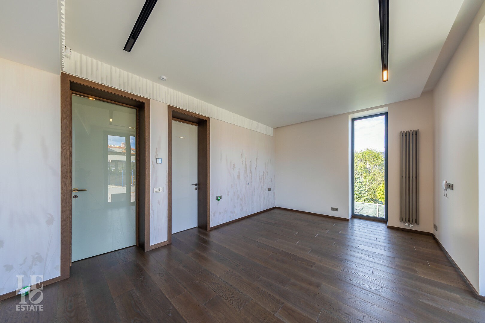 Второй этаж: холл, кабинет, мастер спальня со своим с\у и гардеробной, спальня с с\у и гардеробной, спальня с с\у, квартира для персонала с отдельным входом из гаража, эксплуатируемая кровля над бассейном.
