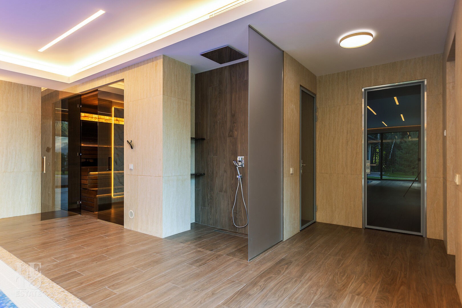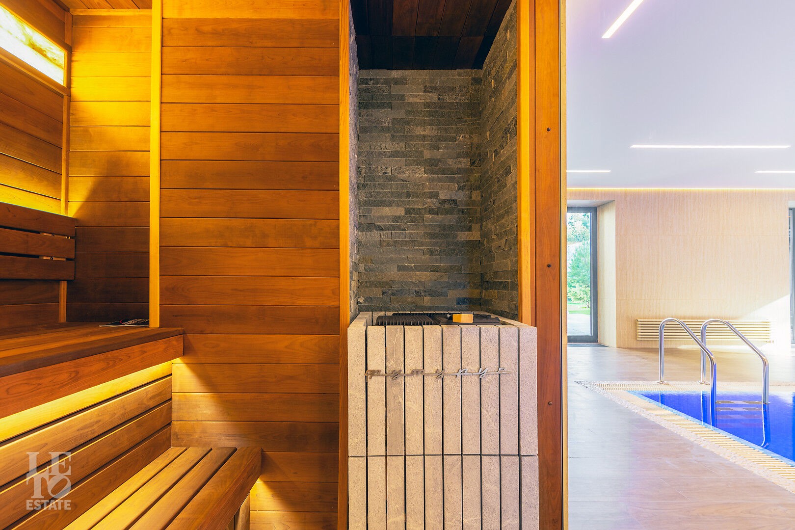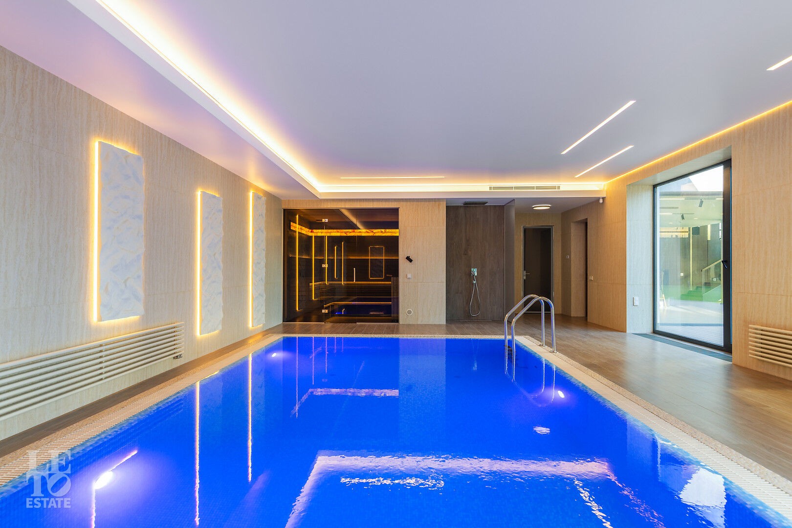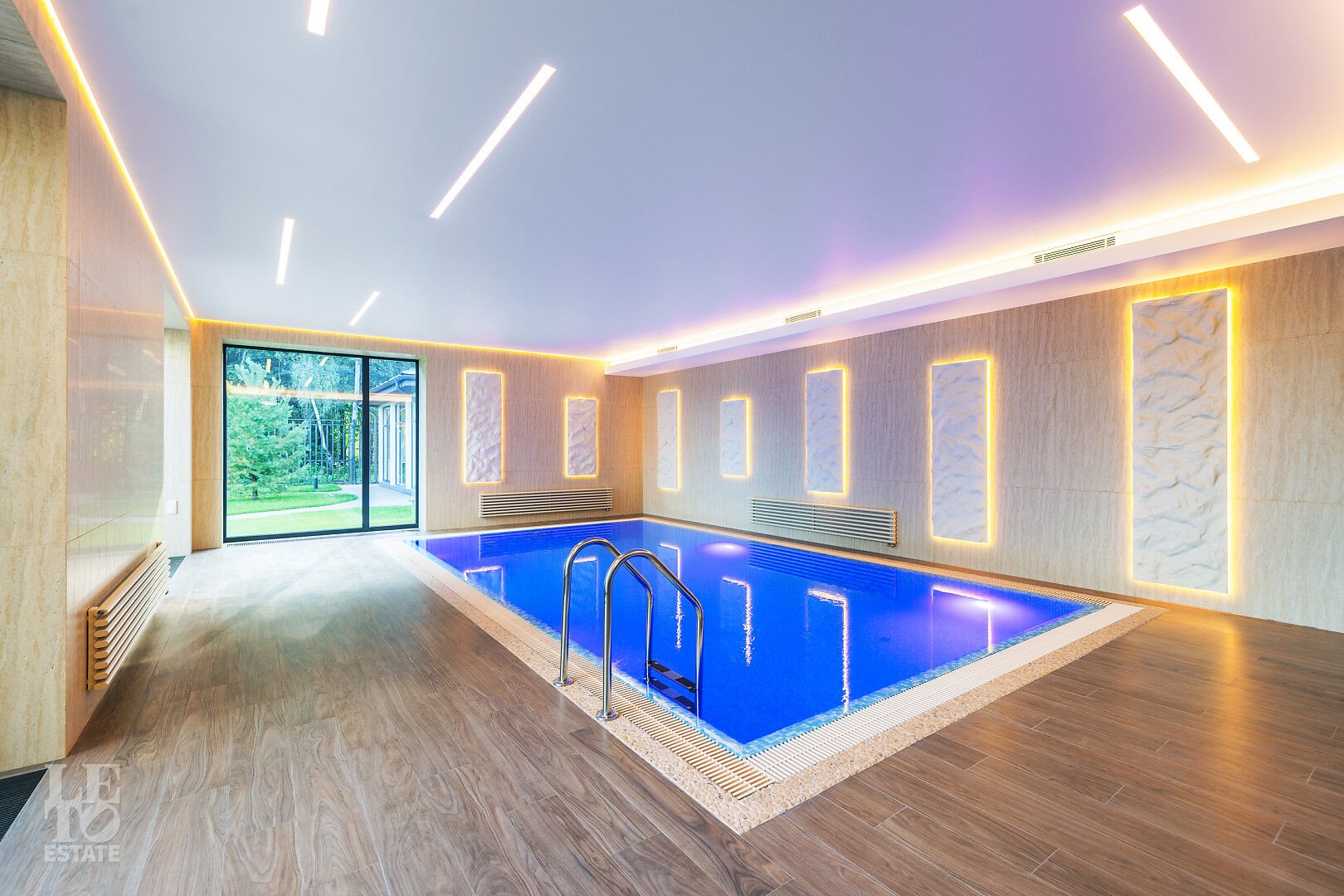 В доме имеется спа-зона, включающая в себя сауну и бассейн 7*4 с противотоком и подсветкой. Бассейн оснащен инновационной системой очистки NECON. Кристально чистая вода без хлора и химических запахов обеспечивает максимальную безопасность для всей семьи, а технология ионов