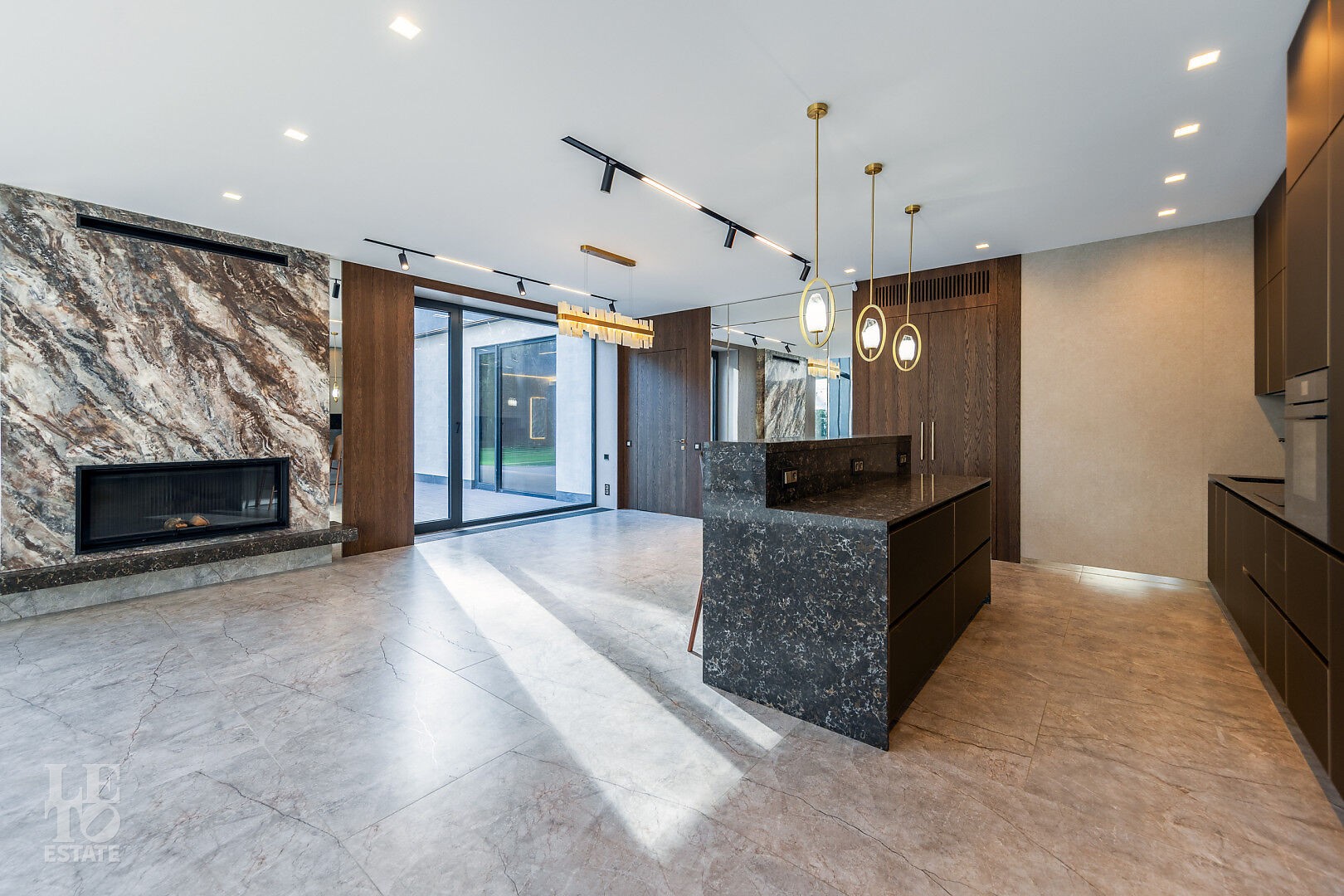 Первый этаж: просторна зона холла со встроенной гардеробной, с\у с душевой, гостевая спальня, кухня-столовая-гостиная, спа зона: бассейн, сауна, с\у, постирочная, гараж, бойлерная, кладовая.