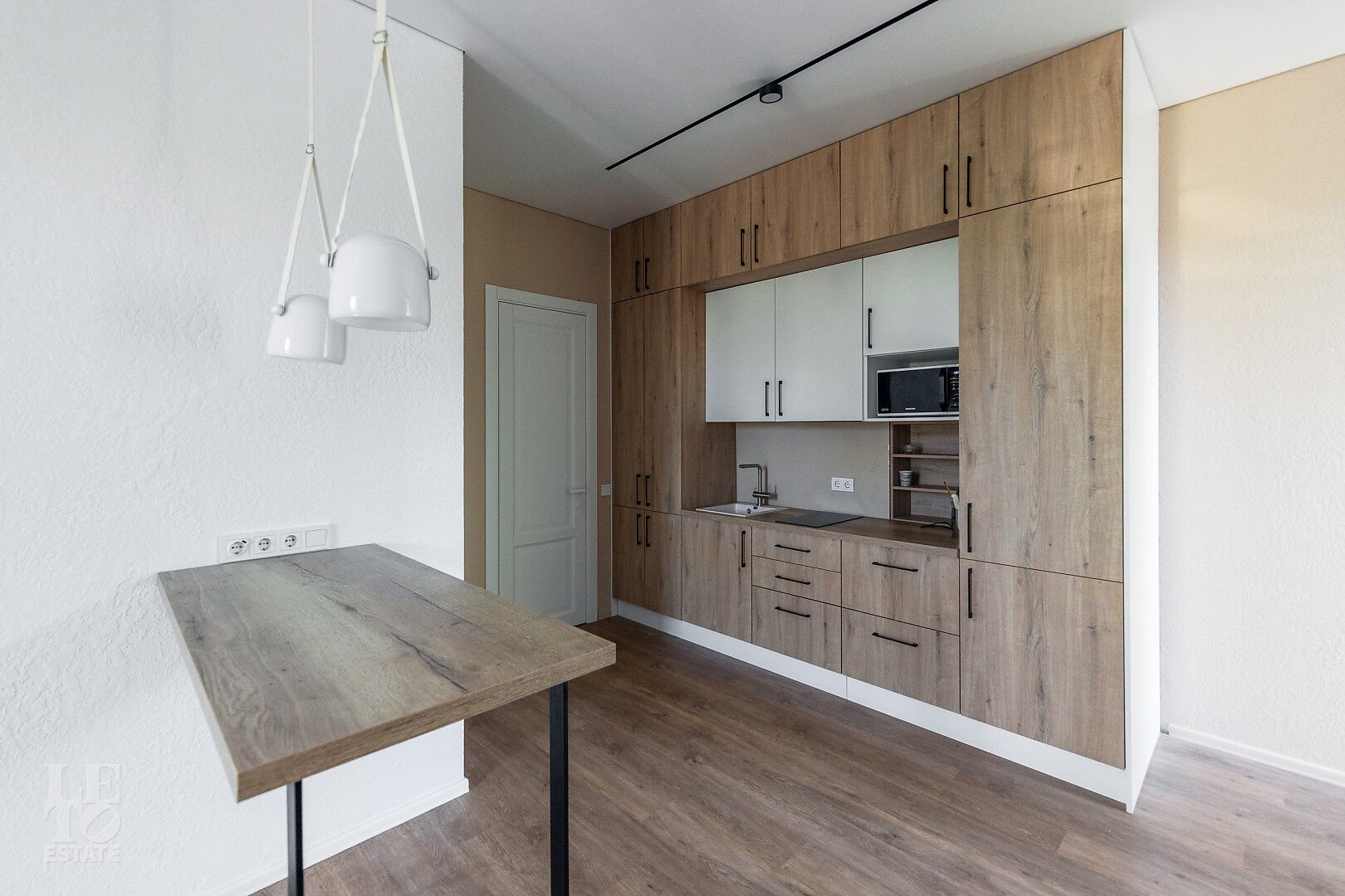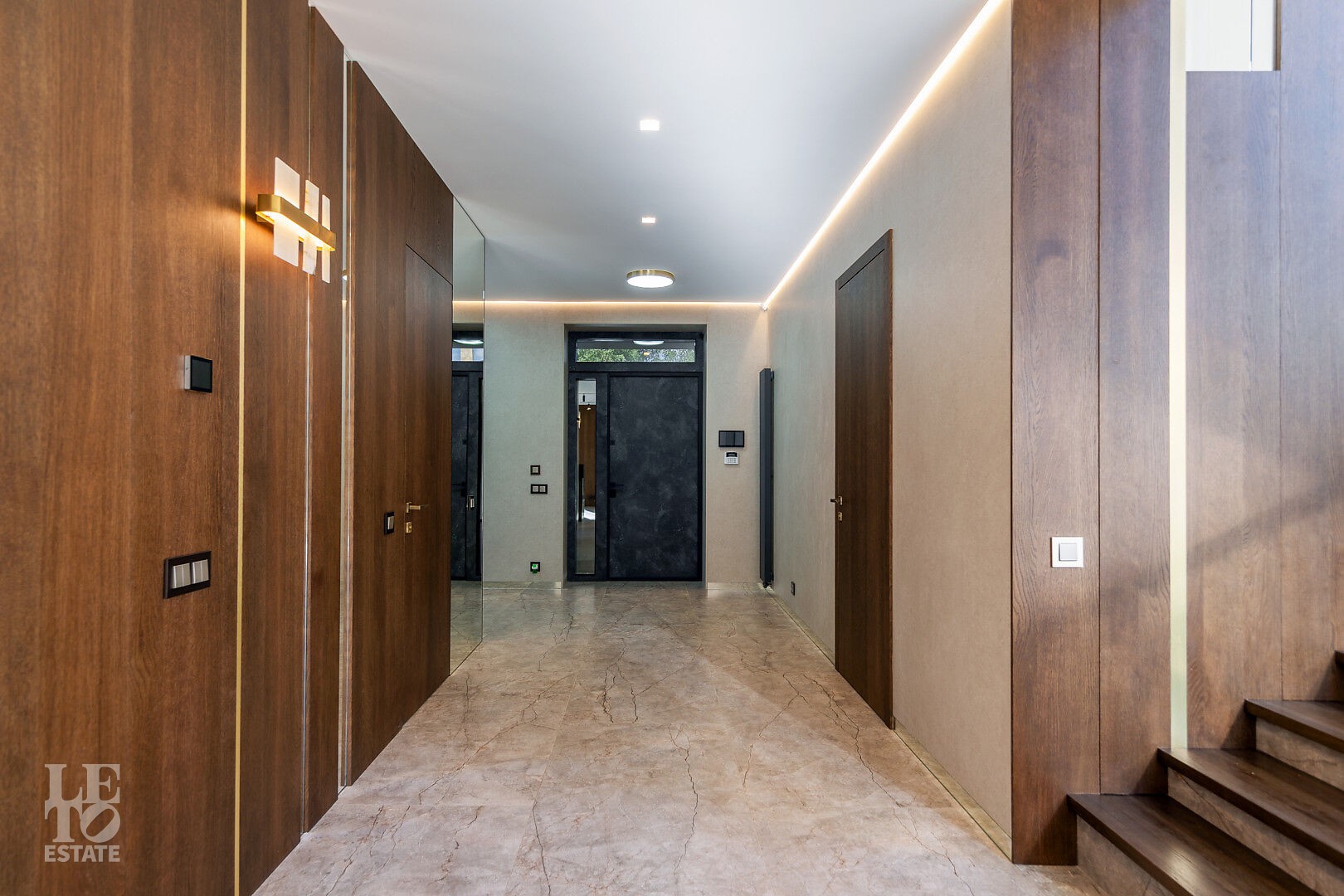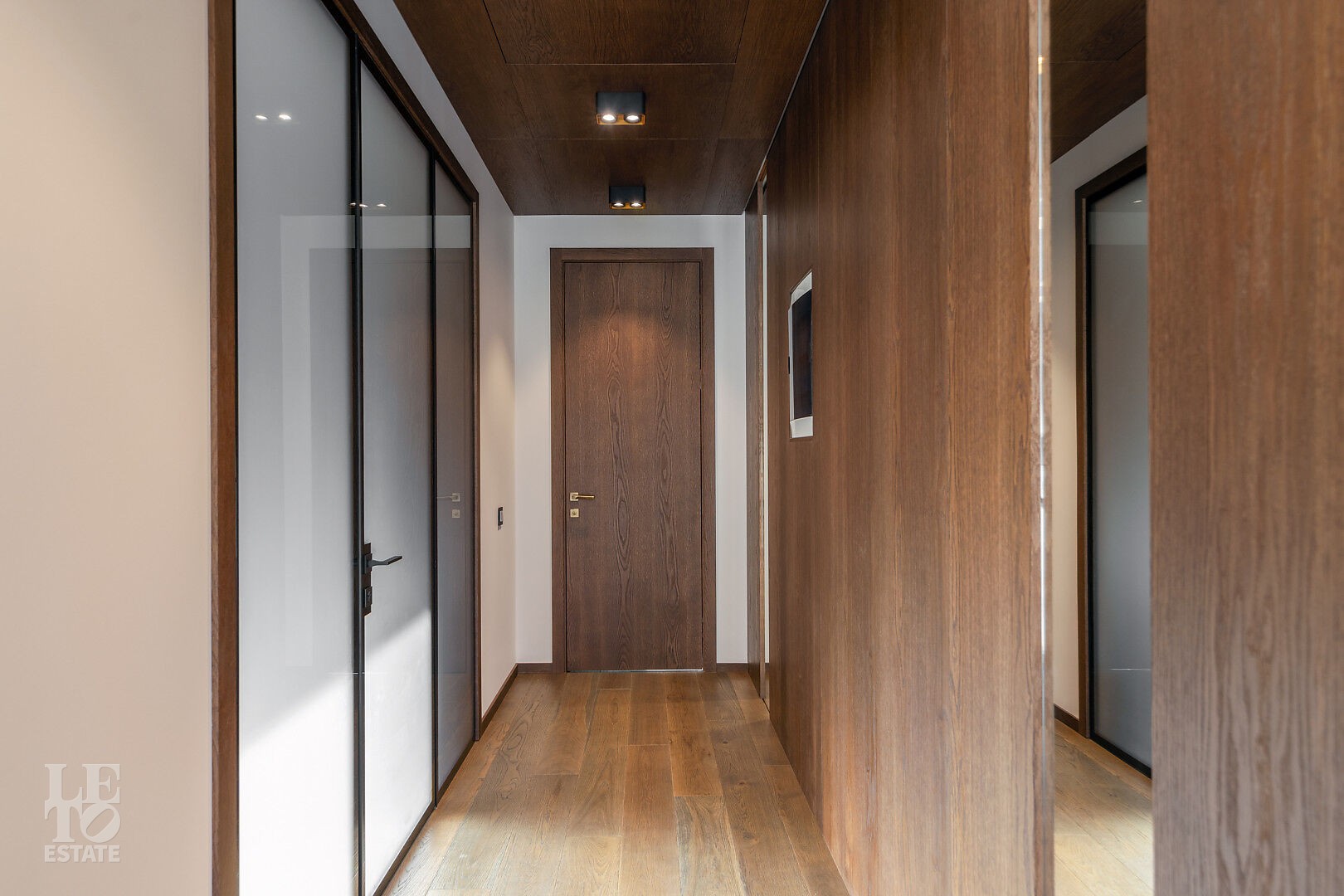 Внутренняя отделка стен выполнена панелями из натурального шпона, пол – натуральный дуб.
