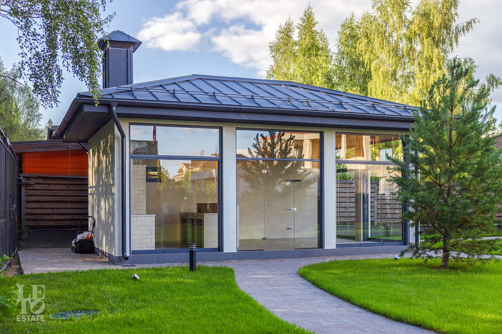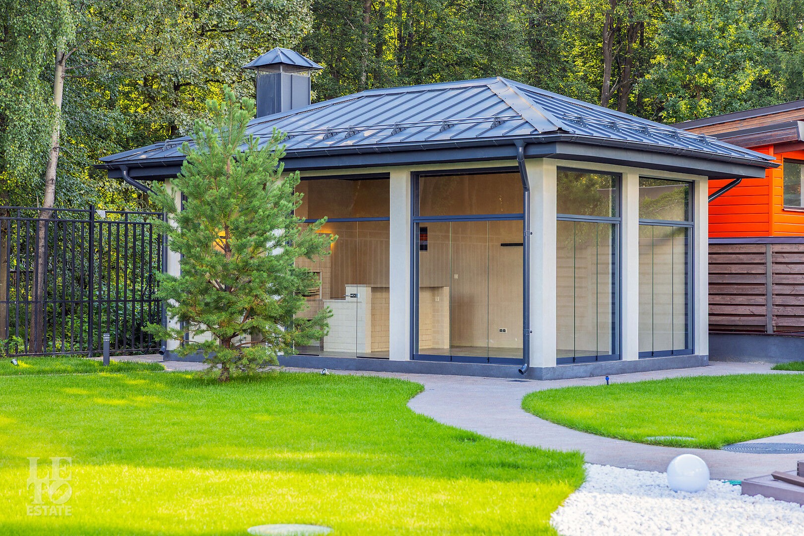 Помимо гаража перед домом организована большая зона парковки. Также на участке расположена остекленная беседка, которая полностью оборудована мангальной зоной.