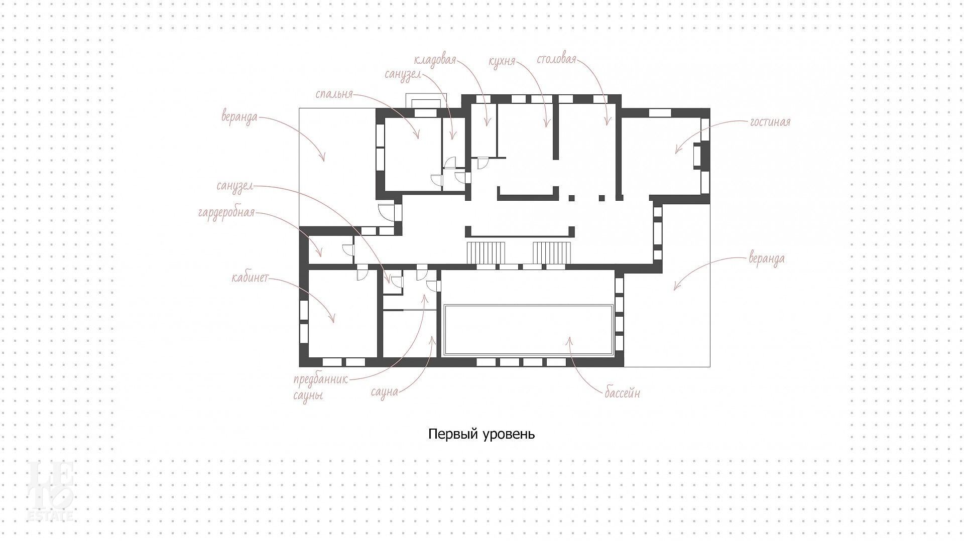 Первый этаж: прихожая, холл, гостиная, столовая, кухня с кладовой, спальня с с/у, кабинет, гардеробная, спа-зона с бассейном, сауной и с/у, веранда.